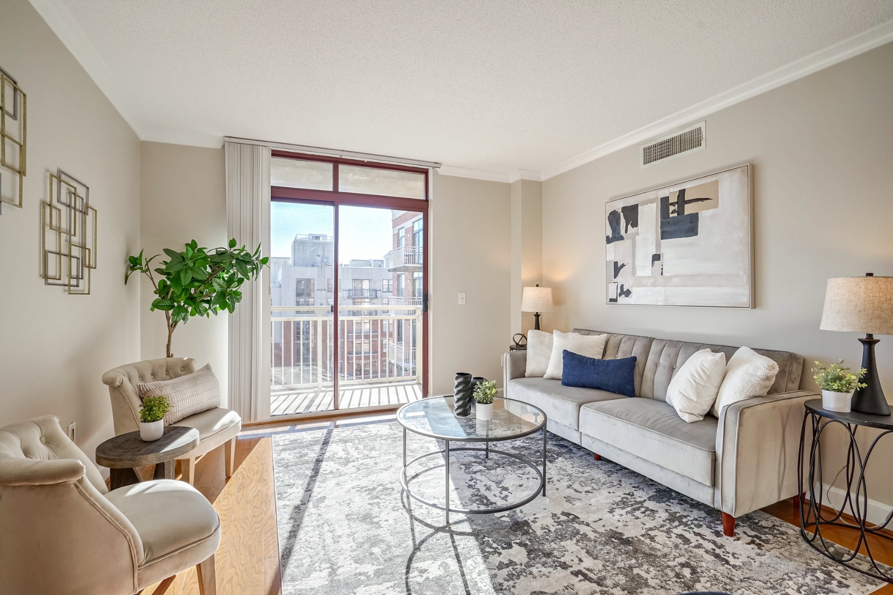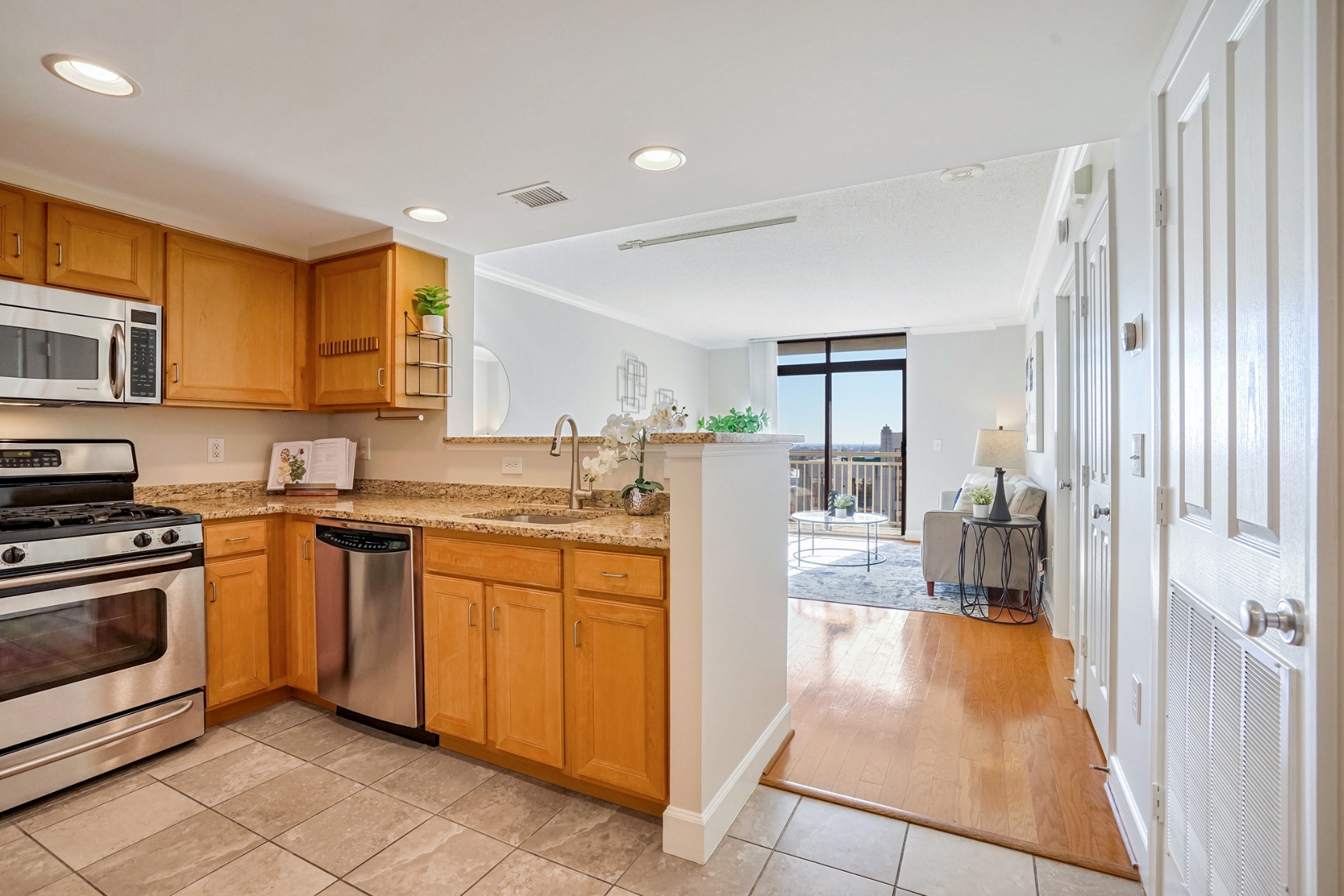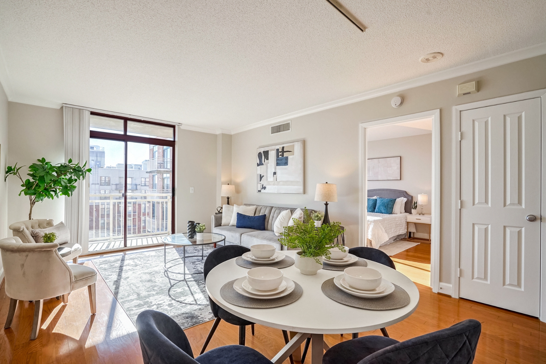 The spacious living room has hardwood floors, a dining area, and sliding glass doors that open to a southern-facing balcony, overlooking the pool with panoramic views of the DC, Arlington, and Alexandria skyline.