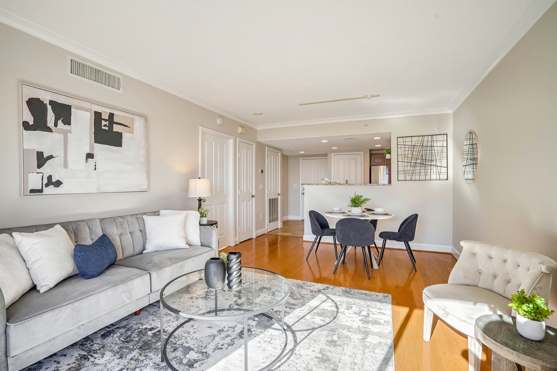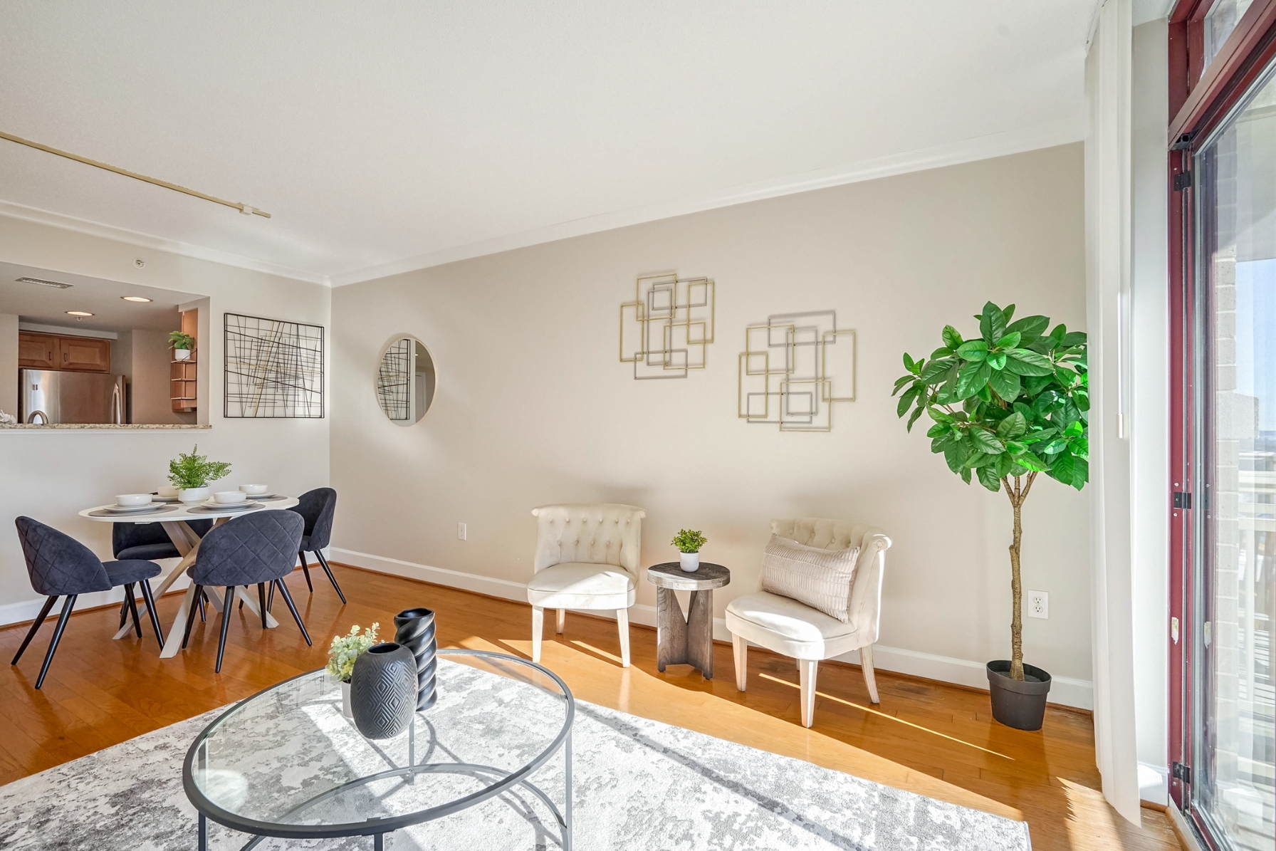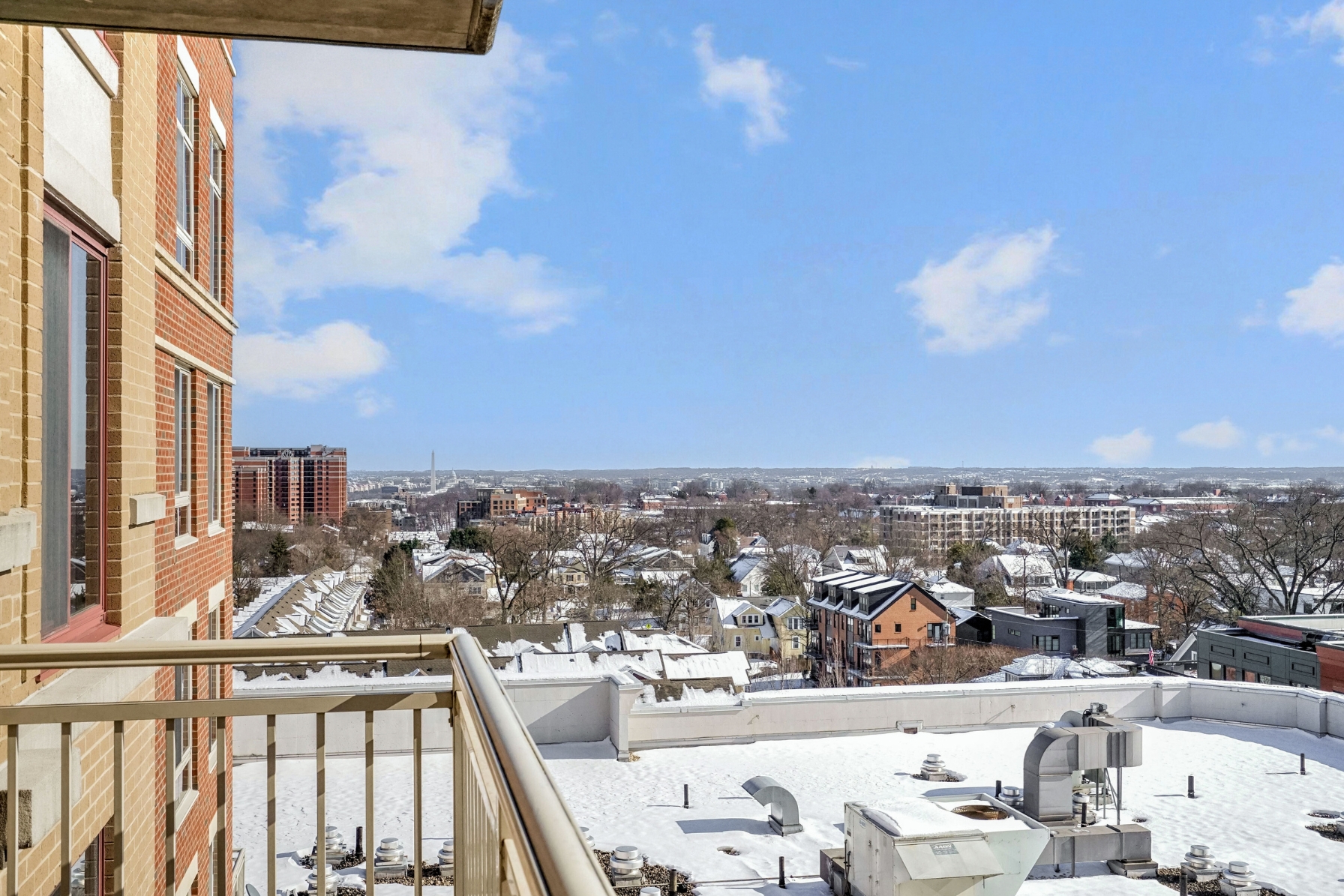 The spacious living room has hardwood floors, a dining area, and sliding glass doors that open to a southern-facing balcony, overlooking the pool with panoramic views of the DC, Arlington, and Alexandria skyline.