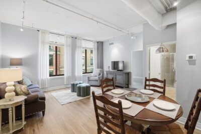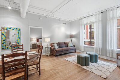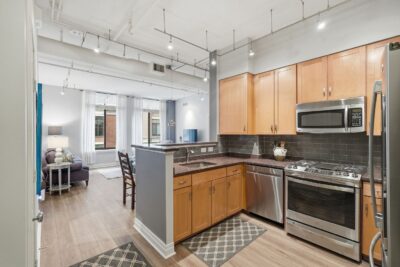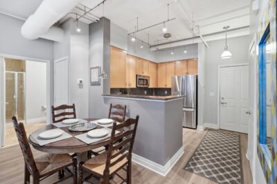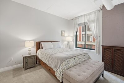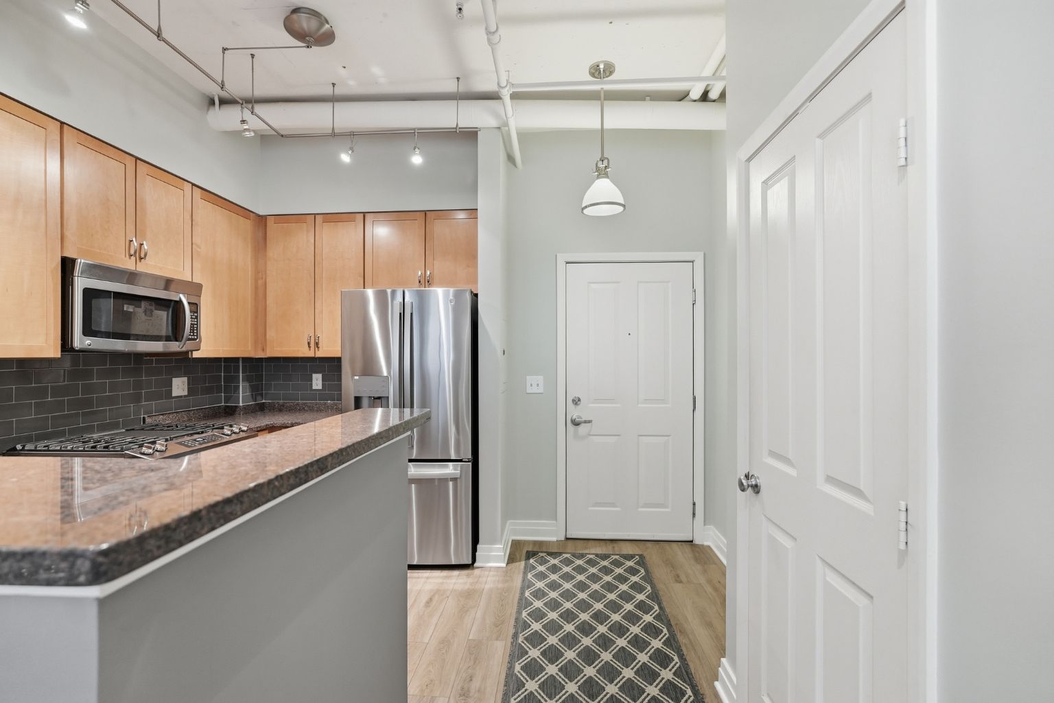 This condo immediately stands out with soaring 11-foot vaulted ceilings, exposed ductwork, and an industrial-chic aesthetic that blends with modern updates. Luxury vinyl plank flooring runs throughout the main living space, complemented by a kitchen with granite countertops, stainless steel appliances and a breakfast bar that opens to the large living space.