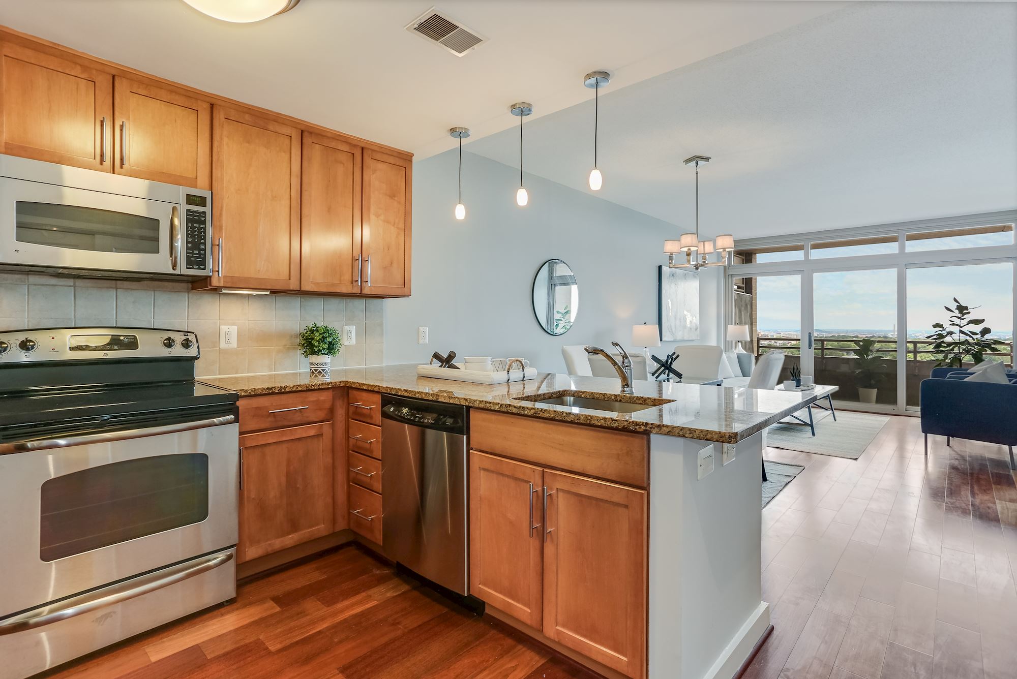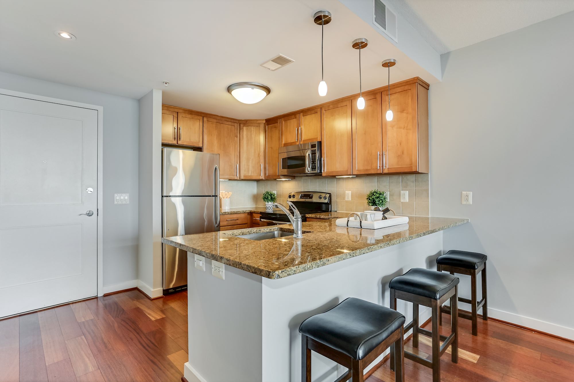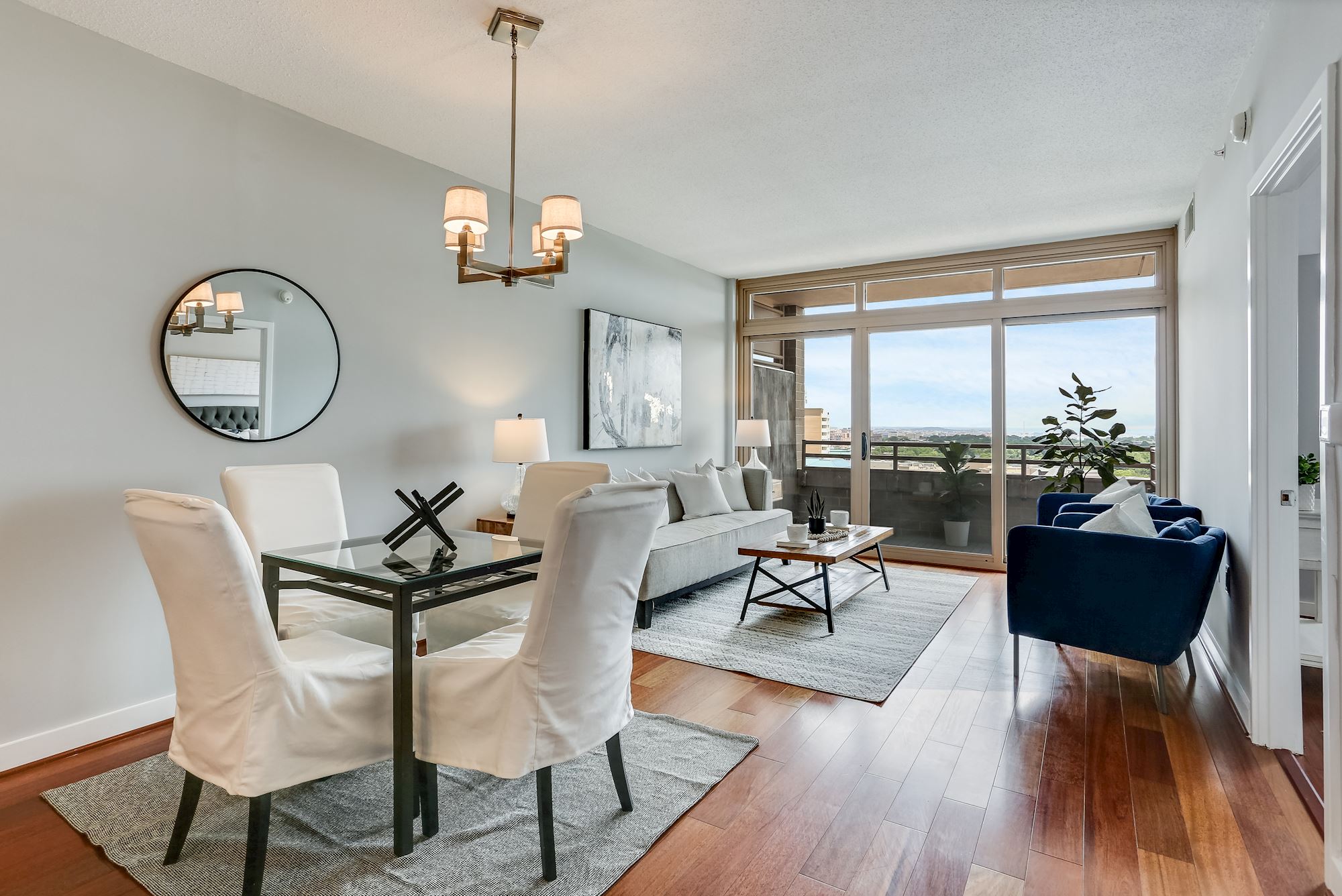 Enjoy panoramic Washington DC views from this 17th-floor stunner at the Residences at Liberty Center. The moment you walk into this condo, you realize it’s special. With eastern exposure, you can wake up to the sunrise and enjoy an abundance of natural light for most of the day. The kitchen has granite counters, stainless steel appliances, pendant lighting, and a breakfast bar that opens to the main living area. The living room has beautiful hardwood floors, dedicated dining space and sliding glass doors that open to the 17th floor open-air balcony with views from Alexandria to Georgetown.