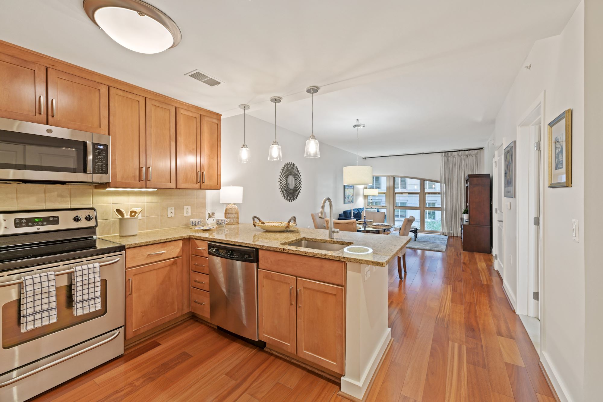 Welcome to unit 305 at Liberty Center! This sought-after Revere Model boasts 712 sq ft of open & spacious living space. Want to know what makes this floor plan more desirable? It has a nice size walk-in closet in the bedroom and a second closet. The en suite bath also opens up to the main living space so guests do not need to enter your bedroom. The kitchen features beautiful maple cabinets, soft close drawers, tile backsplash, updated stainless steel appliances, granite counters, updated pendant lighting & a breakfast bar opening to the main living space. The entire unit was just freshly painted a bright modern tone, beautiful hardwood floors span the main space, & the bedroom carpet was recently replaced. Enjoy soaking in the sun from the floor to ceiling wall of windows with courtyard facing views in your living space. This unit includes a rare storage unit, 1 garage parking space, & an updated in-unit washer/dryer. The Residences at Liberty Center is a luxury building with breathtaking rooftop views, a rooftop fitness center, an outdoor rooftop pool, a community room, and a 24-hour concierge. Located in the heart of Ballston, this Arlington condo is just steps to the Ballston Quarter with dining, shops, nightlife, and everything we love about Arlington.