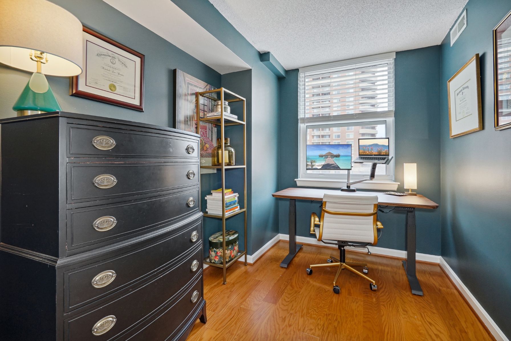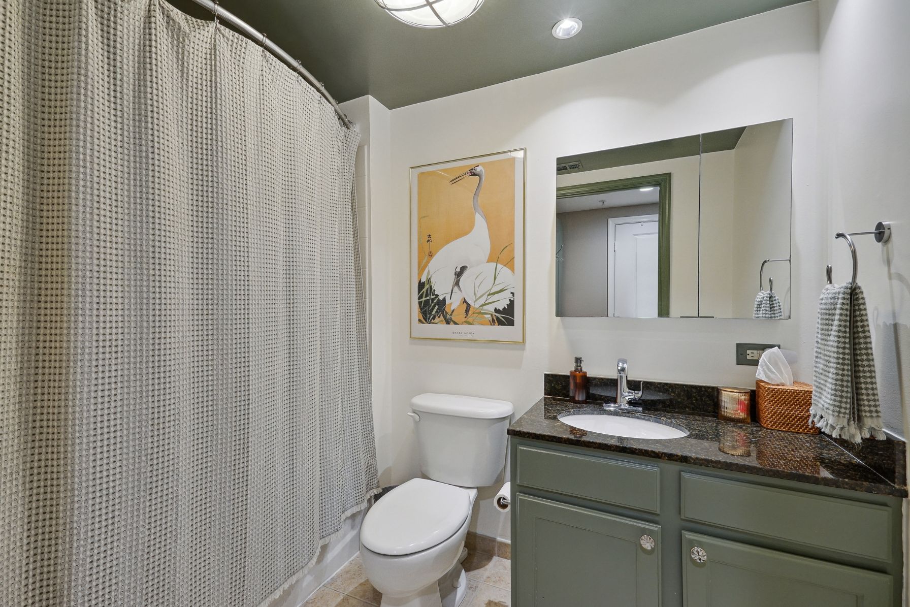 The second bedroom/home office has custom paint and is located just outside of the owner’s suite. The updated bathroom has a granite counter vanity painted green to match the ceiling!