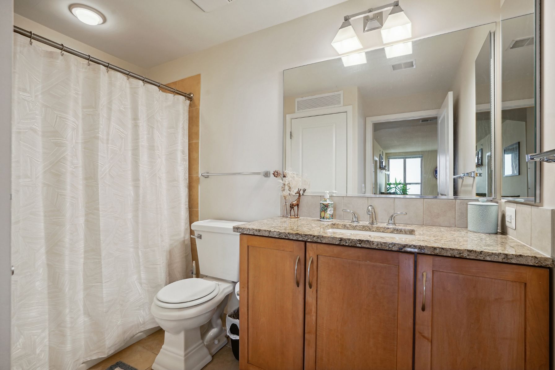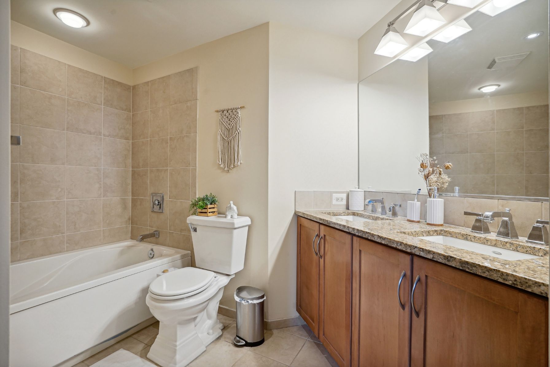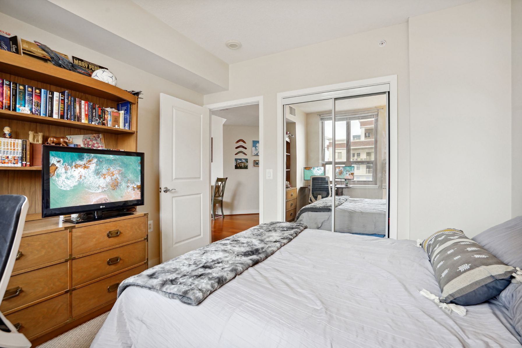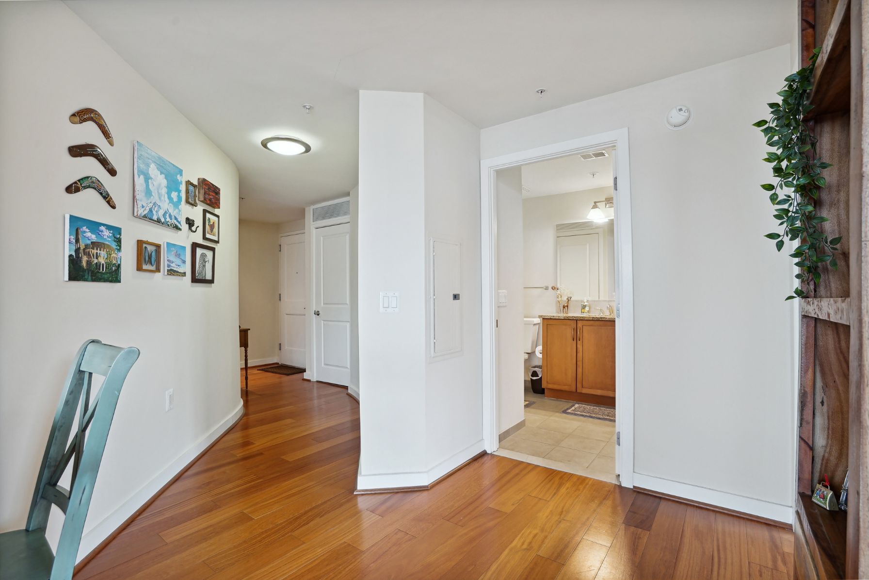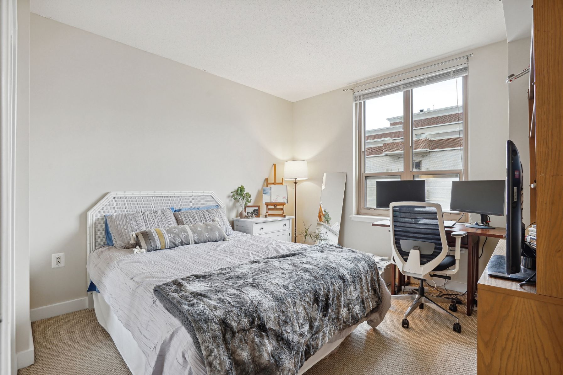 The owner’s suite also has DC views, a walk-in closet with a built-in closet system, a private bathroom with a double sink vanity, a soaking tub, and a separate shower. The second bedroom and bathroom are located on the opposite side of the living space providing great privacy.