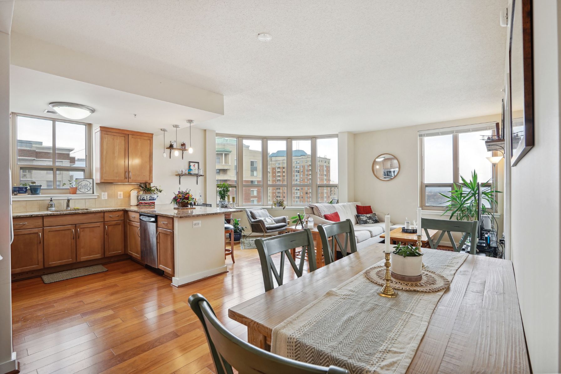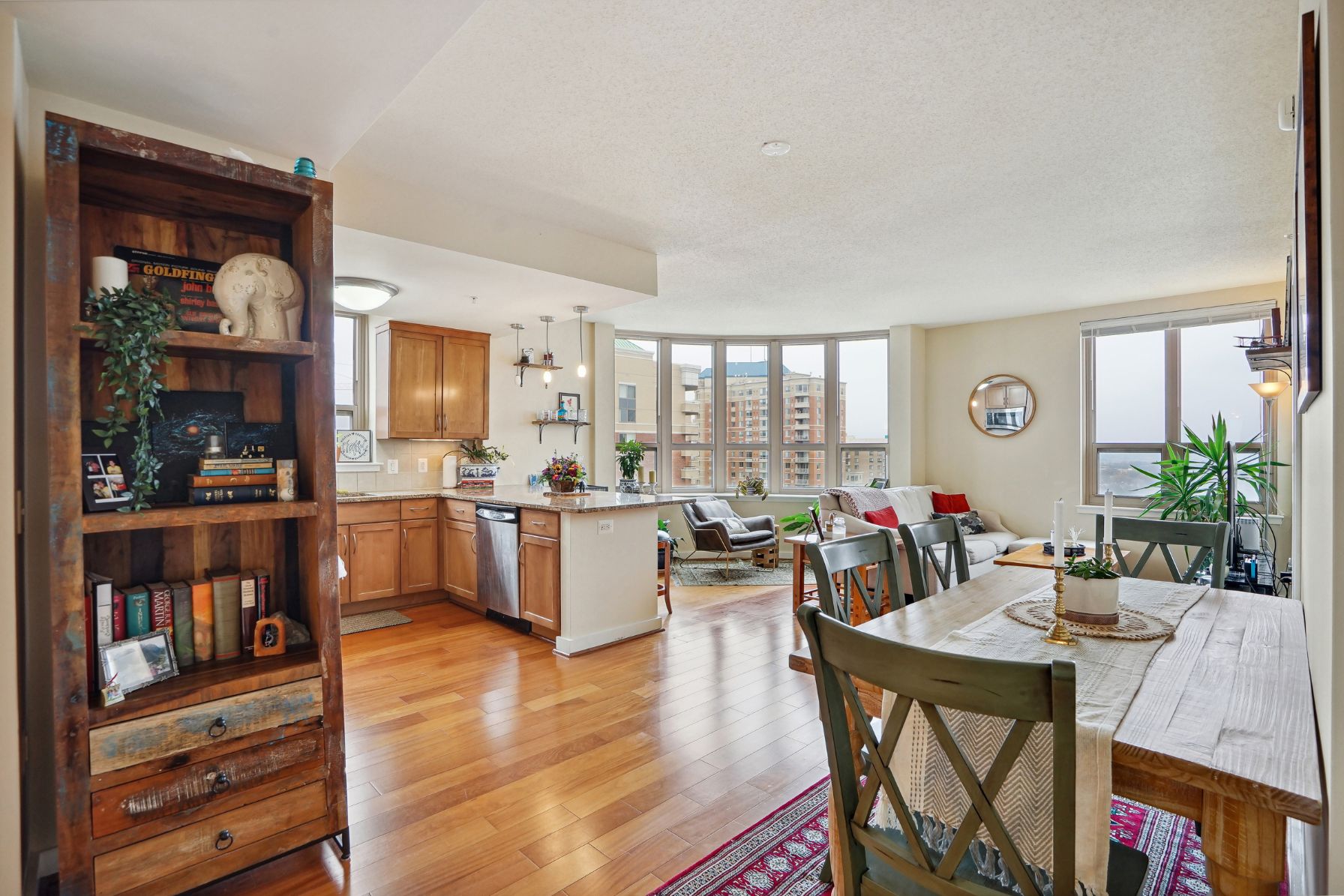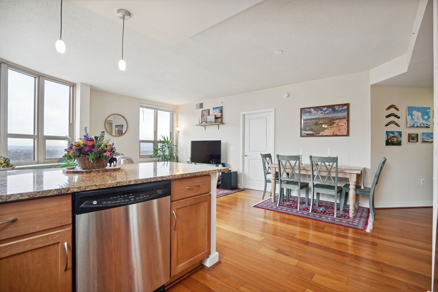 This is your rare chance to own an 18th floor Franklin model with panoramic DC views at the Residences at Liberty Center. Open the door to a curved hall entry that opens to a light, bright, and open floor plan. Hardwood floors expand throughout the living space including the kitchen with granite counters, stainless steel appliances, and a breakfast bar accented by pendant lighting. The unique living/dining room has a curved wall of windows with eastern exposure with monument views.