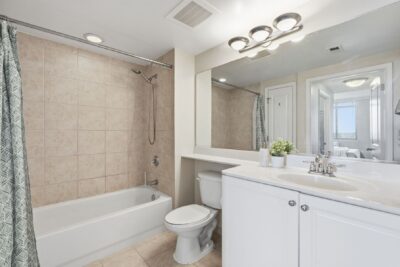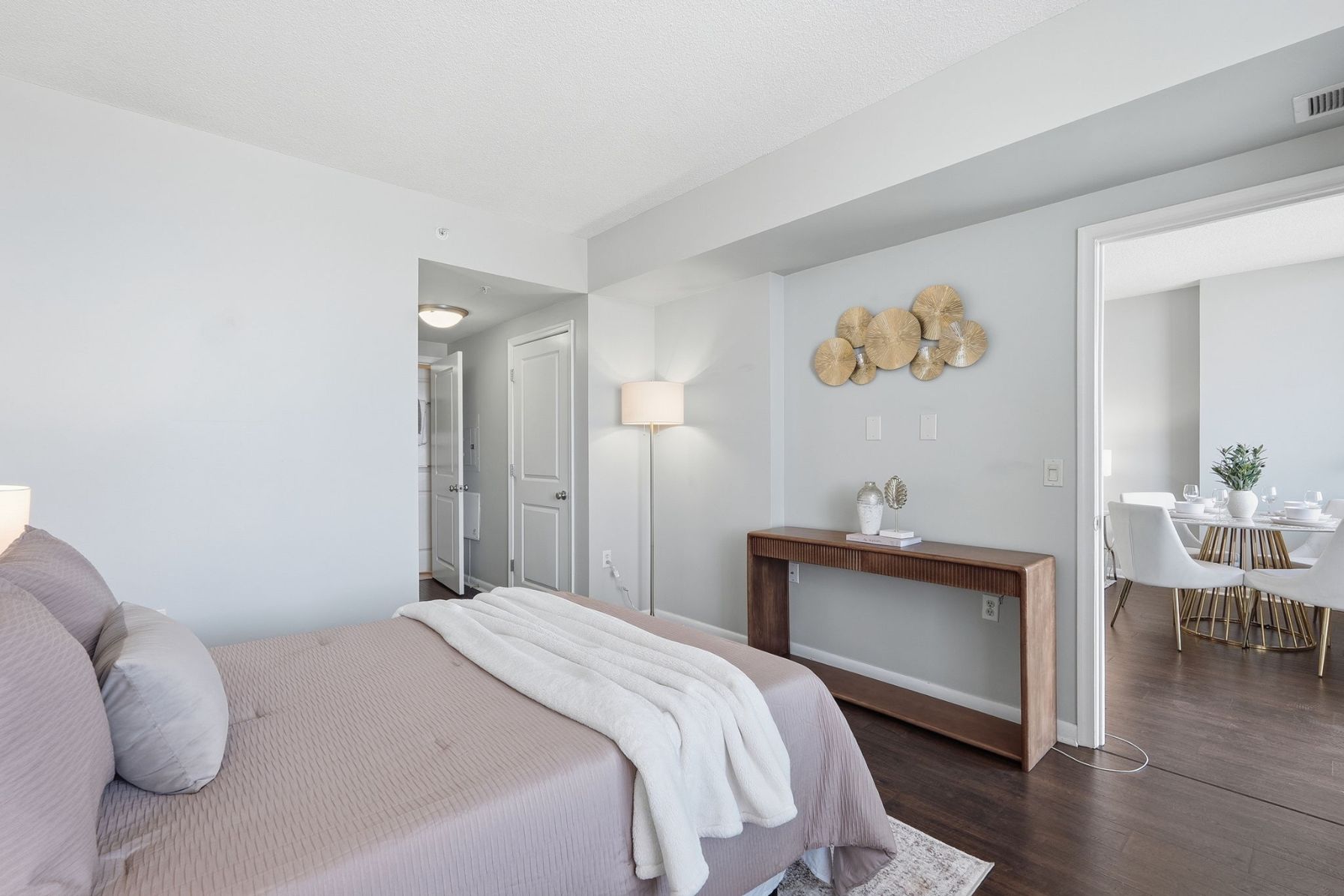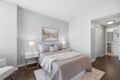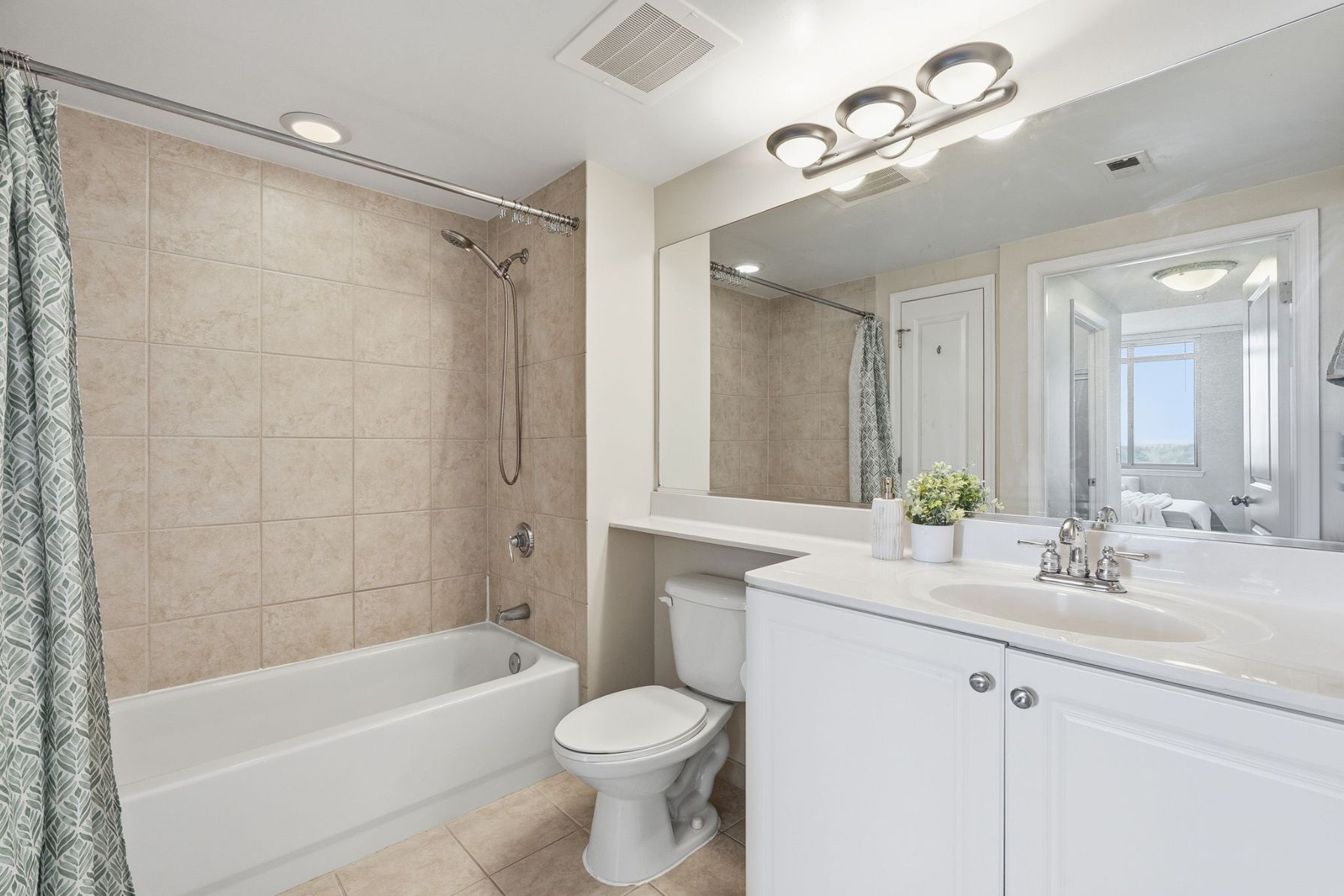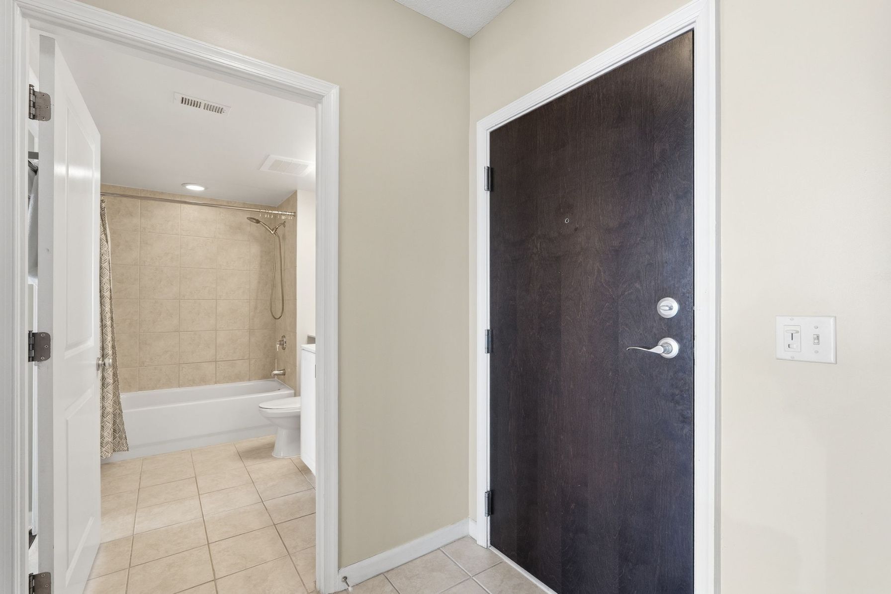 The primary bedroom is spacious and comfortable, featuring a walk-in closet plus an additional closet for exceptional storage. A dual-entry bathroom connects to both the bedroom and main living space and includes a soaking tub/shower combination.