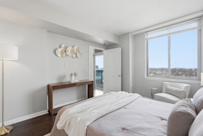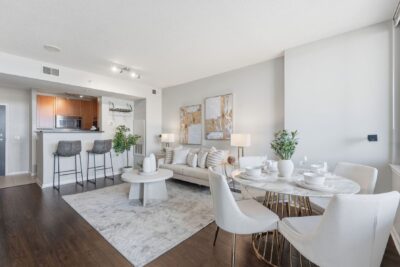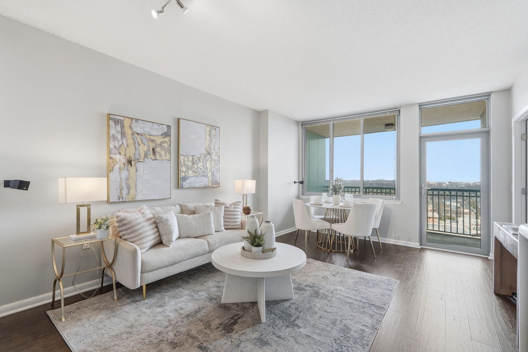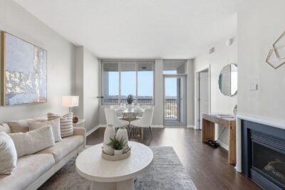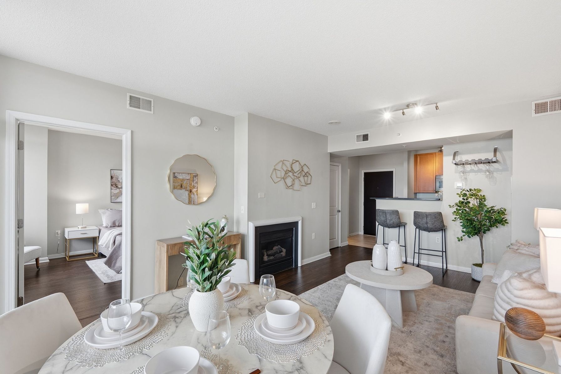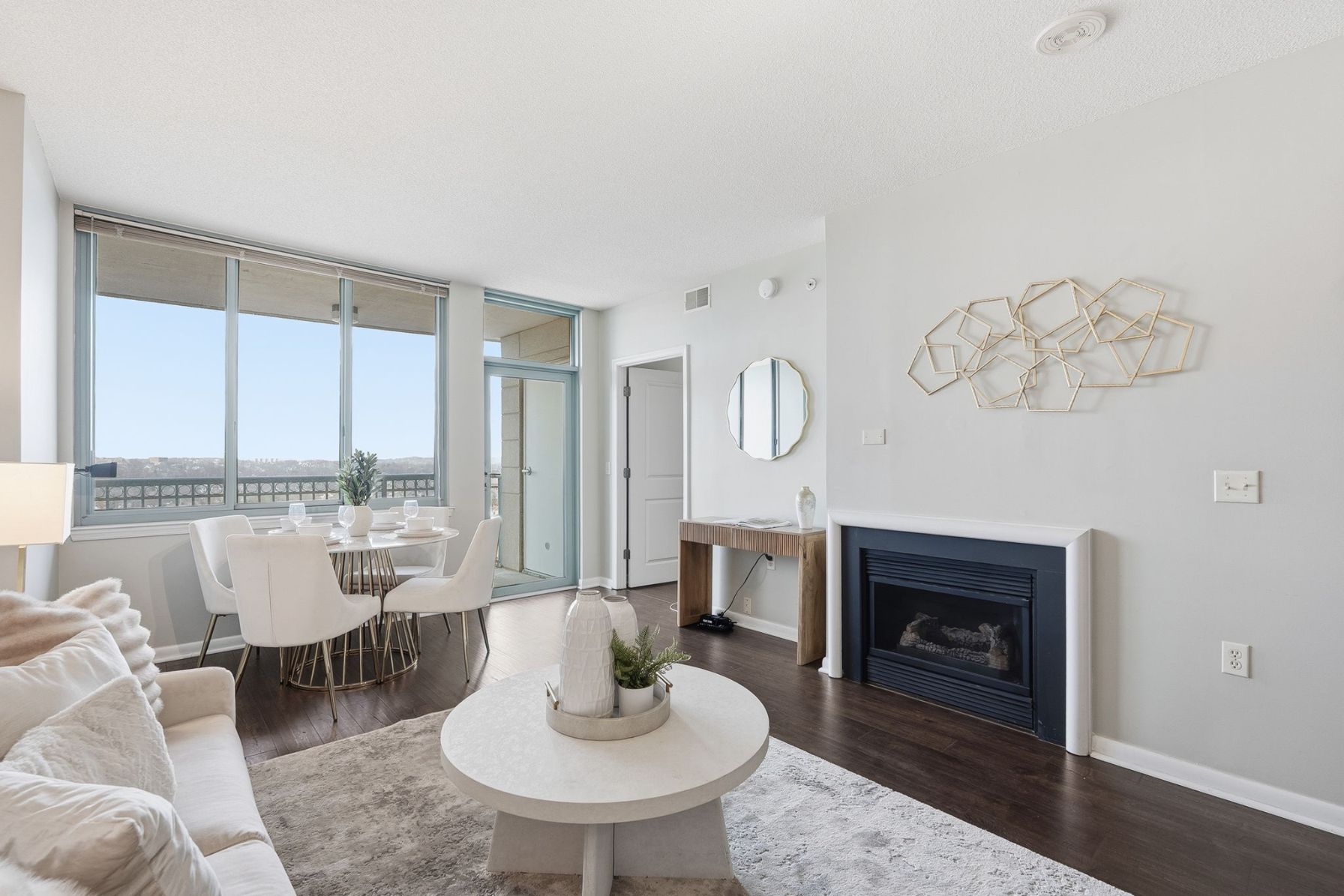backdrop. The living room is both inviting and stylish, centered around a gas fireplace and opening directly to the balcony, perfect for enjoying fresh air and those expansive 19th-floor views.