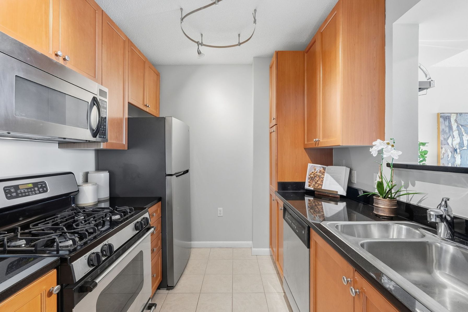 The kitchen blends function and style with stainless steel appliances, gas cooking, granite countertops, and a convenient