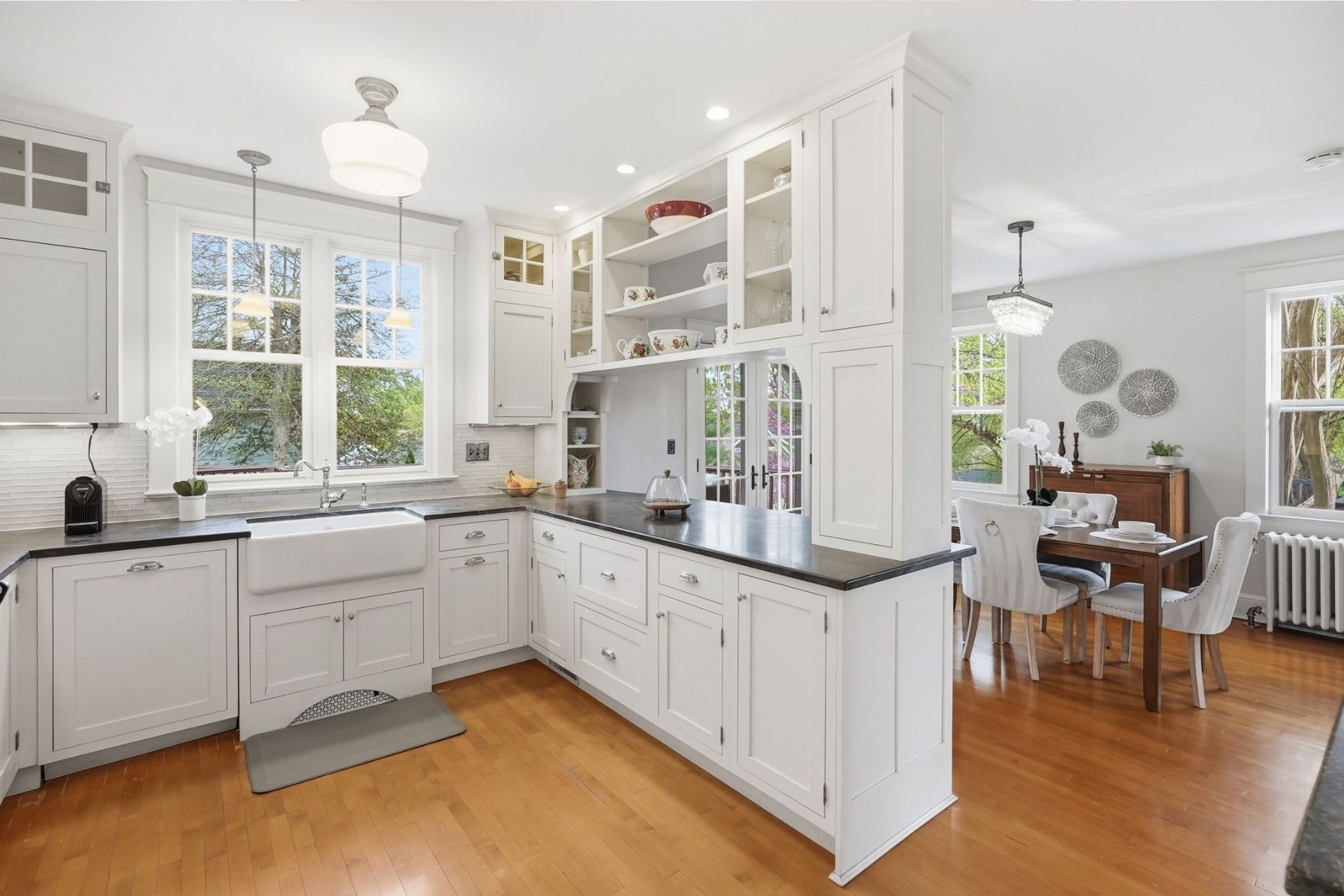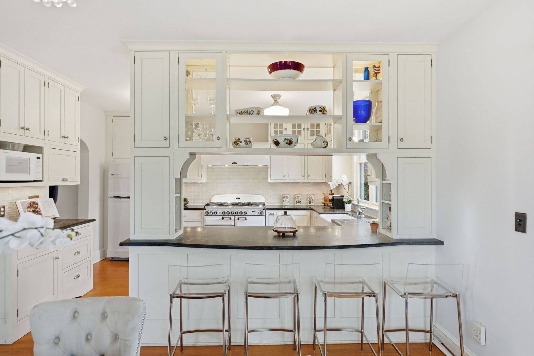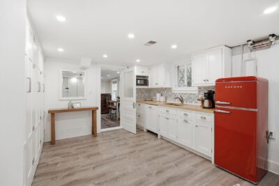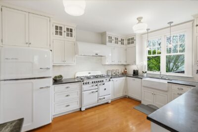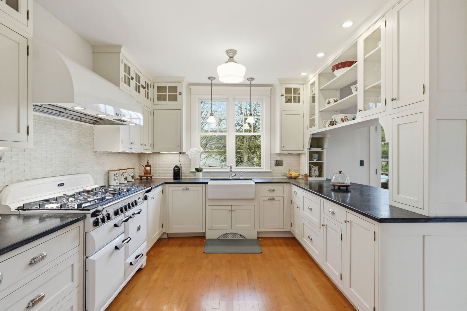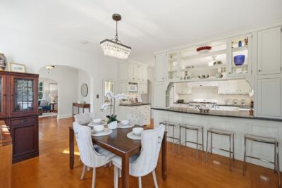 The kitchen is both functional and beautifully appointed, blending timeless design with high-end performance. Soapstone countertops, a striking glass tile backsplash, and custom cabinetry are complemented by a premium AGA Legacy 6-burner, dual fuel stove with matching hood. A farmhouse sink centered beneath a large window allows views of the backyard, while a breakfast bar with seating creates an effortless connection to the dining area. A retro City Chill refrigerator, showcase cabinet island, and layered pendant, recessed, and chandelier lighting complete the space.