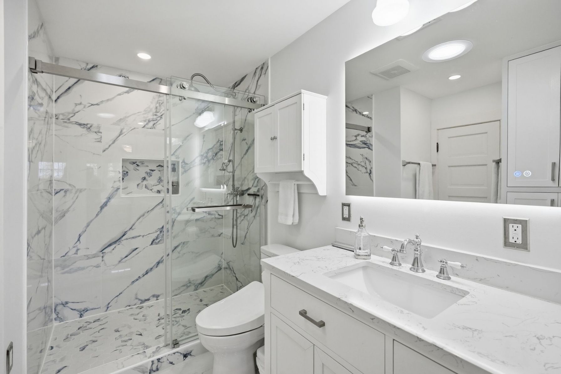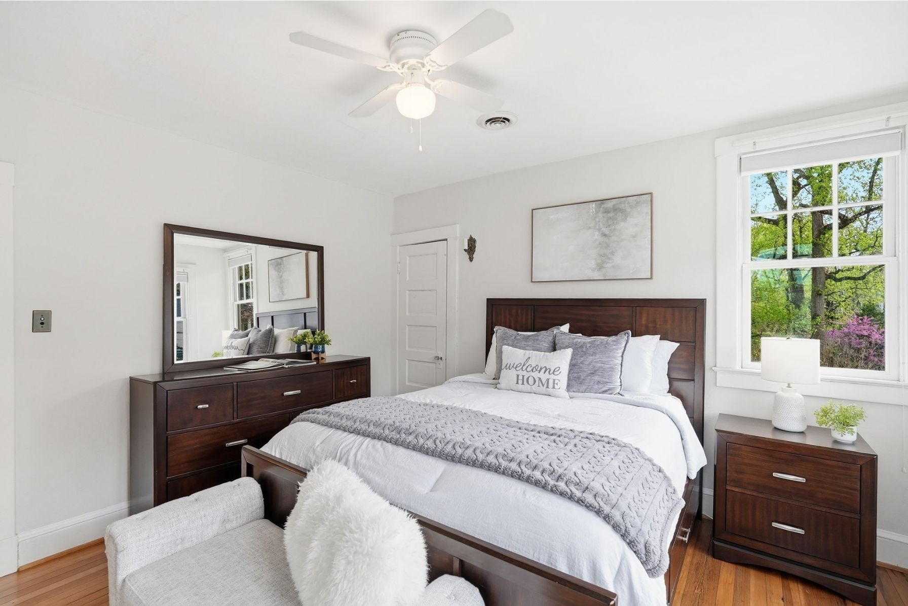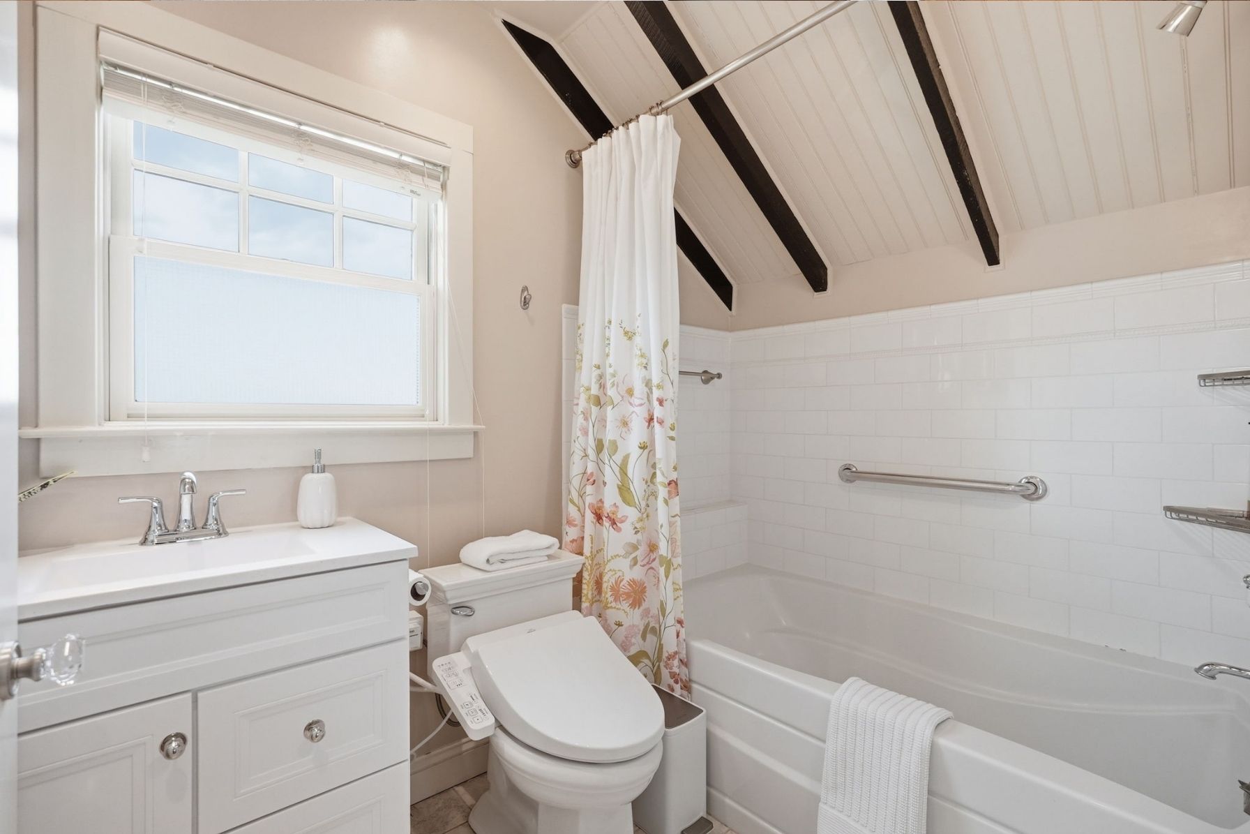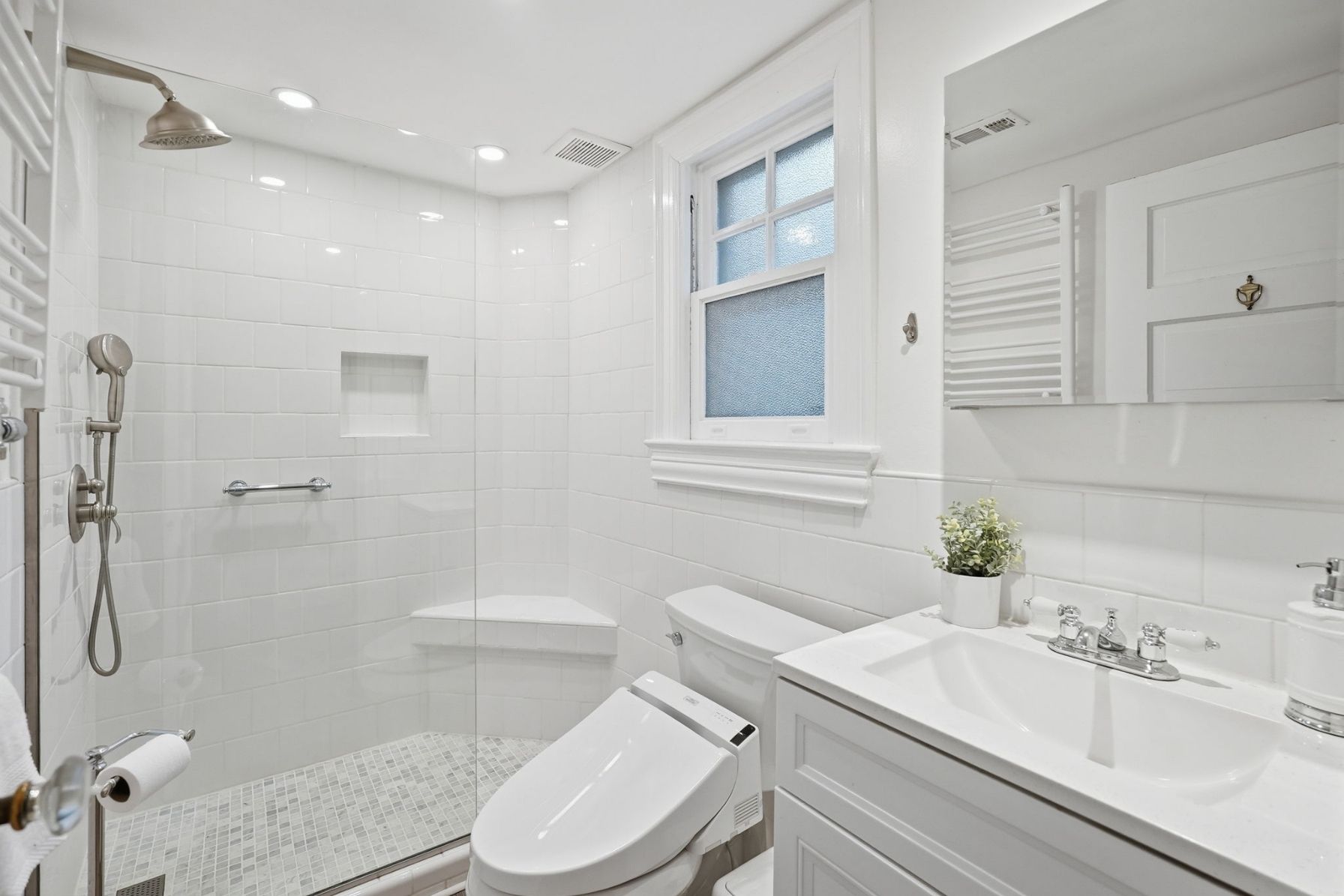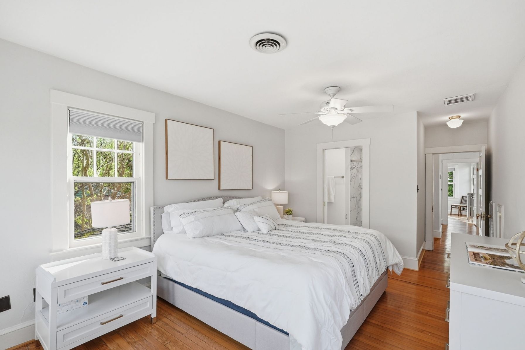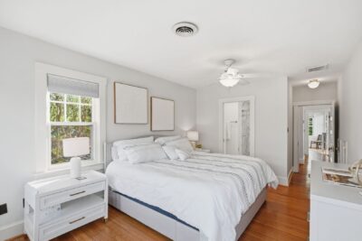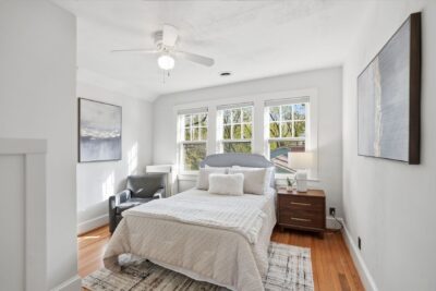 Upstairs, the home offers three bedrooms and two full bathrooms, each filled with natural light and finished in a clean, timeless palette. The primary suite is bright and serene, with multiple windows and a calm, airy feel, and features a private en-suite bathroom added in 2024 with ceramic tile floors, a beautiful glass shower and walk in closet.