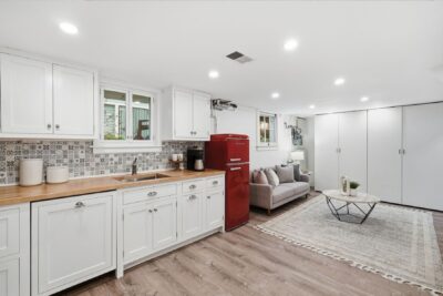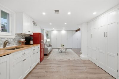 The fully finished lower level, renovated in 2020, expands the home’s livability even further, offering a versatile space that can also function as a private suite. This level features a spacious bedroom, a full bathroom with glass shower, and a comfortable living area, along with a thoughtfully designed kitchenette complete with custom cabinetry, butcher block countertops, dishwasher, refrigerator and stylish tile backsplash. Ideal for guests, extended family, or flexible living arrangements, the lower level also includes abundant storage and dedicated utility space, all while maintaining a bright and welcoming feel.