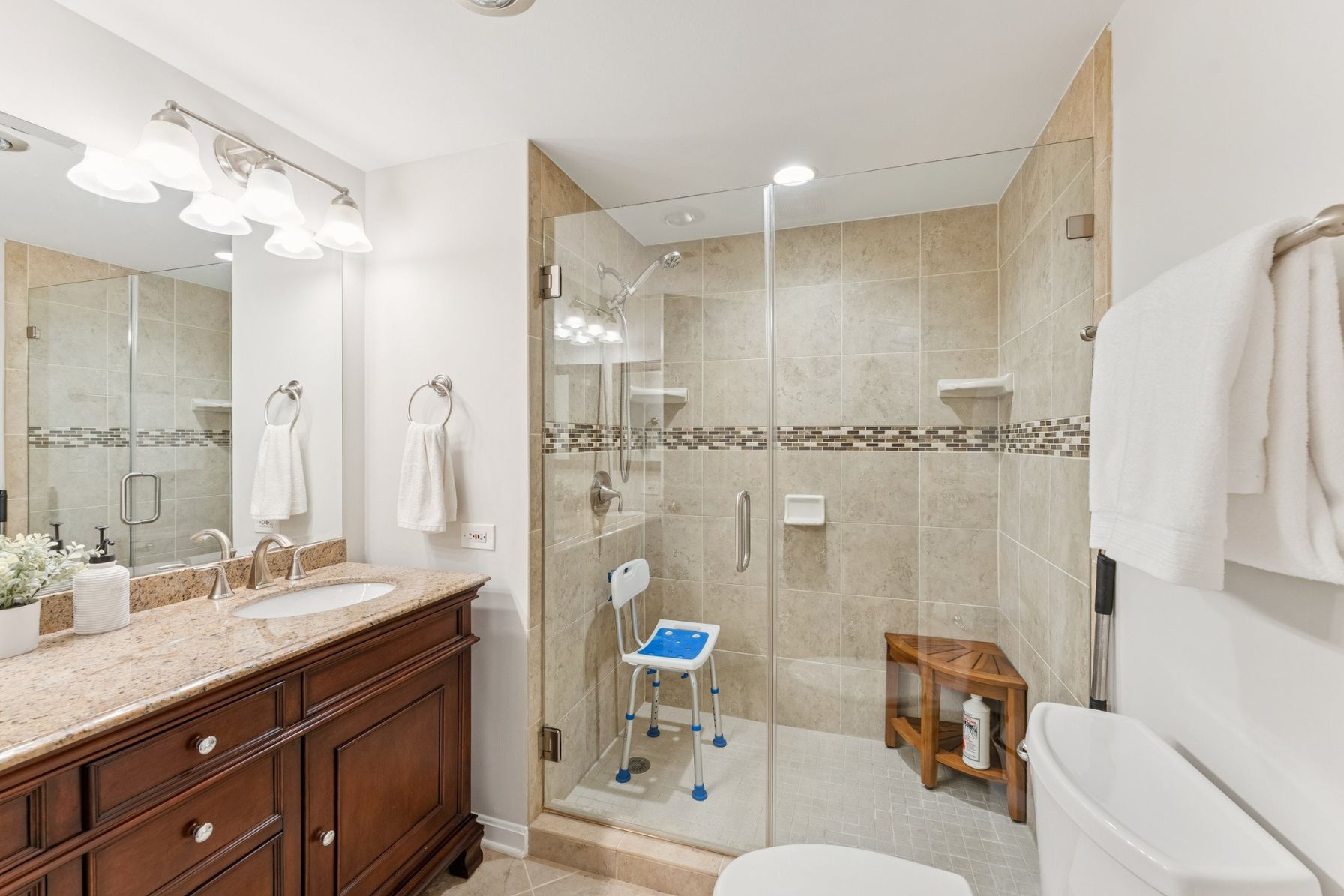 The spacious primary suite offers private access to a second sunroom, a large walk-in closet, an additional closet, and a fully renovated en-suite bath. featuring tan ceramic tile, a glass-enclosed shower with accent tile and a dual-sink granite-topped vanity.