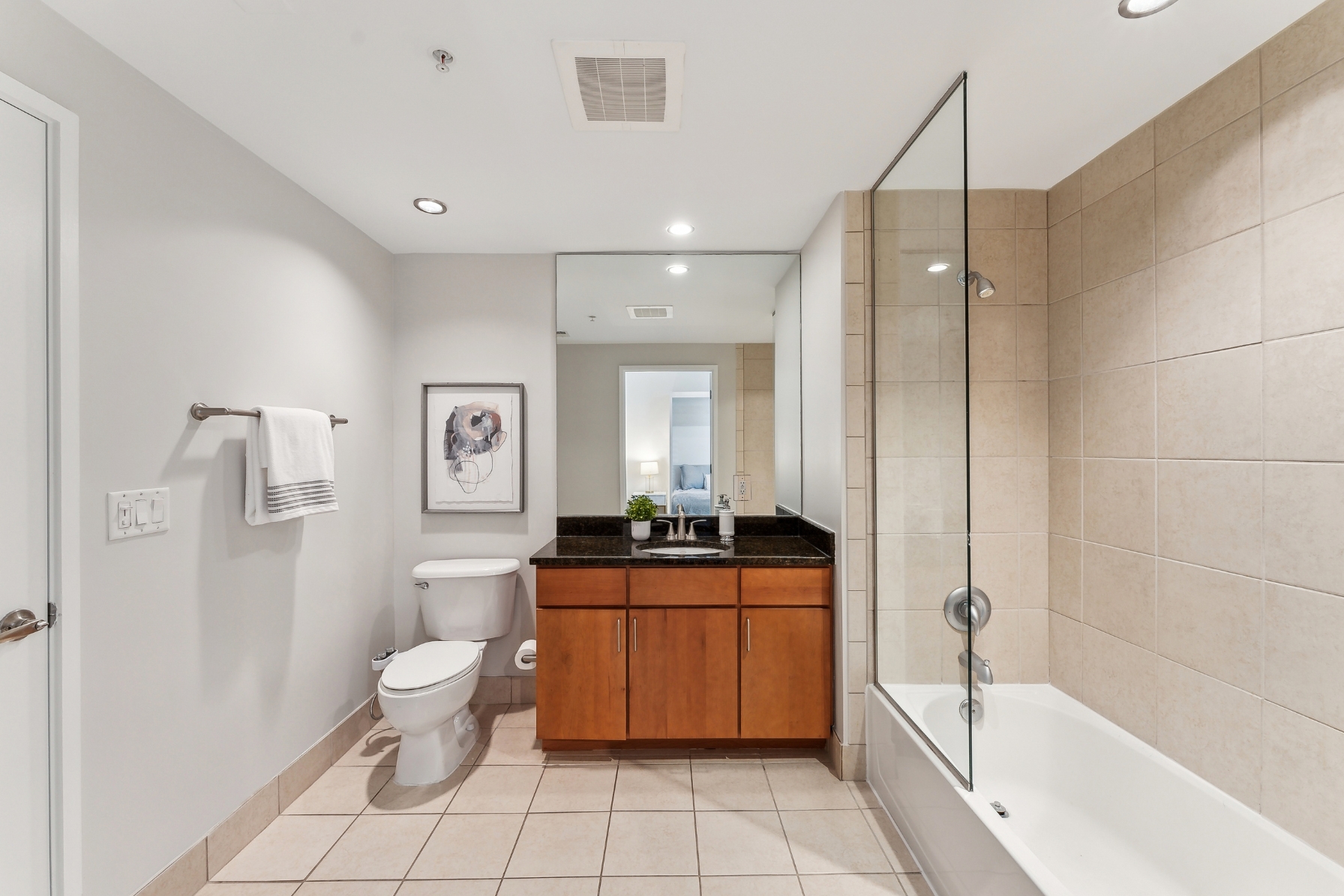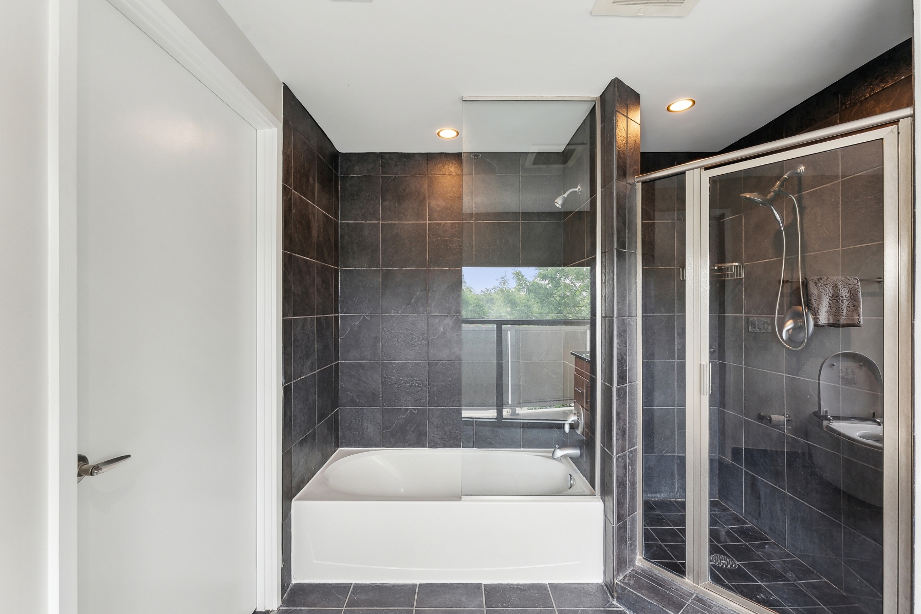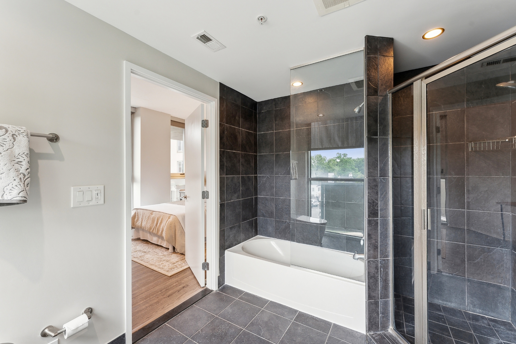 The owner’s suite includes a large walk-in closet and an expansive private bath with black ceramic tile, a glass-enclosed shower, and a separate soaking tub. The second bedroom and dual entry bathroom are located on the opposite side of the living space for great privacy.