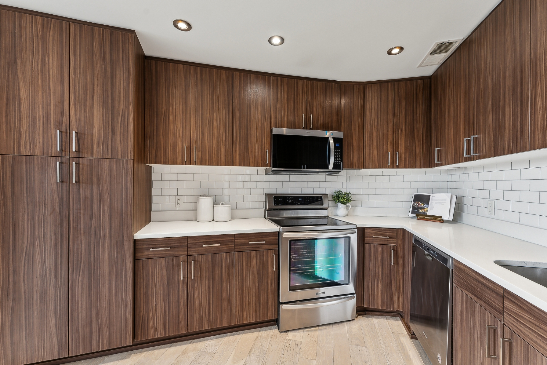 The stylish kitchen is designed for entertaining, featuring deep espresso-toned cabinetry, white quartz countertops, a new white subway tile backsplash, stainless steel appliances and a large island that opens into the living area.