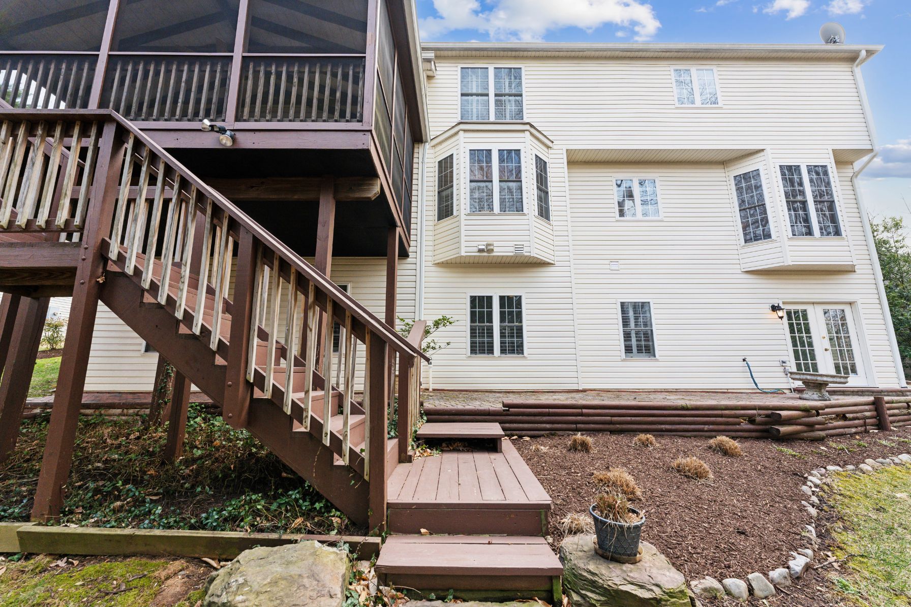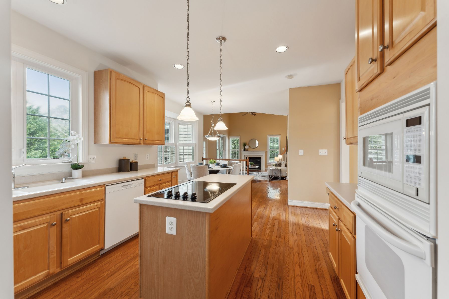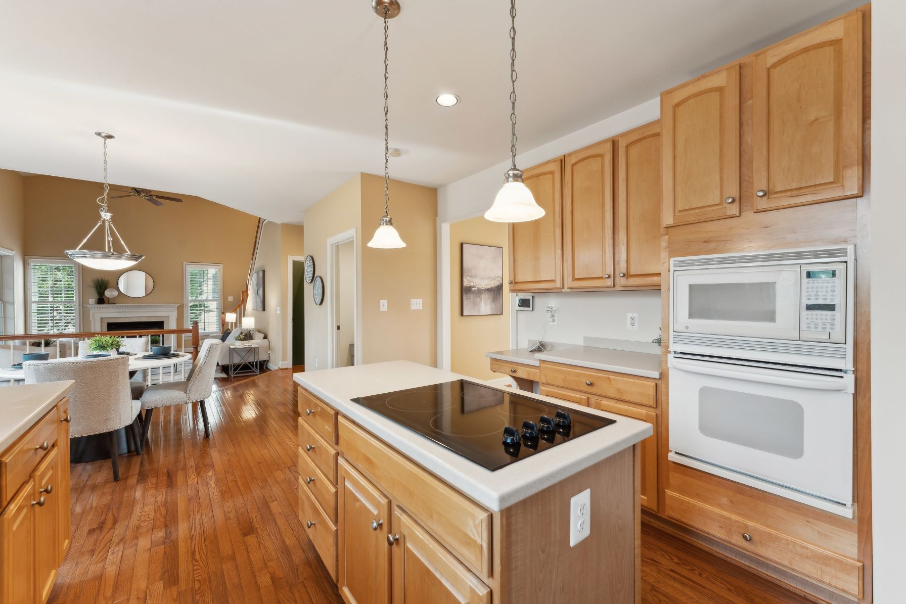 Step through the front door into a grand two-story foyer, where oak hardwood floors span the entire main level. The spacious eat-in kitchen features classic oak cabinetry, Corian countertops, a center island with an electric cooktop, and a bright breakfast area framed by bay windows overlooking the expansive backyard. The kitchen seamlessly flows into the breathtaking two-story family room, complete with a cozy gas fireplace and doors leading to a huge screened-in porch—the perfect spot to enjoy your morning coffee while soaking in the sights and sounds of nature.