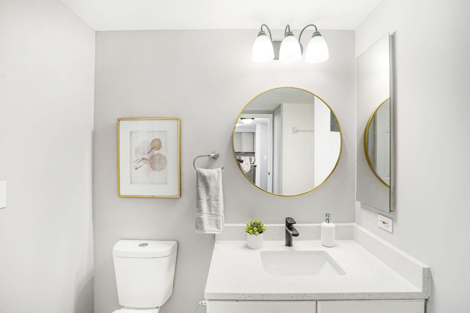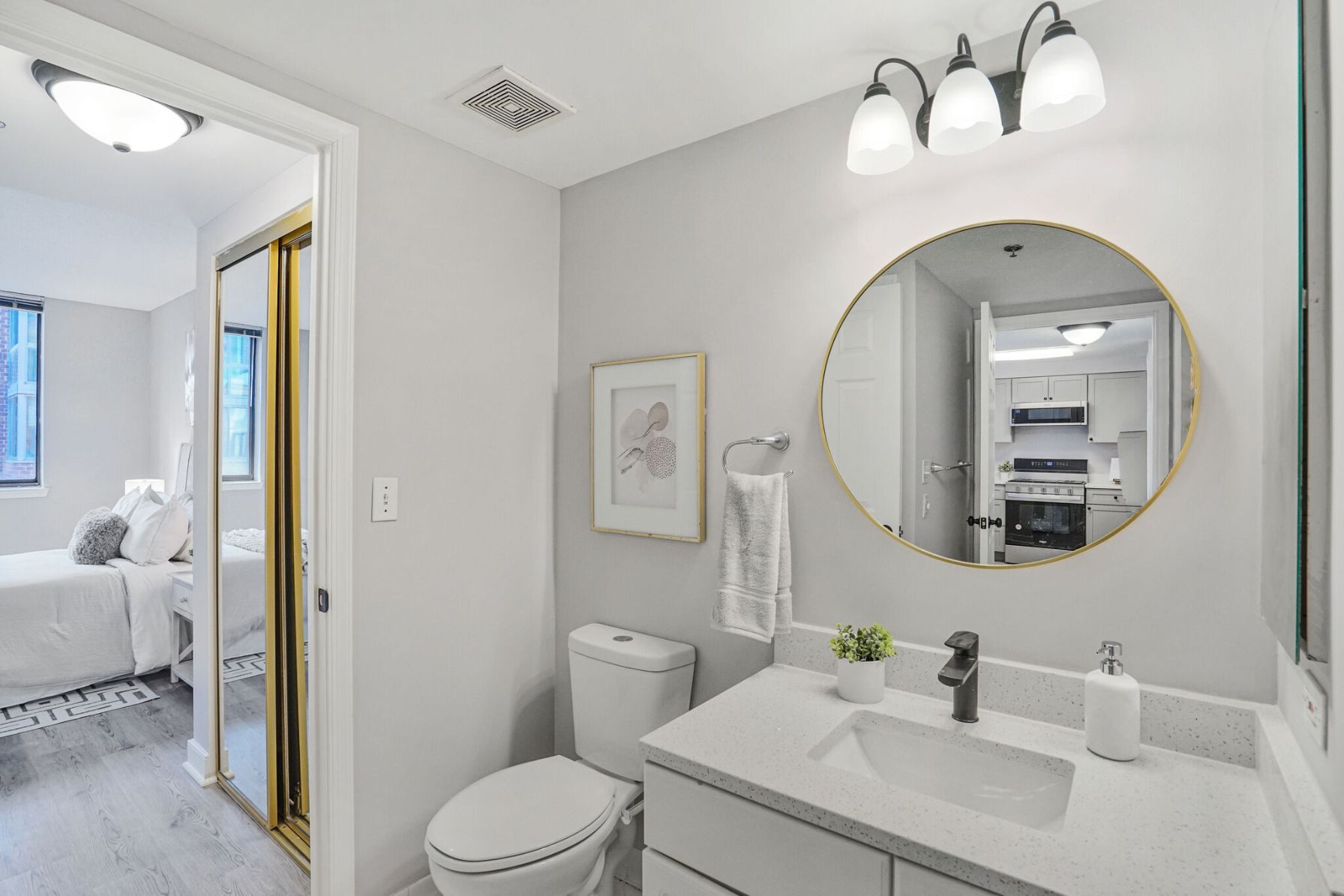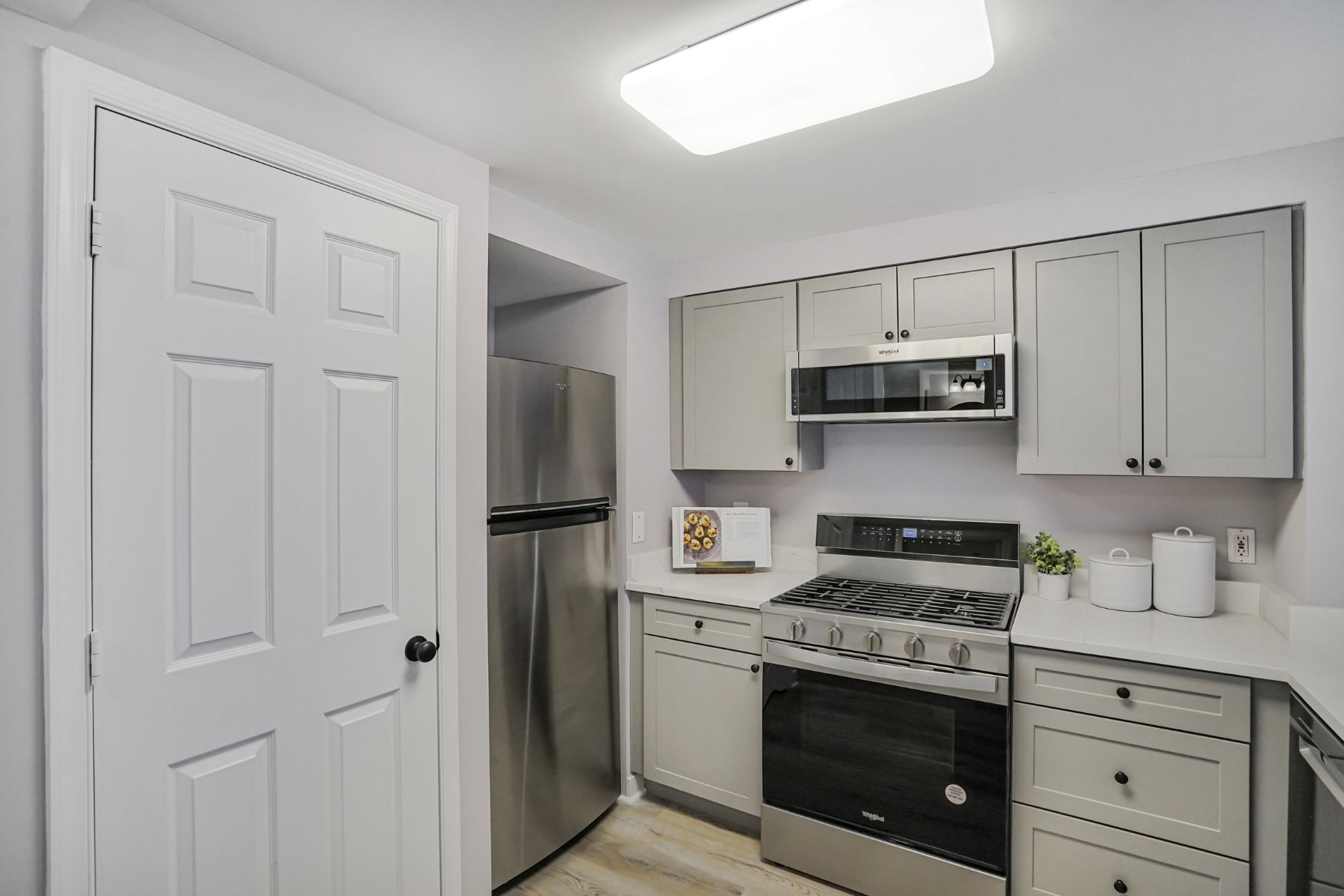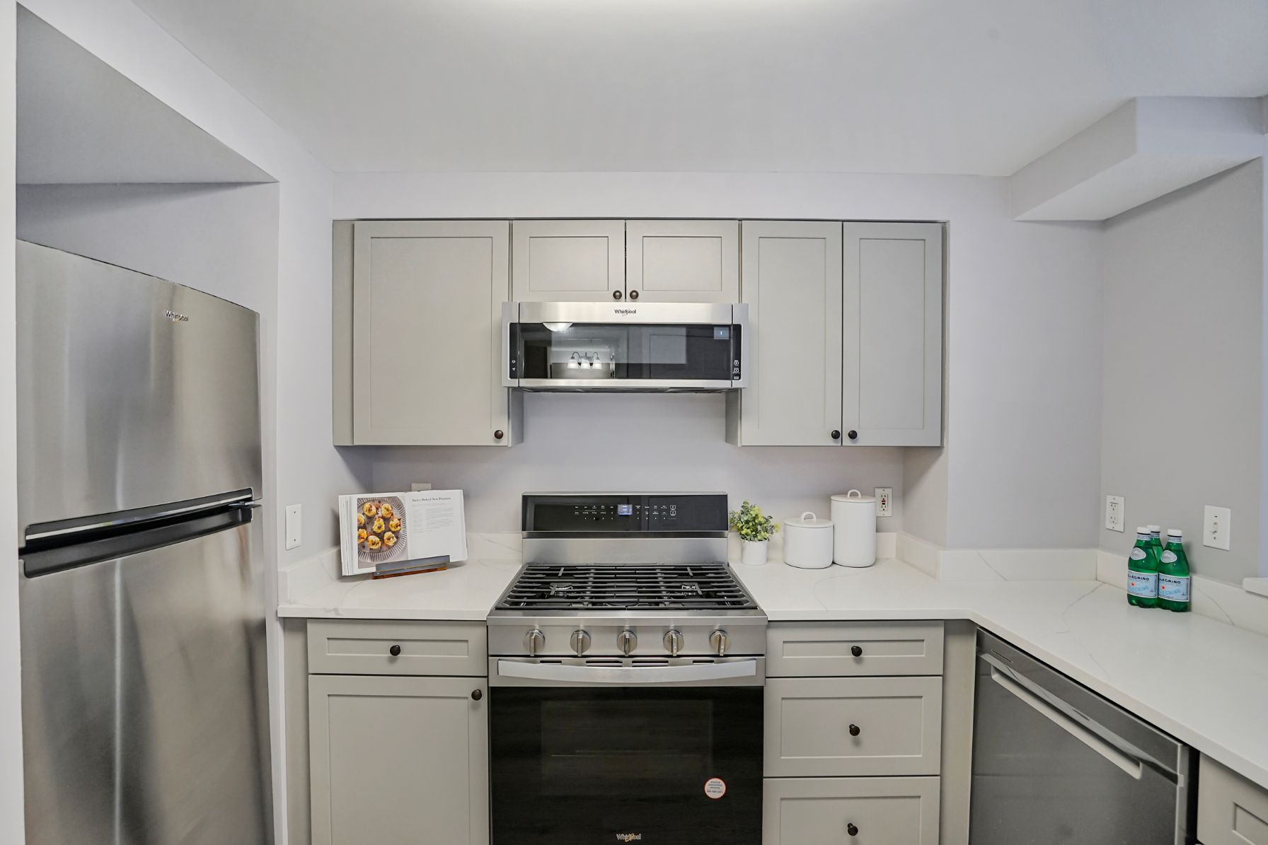 The modern kitchen is a showstopper, boasting brand-new Diamond Express “Cloud” cabinets, pristine white quartz countertops, and Whirlpool stainless steel appliances. A stylish breakfast bar seamlessly connects the kitchen to the spacious living area, making it perfect for entertaining.