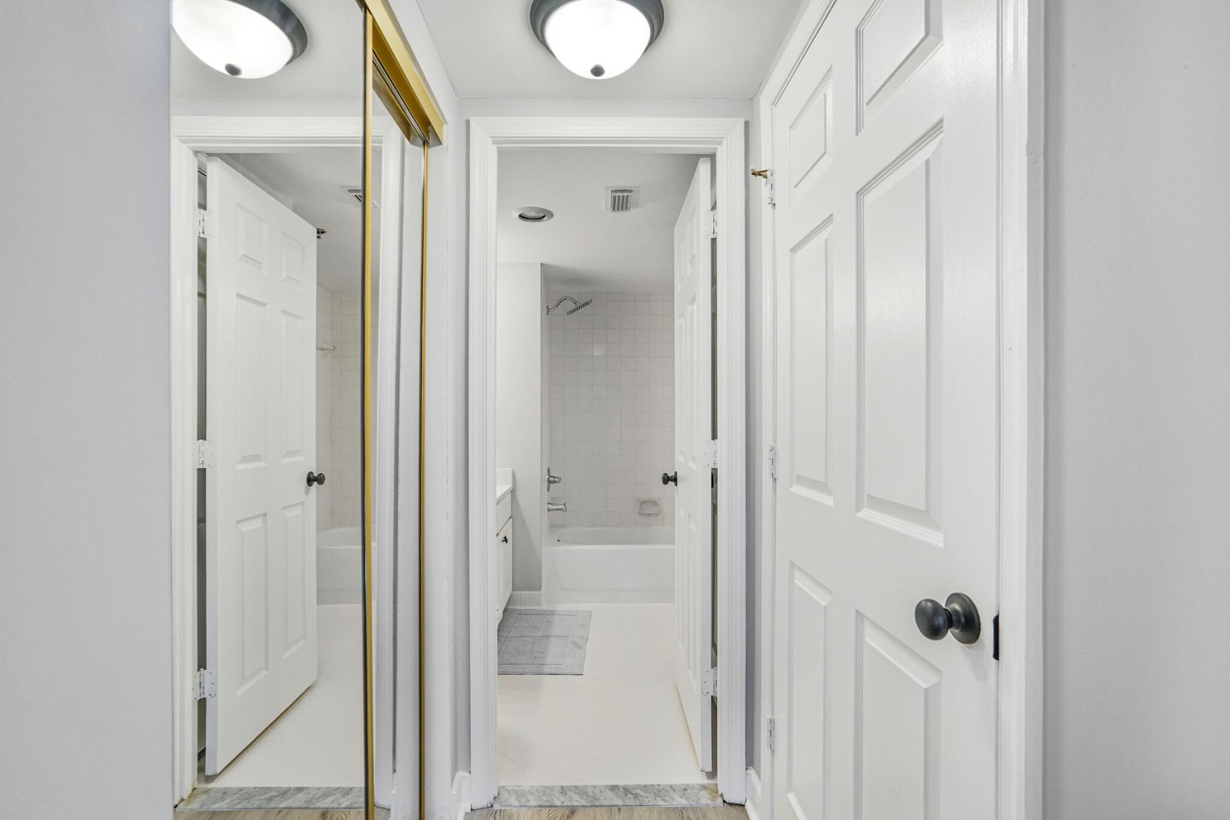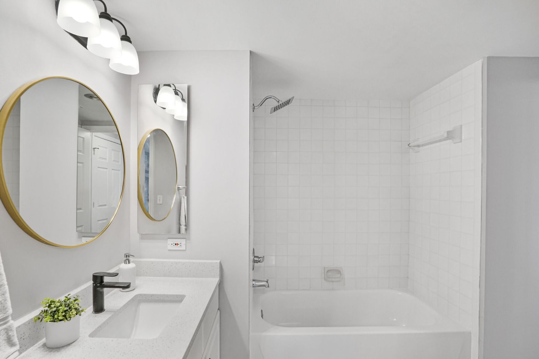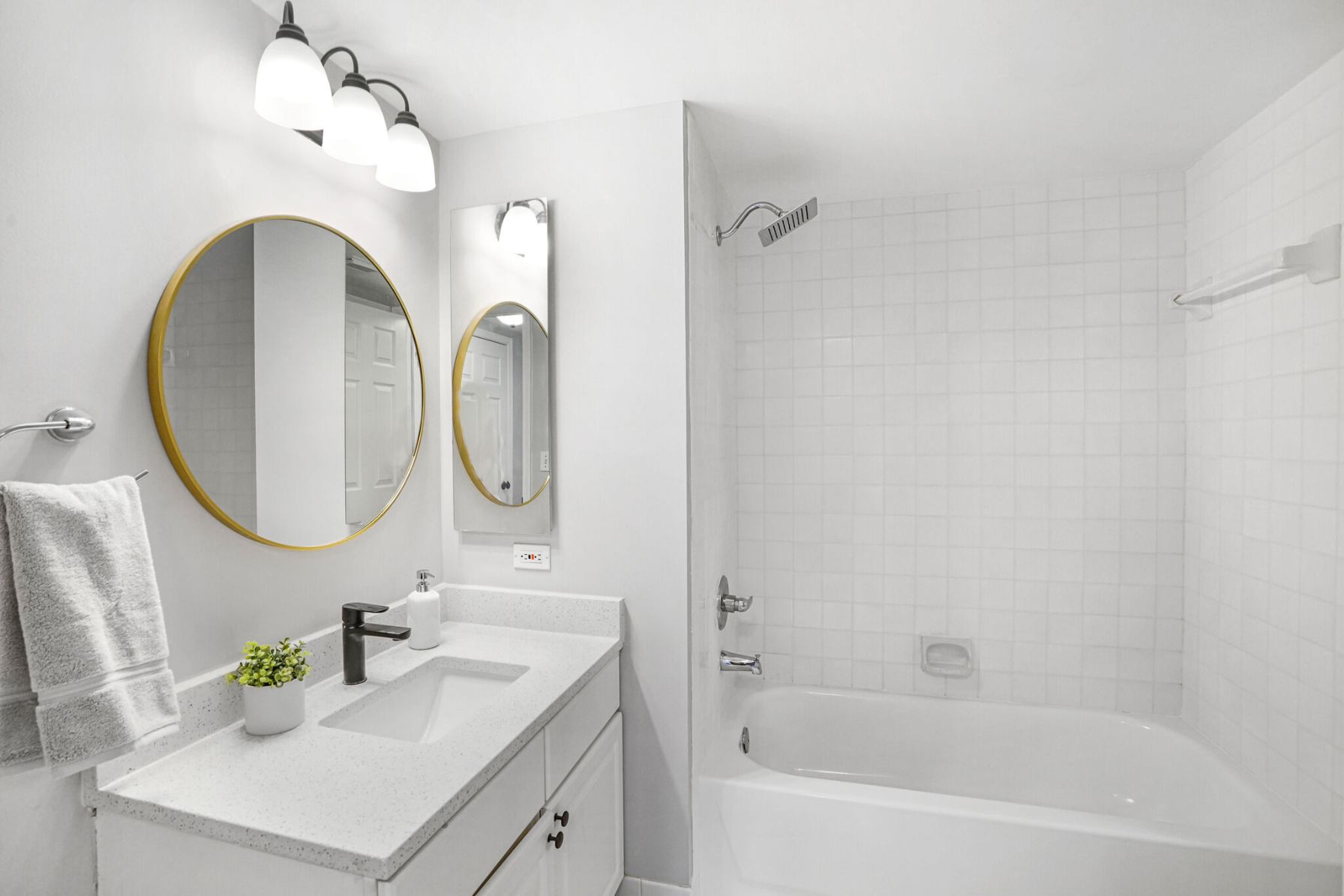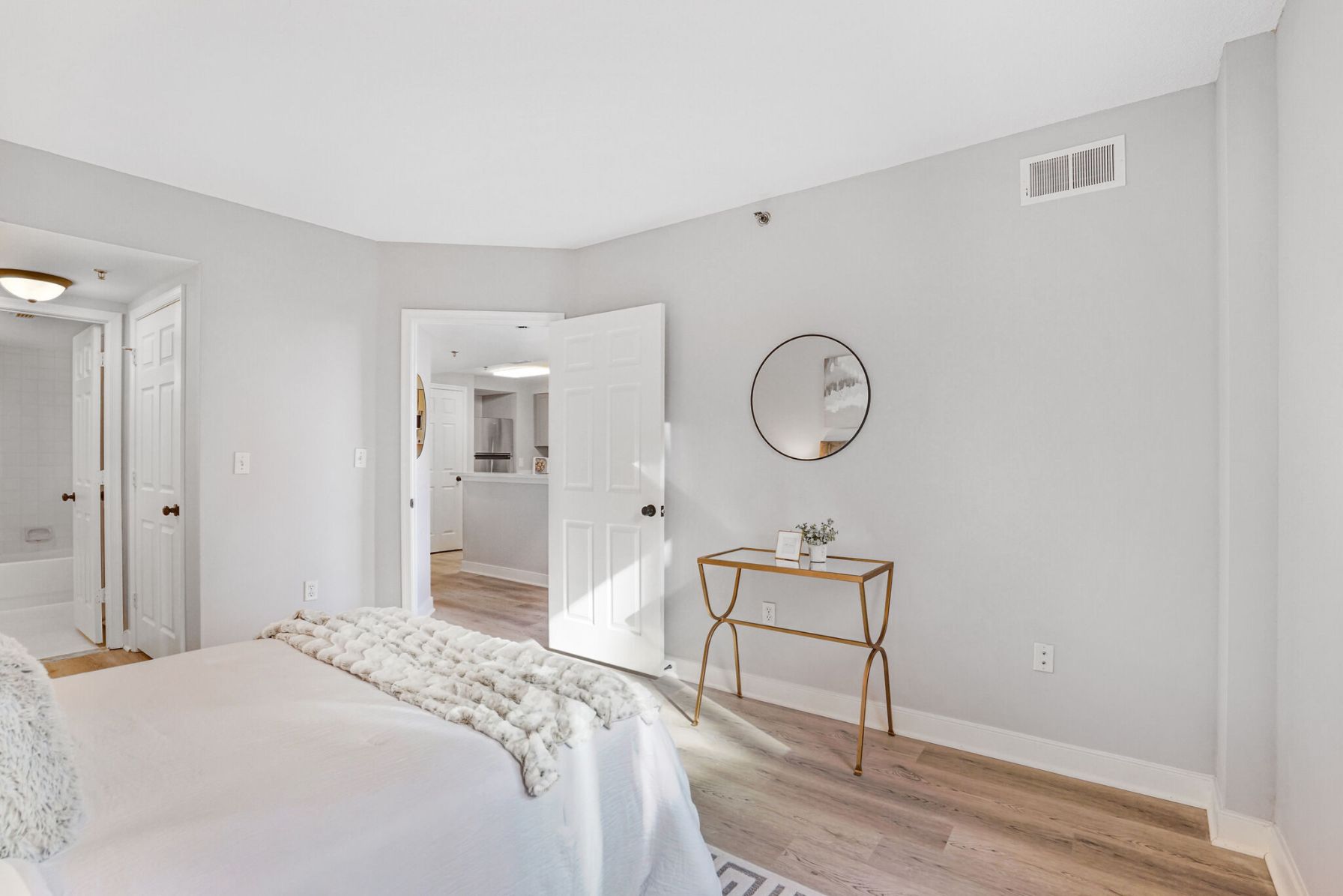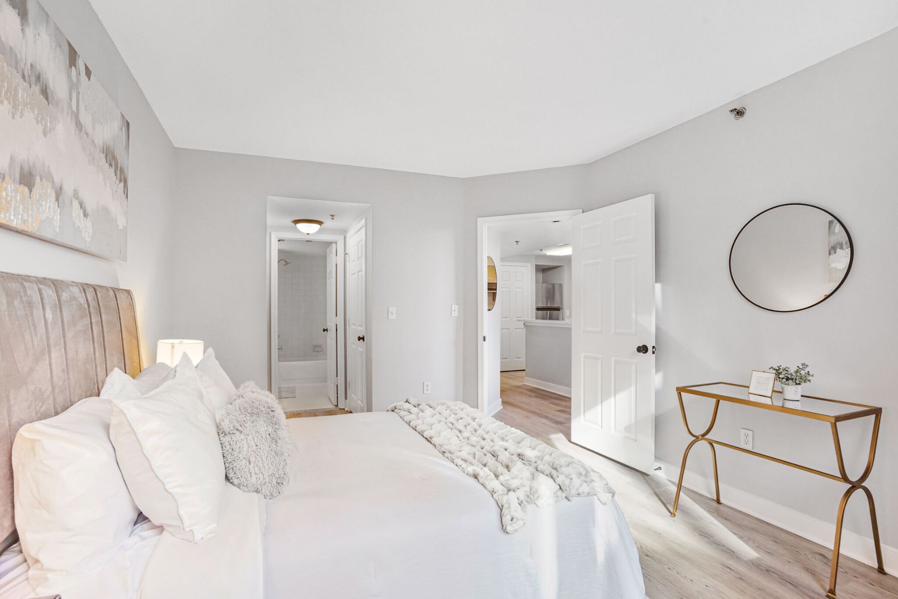 The large bedroom offers luxury vinyl flooring and two generous closets leading into a dual-entry bathroom with ceramic tile floors, a quartz-topped vanity, and a tub/shower combo.