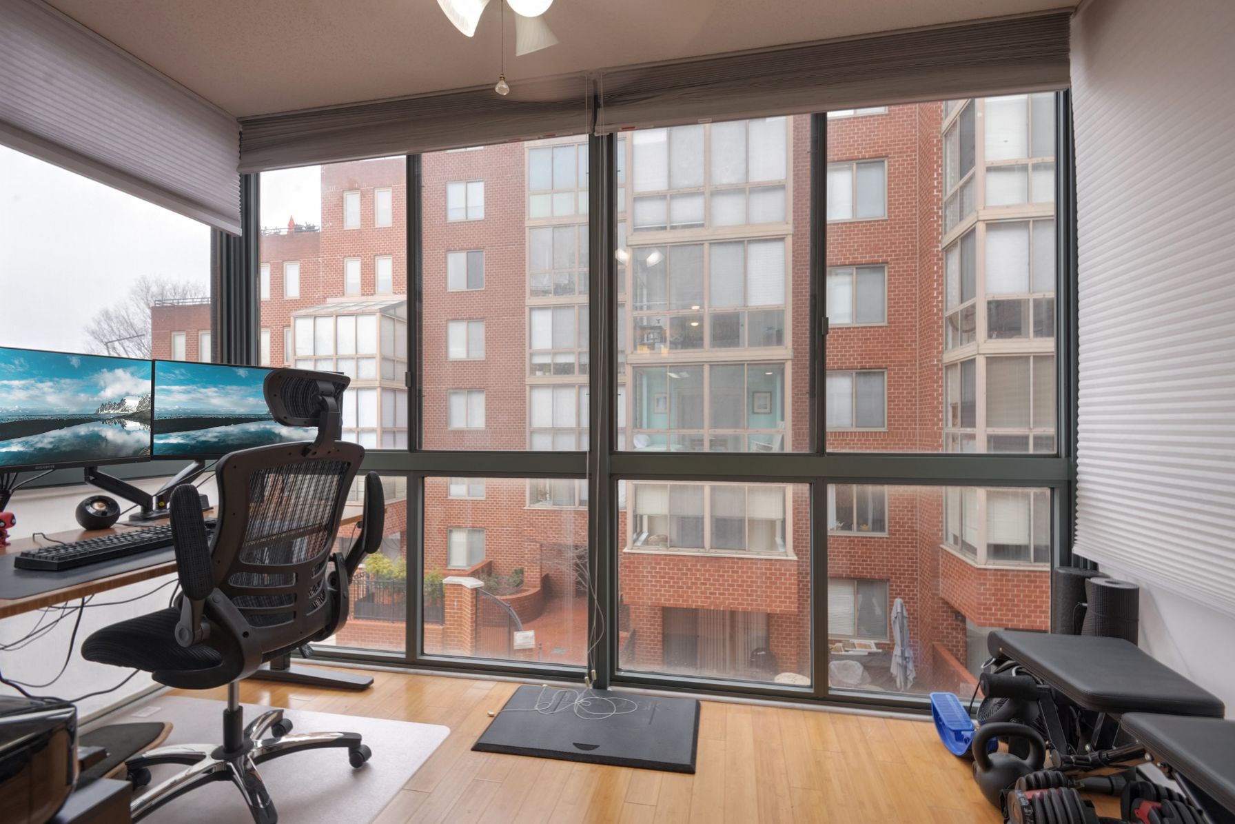 Beautifully updated one bedroom at Windsor Plaza has Bamboo floors that flow into the light and bright living space with a window facing north and sliding glass doors that open to a sunroom overlooking the pool and courtyard, perfect for a home office.