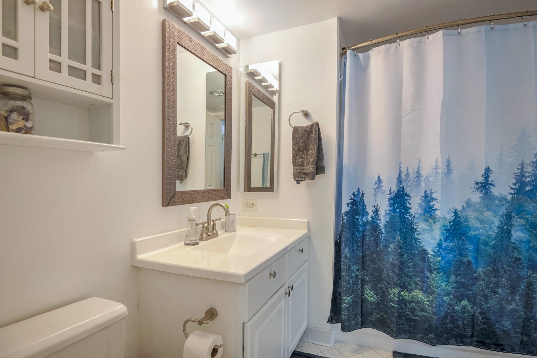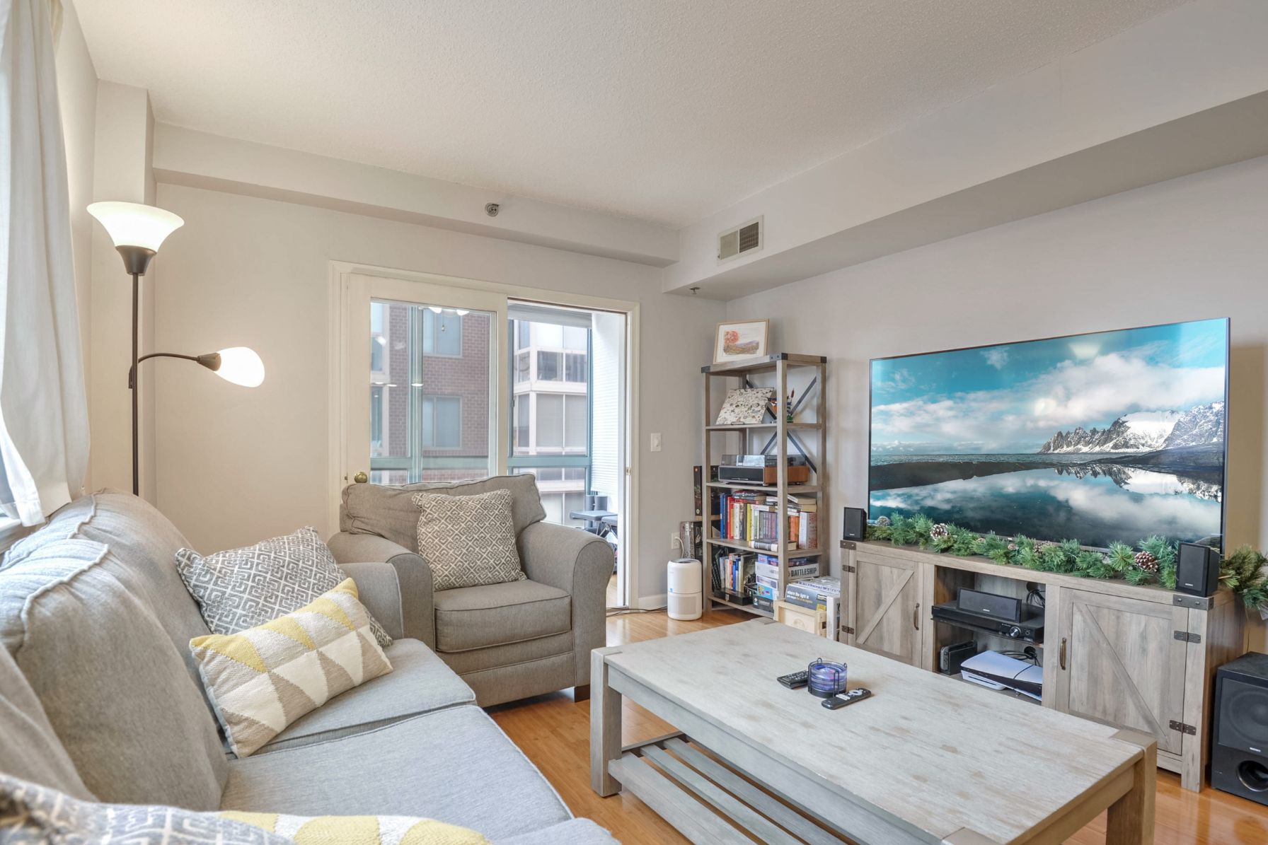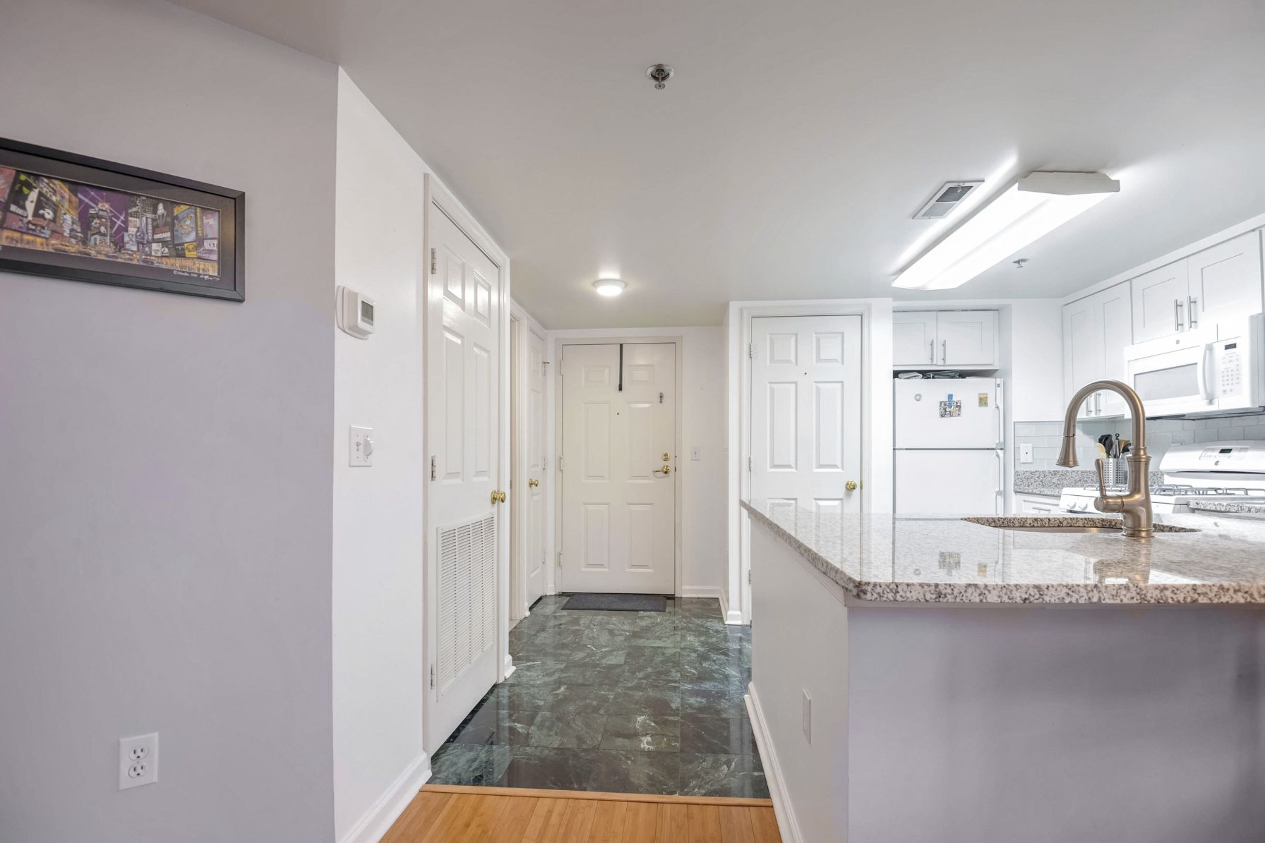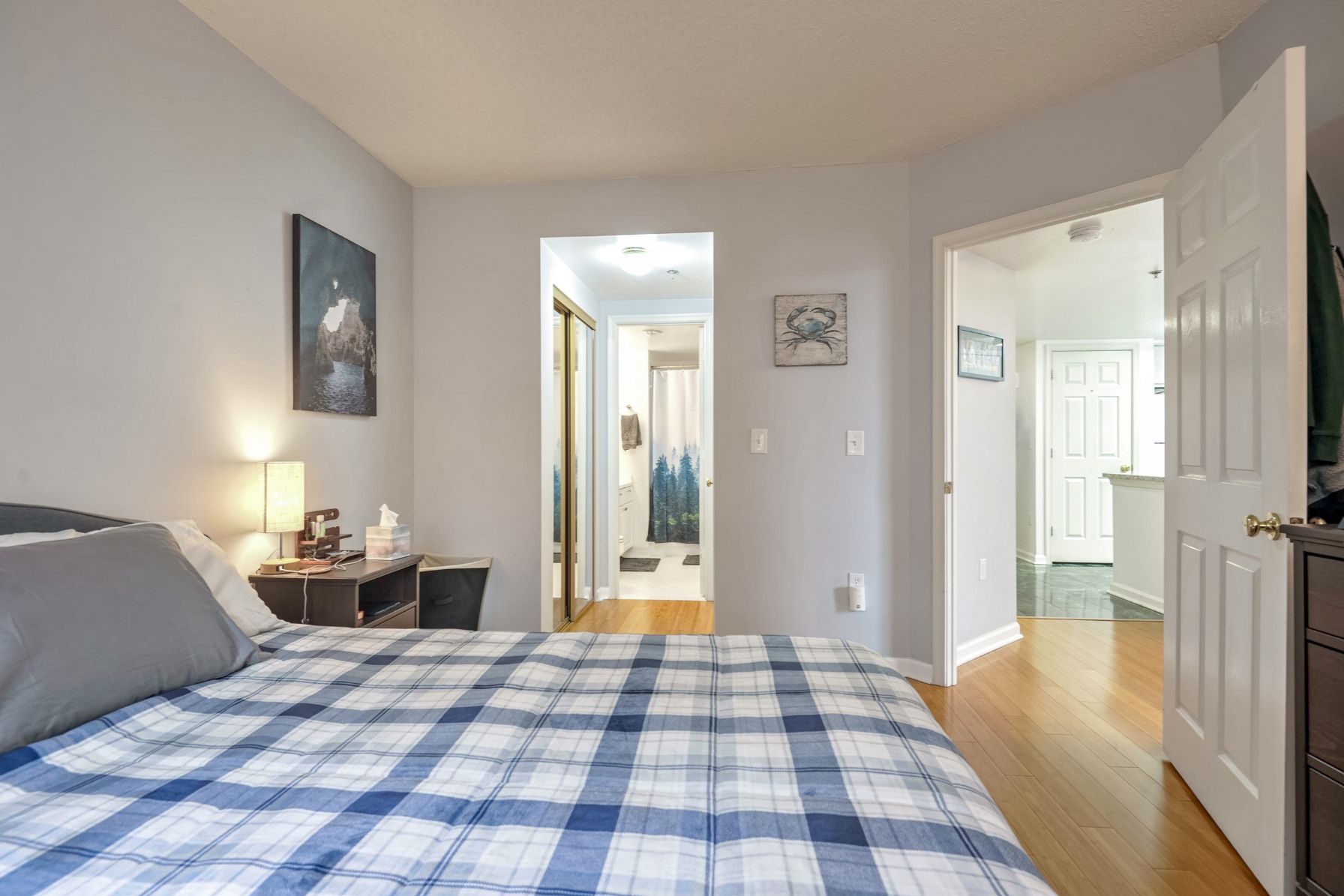 Bamboo floors continue into the large bedroom with 2 closets which connects to the dual entry bath with an upgraded vanity topped with quartz and a bath/shower combo. One convenient parking space conveys as well as extra storage.