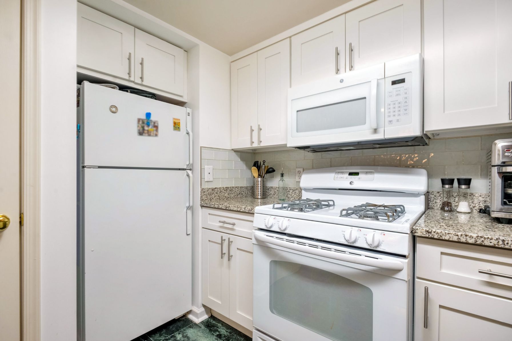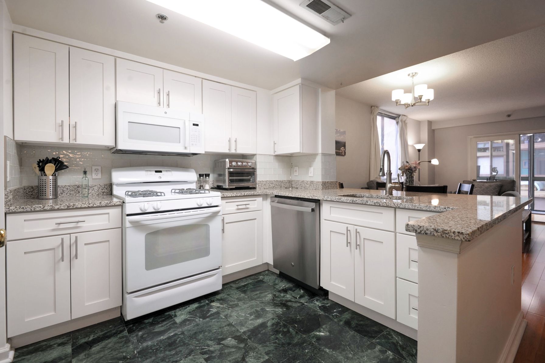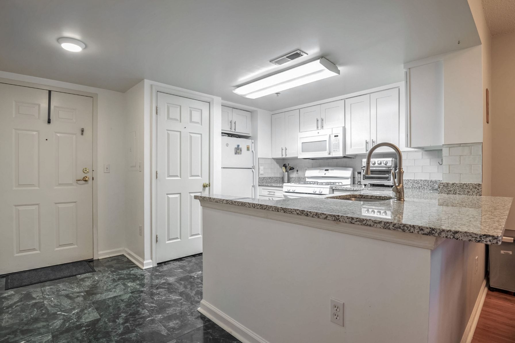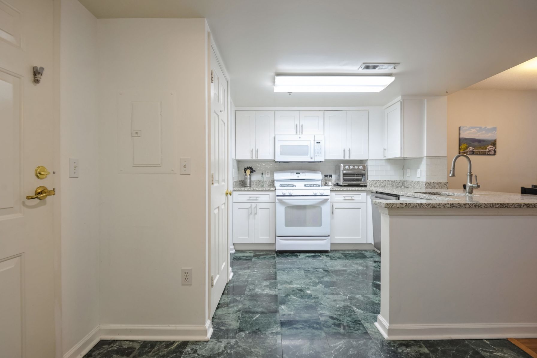 The kitchen has updated white cabinets, a white glass tile backsplash, white & stainless steel appliances and granite counters with a breakfast bar that opens to the living space.
