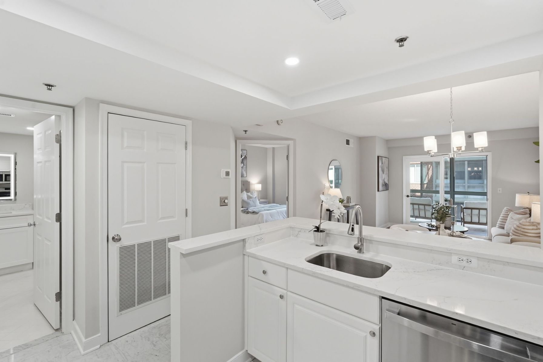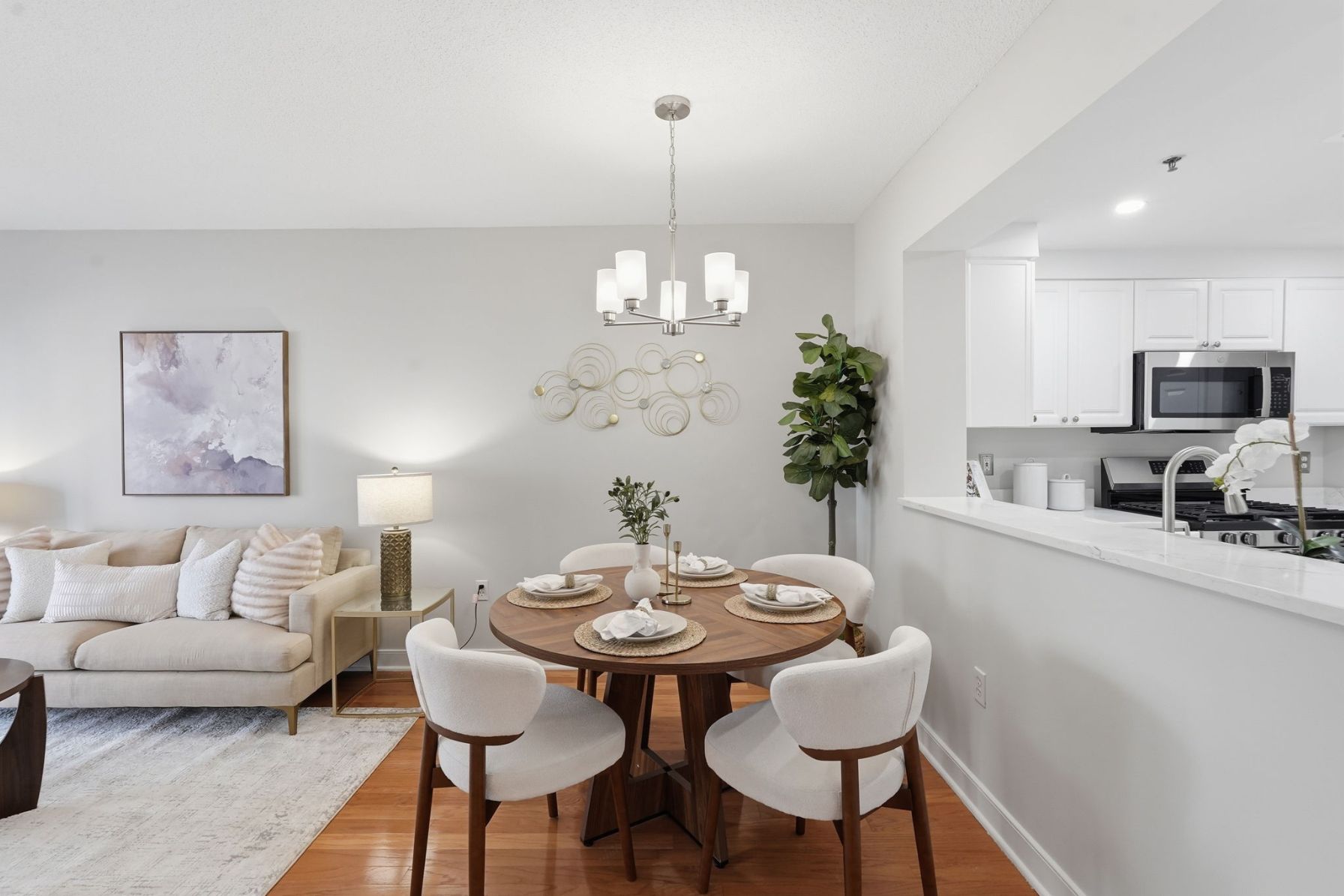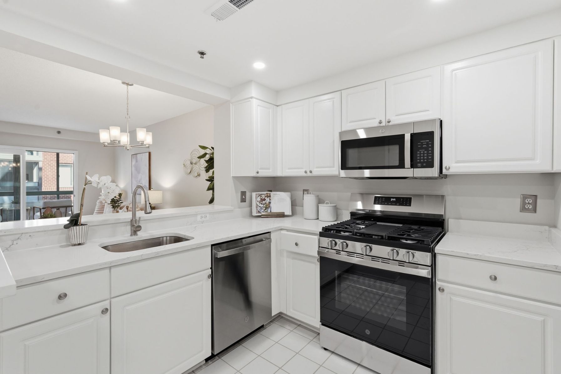 This immaculate residence has been completely refreshed from top to bottom. The kitchen shines with brand new quartz countertops, crisp white cabinetry, and new stainless-steel GE gas stove, microwave and dishwasher, complemented by newly added recessed lighting for a bright, modern feel. A breakfast bar overlooks the open-concept living and dining area, where a new chandelier defines the space and warm oak hardwood floors flow seamlessly into the spacious living room. Glass doors open to a sunroom offering a peaceful courtyard view, perfect for a home office, reading nook, or morning coffee retreat.