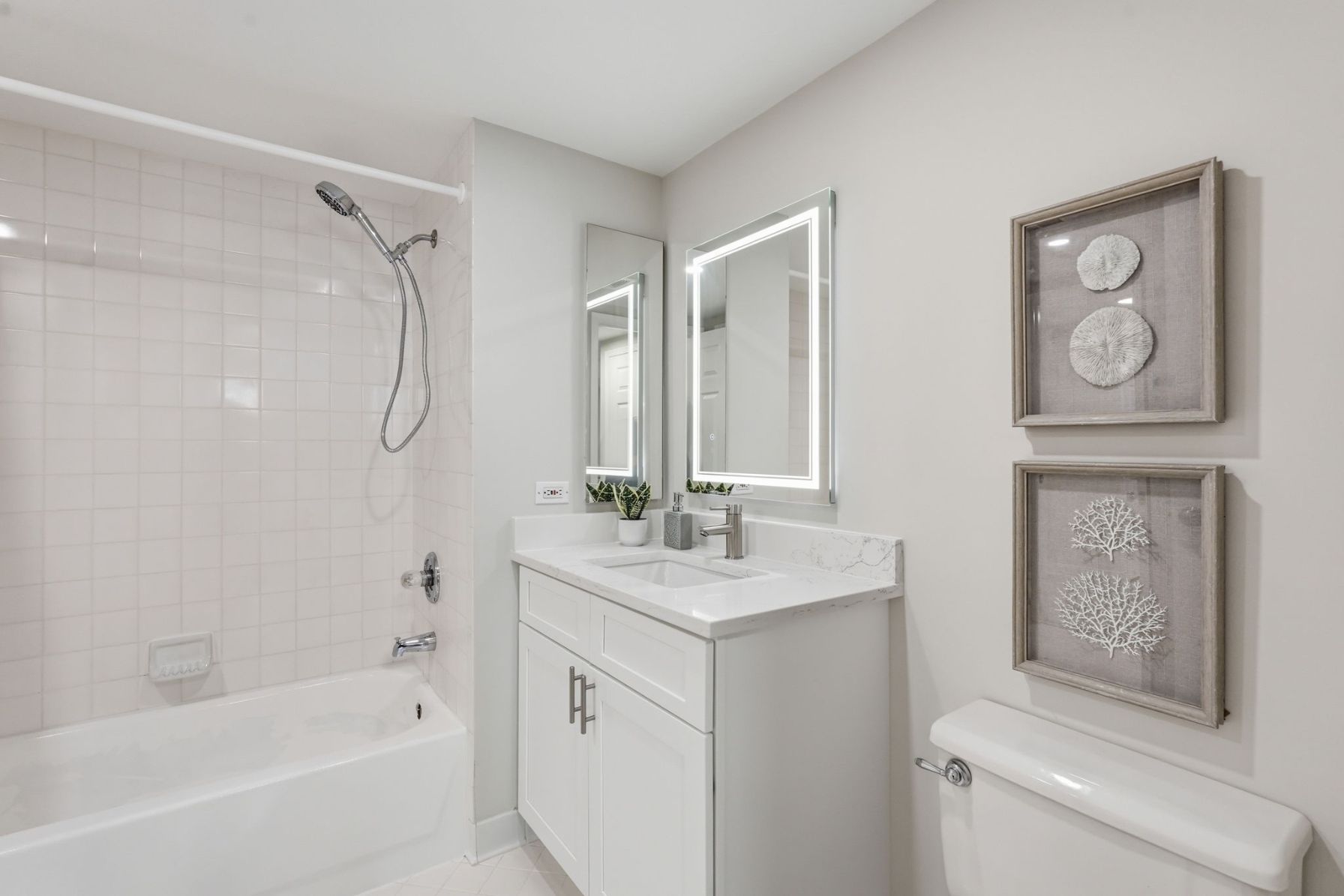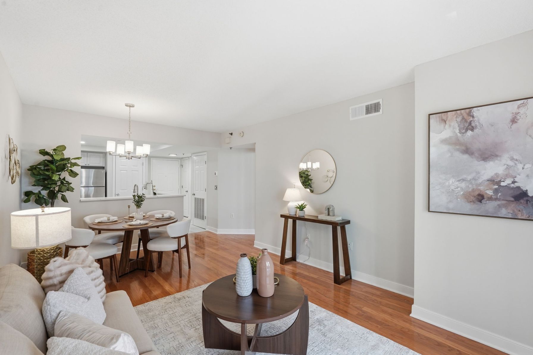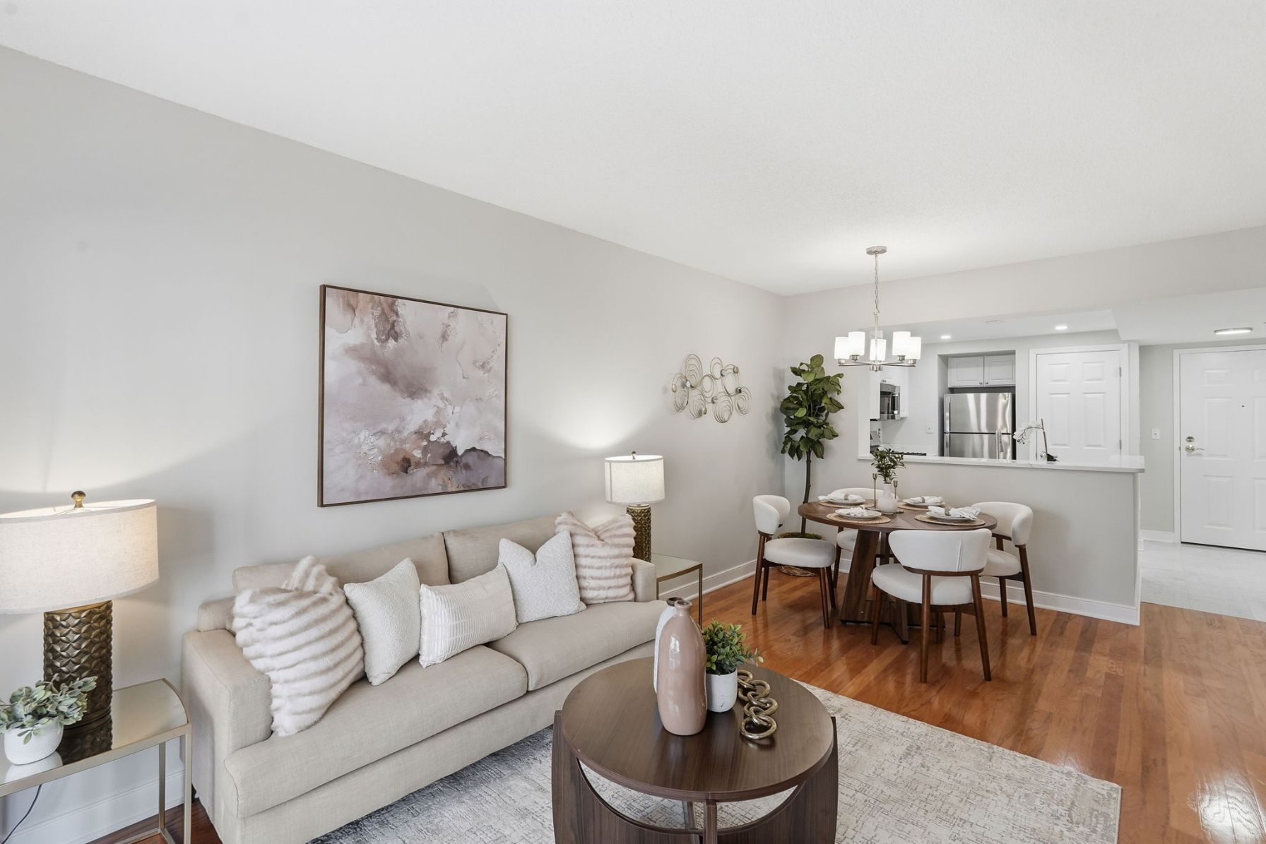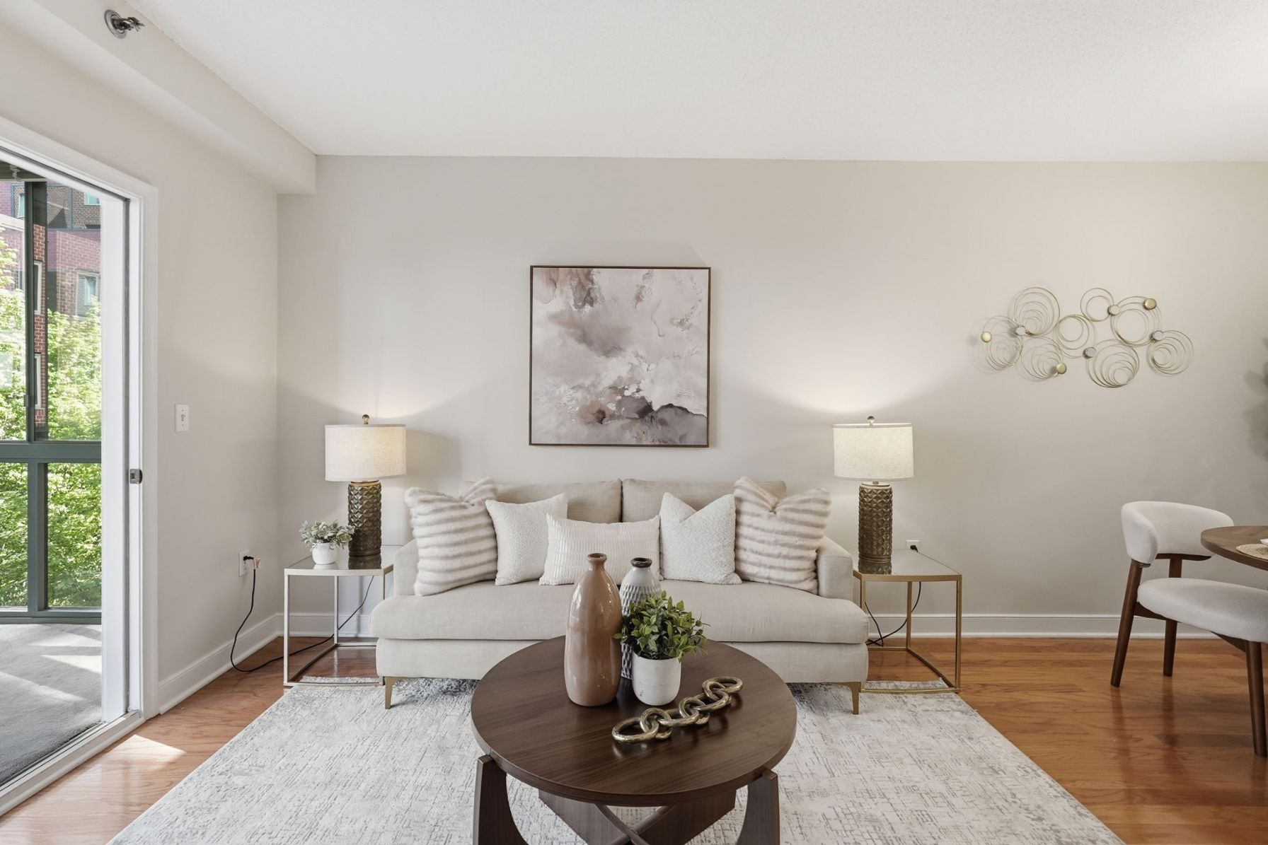 This immaculate residence has been completely refreshed from top to bottom. The kitchen shines with brand new quartz countertops, crisp white cabinetry, and new stainless-steel GE gas stove, microwave and dishwasher, complemented by newly added recessed lighting for a bright, modern feel. A breakfast bar overlooks the open-concept living and dining area, where a new chandelier defines the space and warm oak hardwood floors flow seamlessly into the spacious living room. Glass doors open to a sunroom offering a peaceful courtyard view, perfect for a home office, reading nook, or morning coffee retreat.
