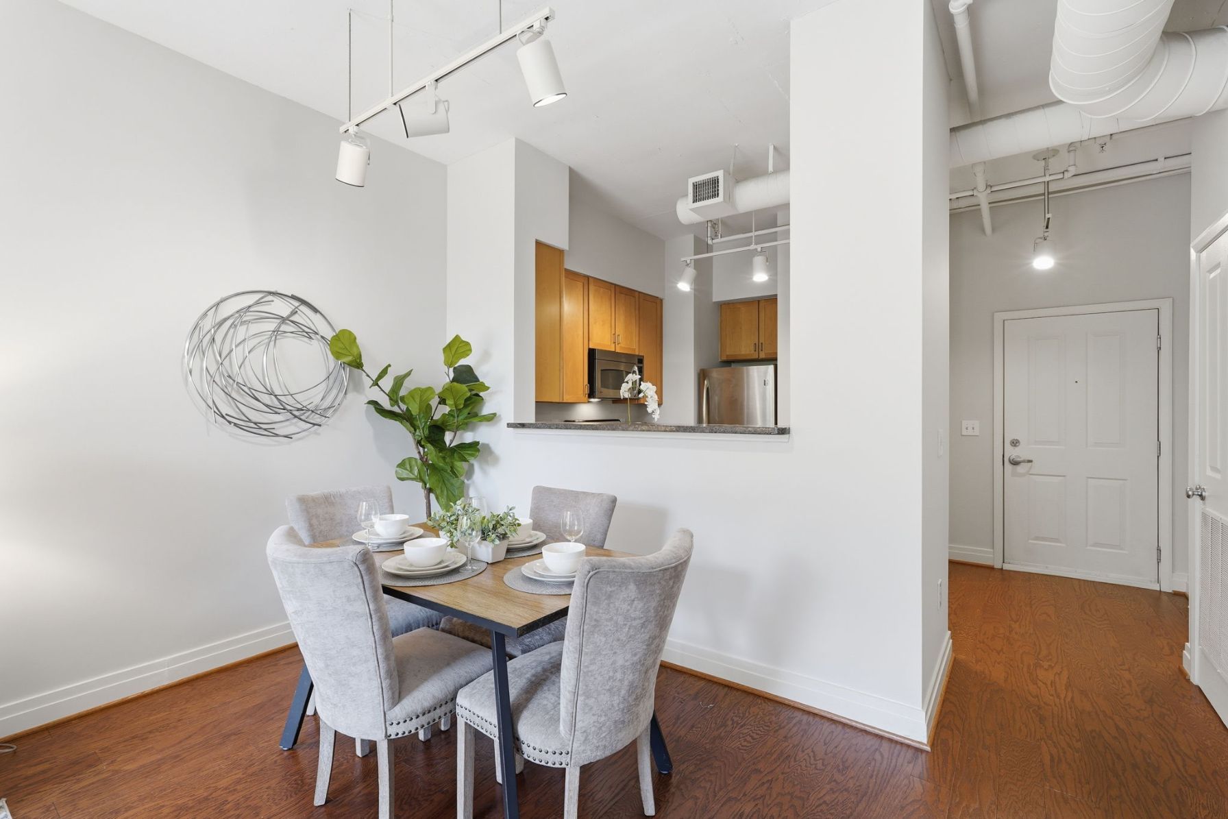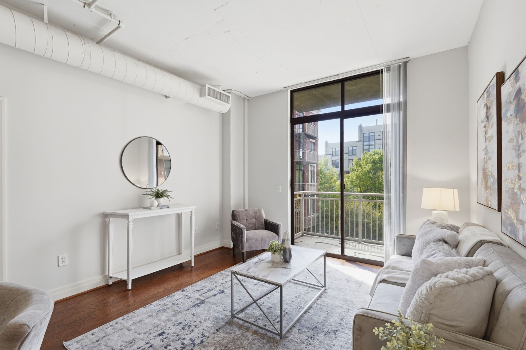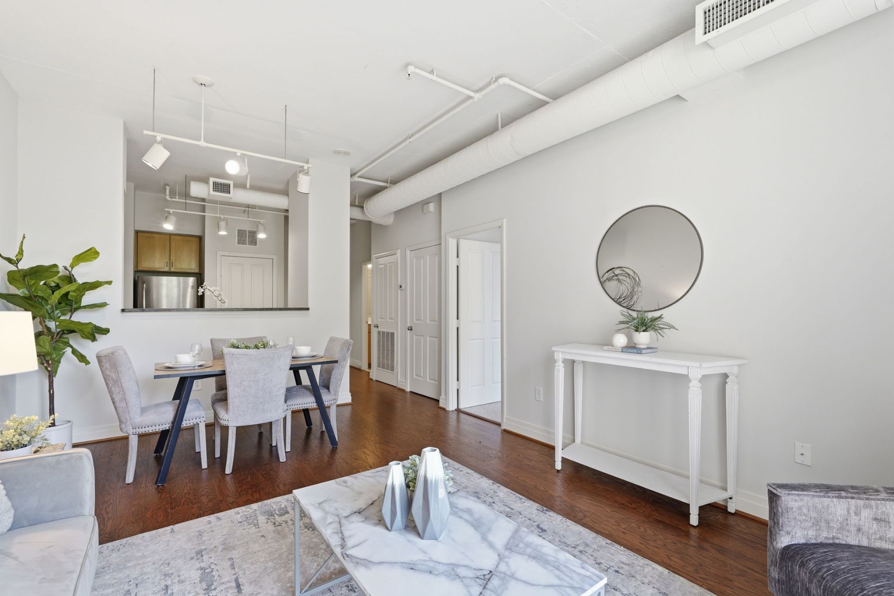 Welcome to Unit 401 at the Residences at Station Square, a beautifully updated loft-style one-bedroom in the heart of Clarendon, where modern comfort meets industrial-chic design.