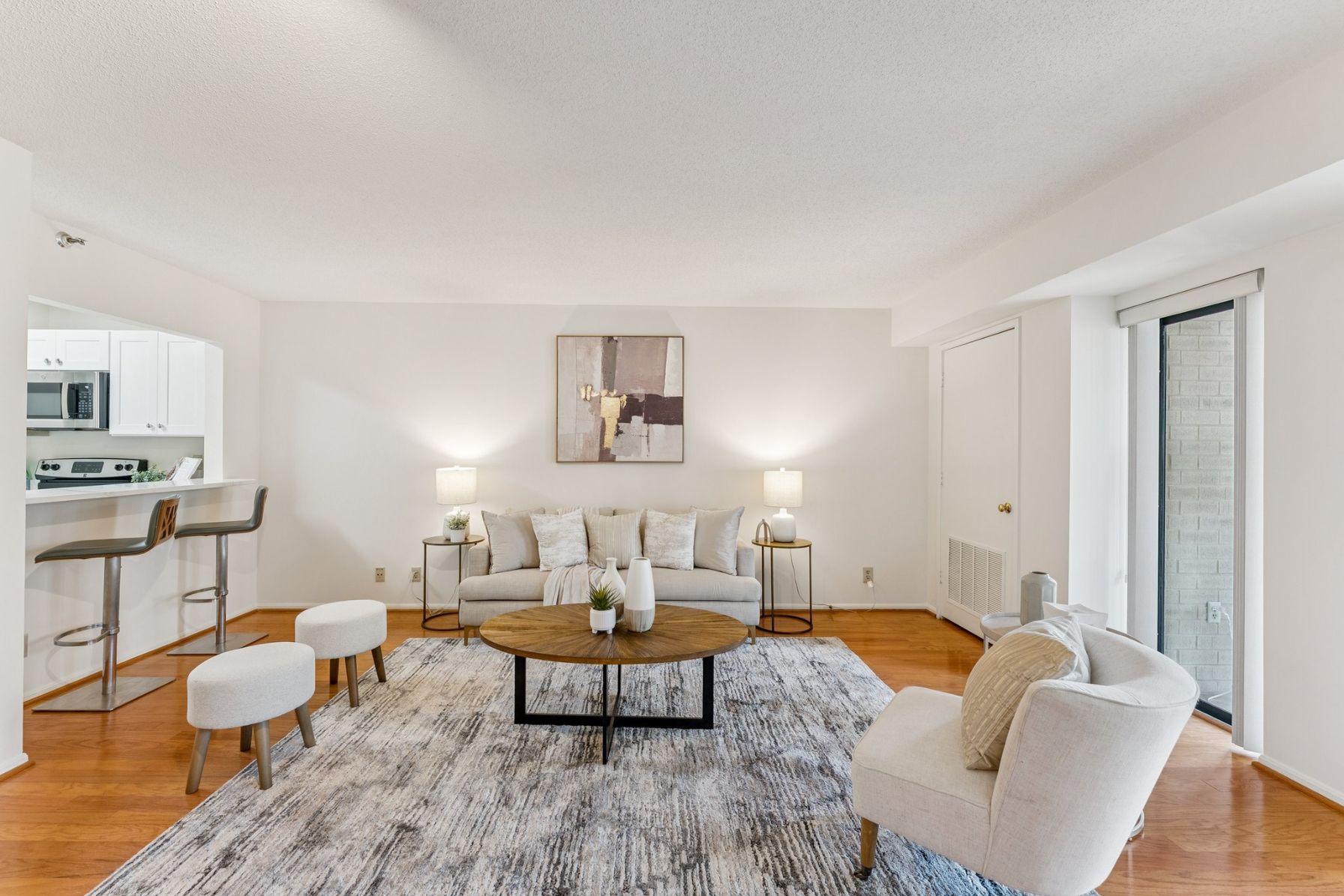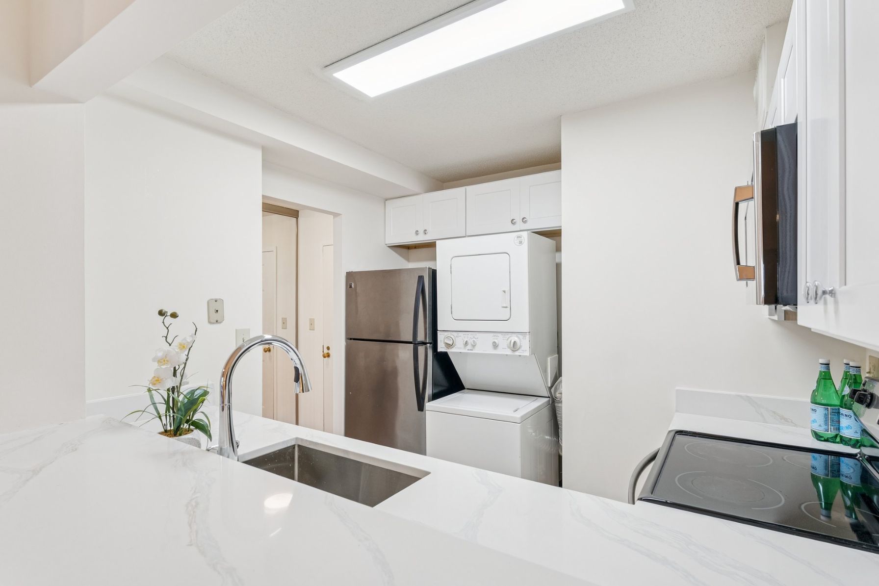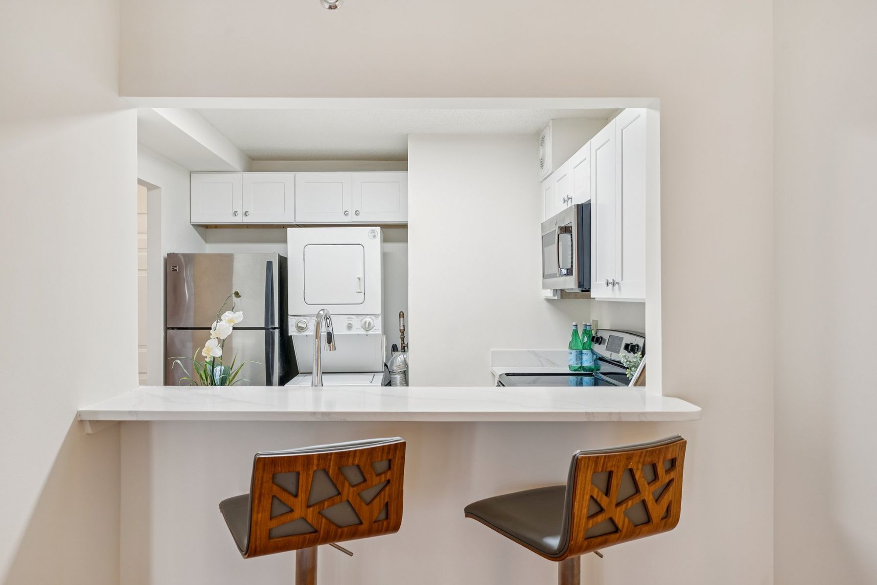 The newly renovated kitchen features new quartz countertops, stainless steel appliances, soft-close cabinetry, and a breakfast bar that opens to the living space.