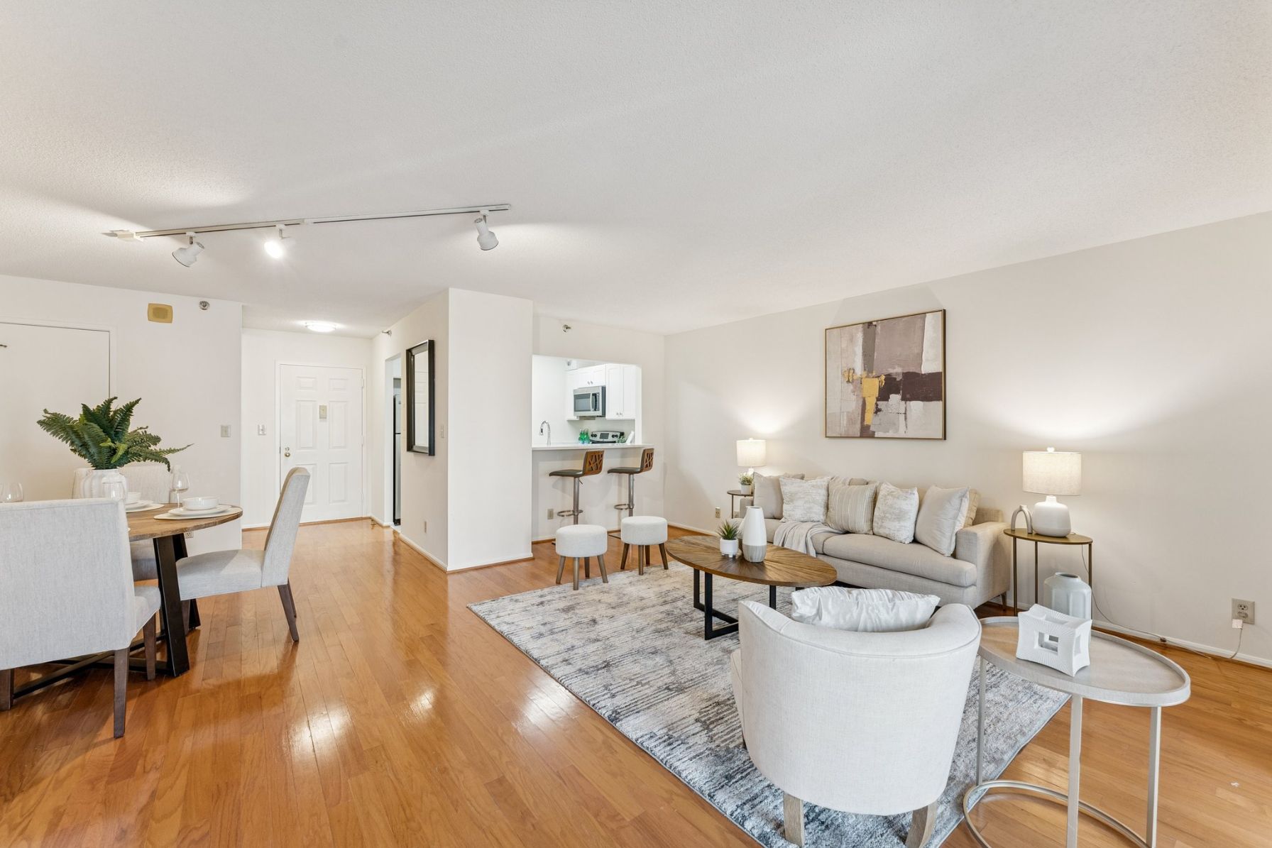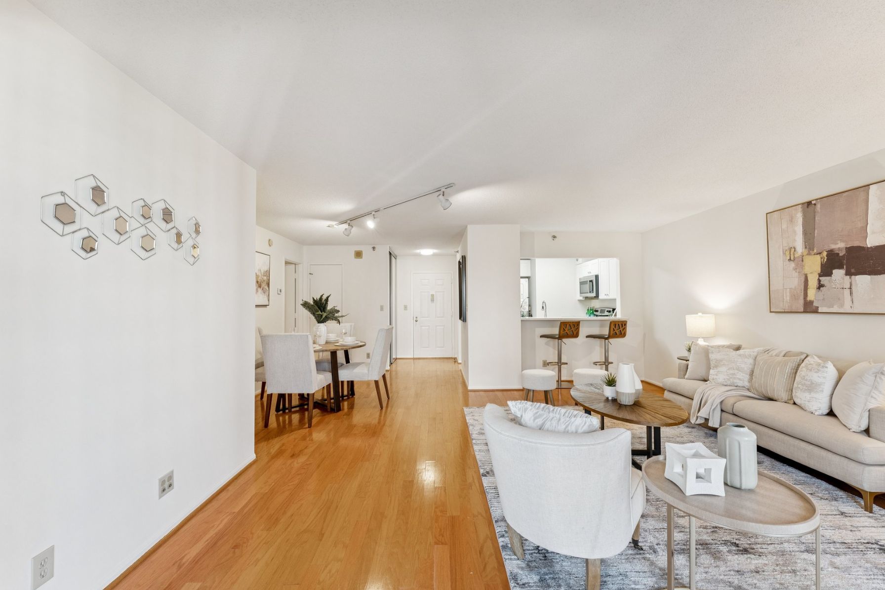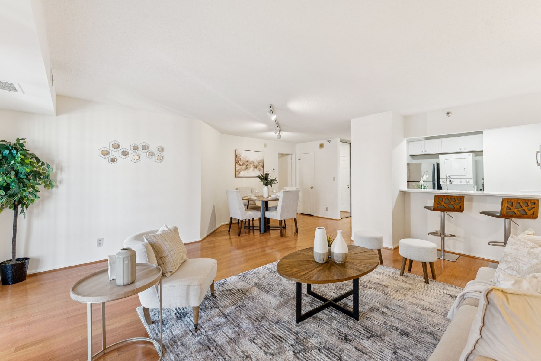 The newly renovated kitchen features new quartz countertops, stainless steel appliances, soft-close cabinetry, and a breakfast bar that opens to the living space.