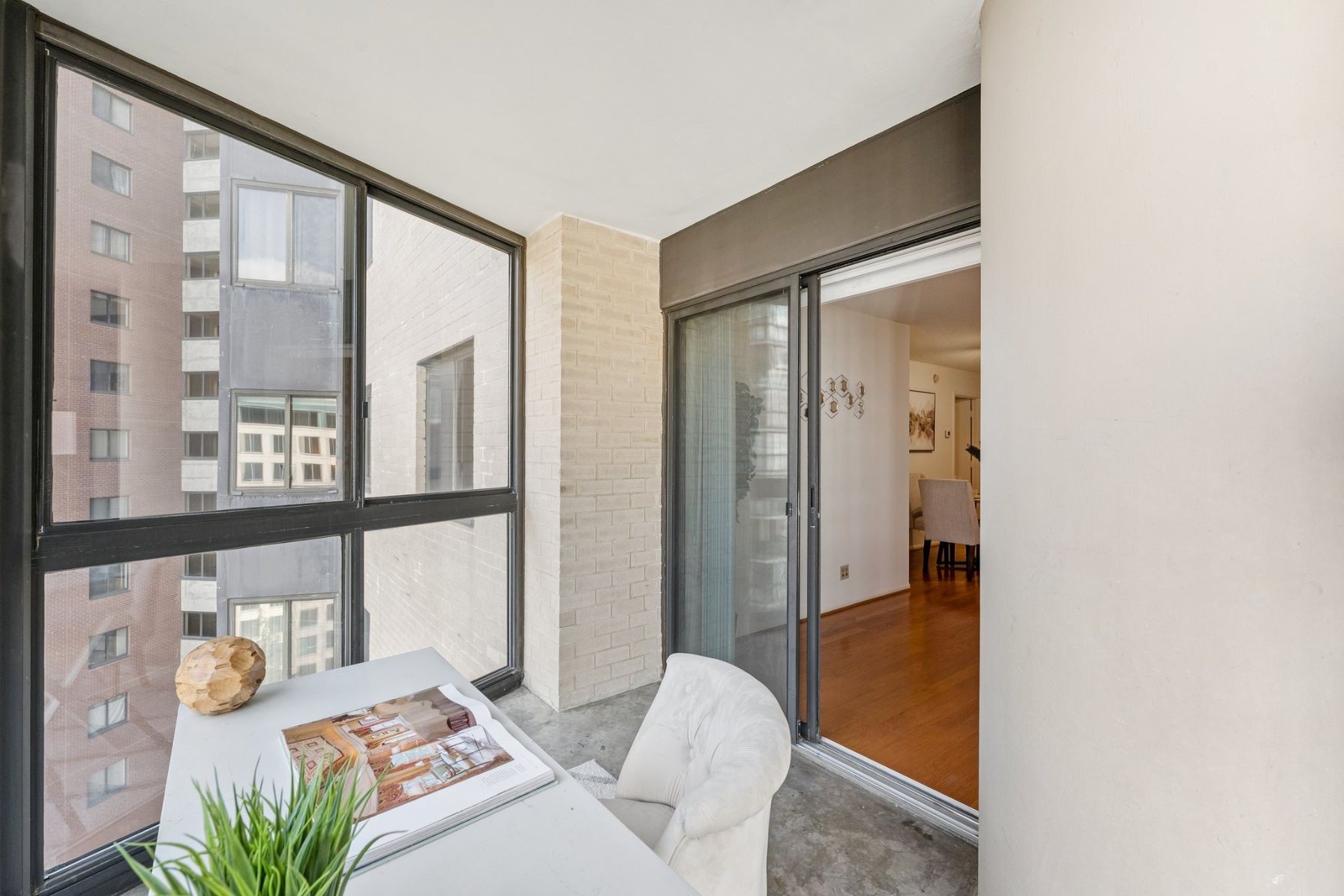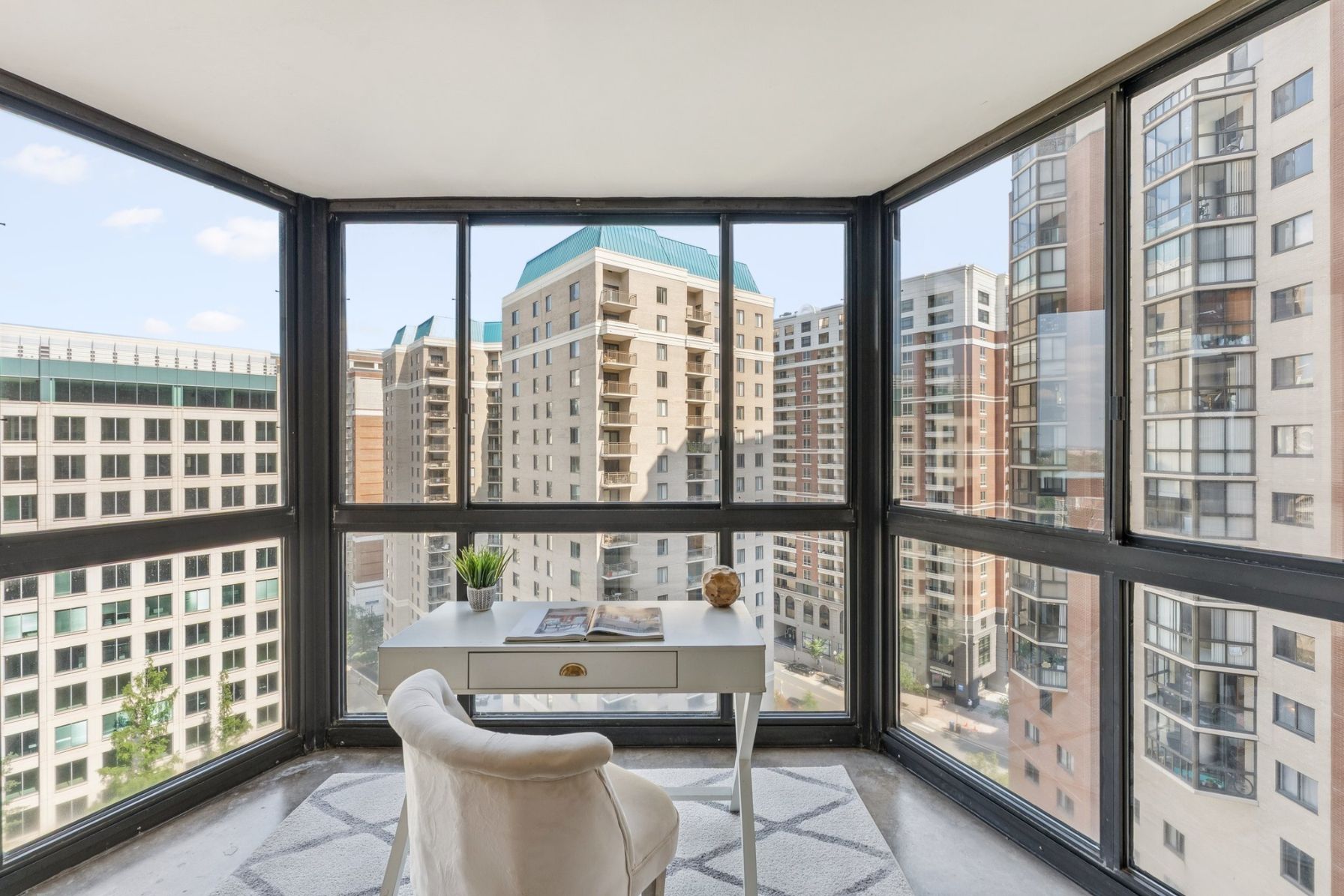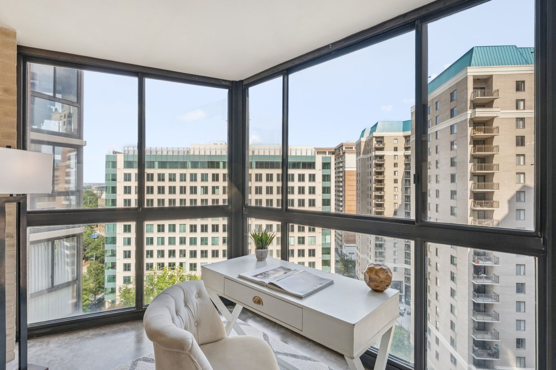 Open the door to oak hardwood floors that flow from the entry to the large living space and dedicated dining area. Sliding glass doors open to a stunning 15th floor sunroom with modern concrete floors and expansive views over Ballston.