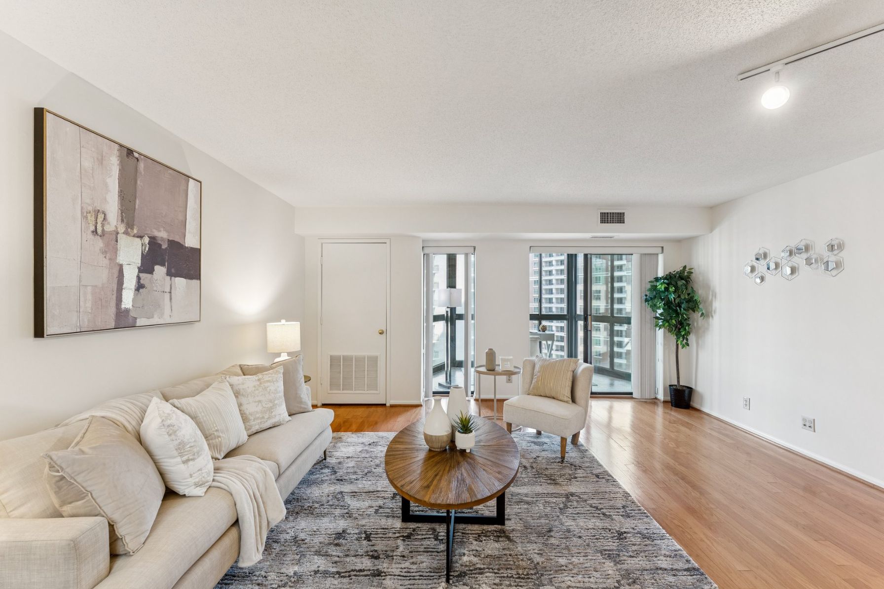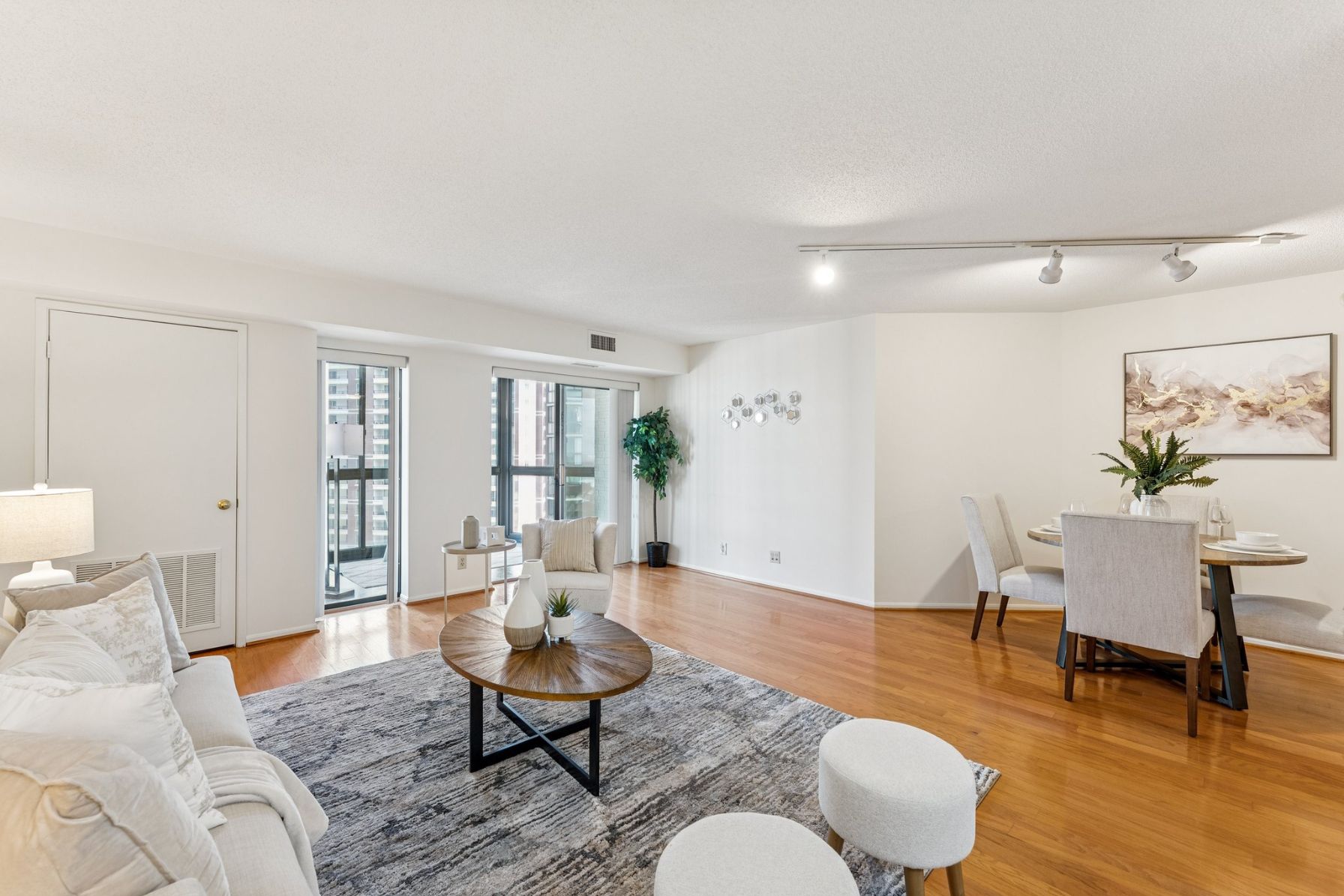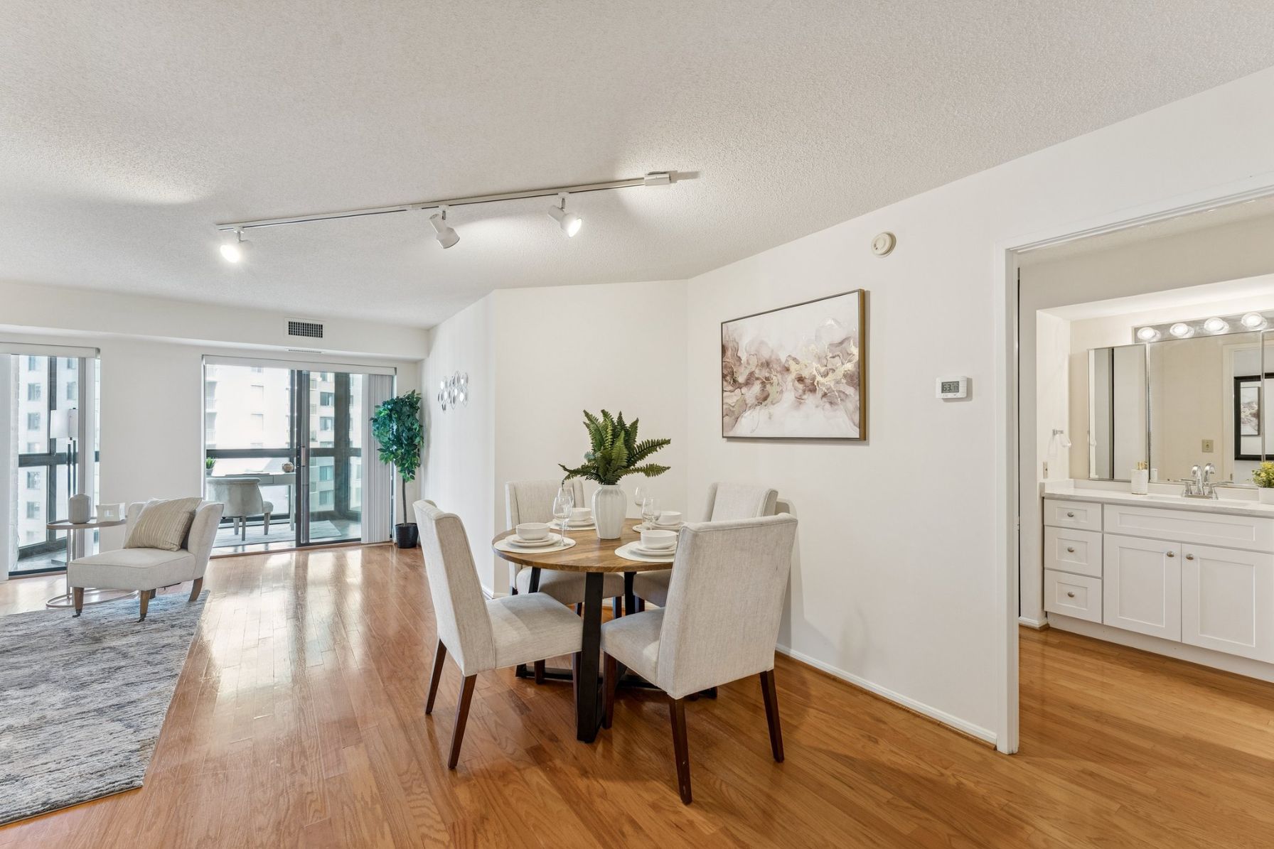 Open the door to oak hardwood floors that flow from the entry to the large living space and dedicated dining area. Sliding glass doors open to a stunning 15th floor sunroom with modern concrete floors and expansive views over Ballston.