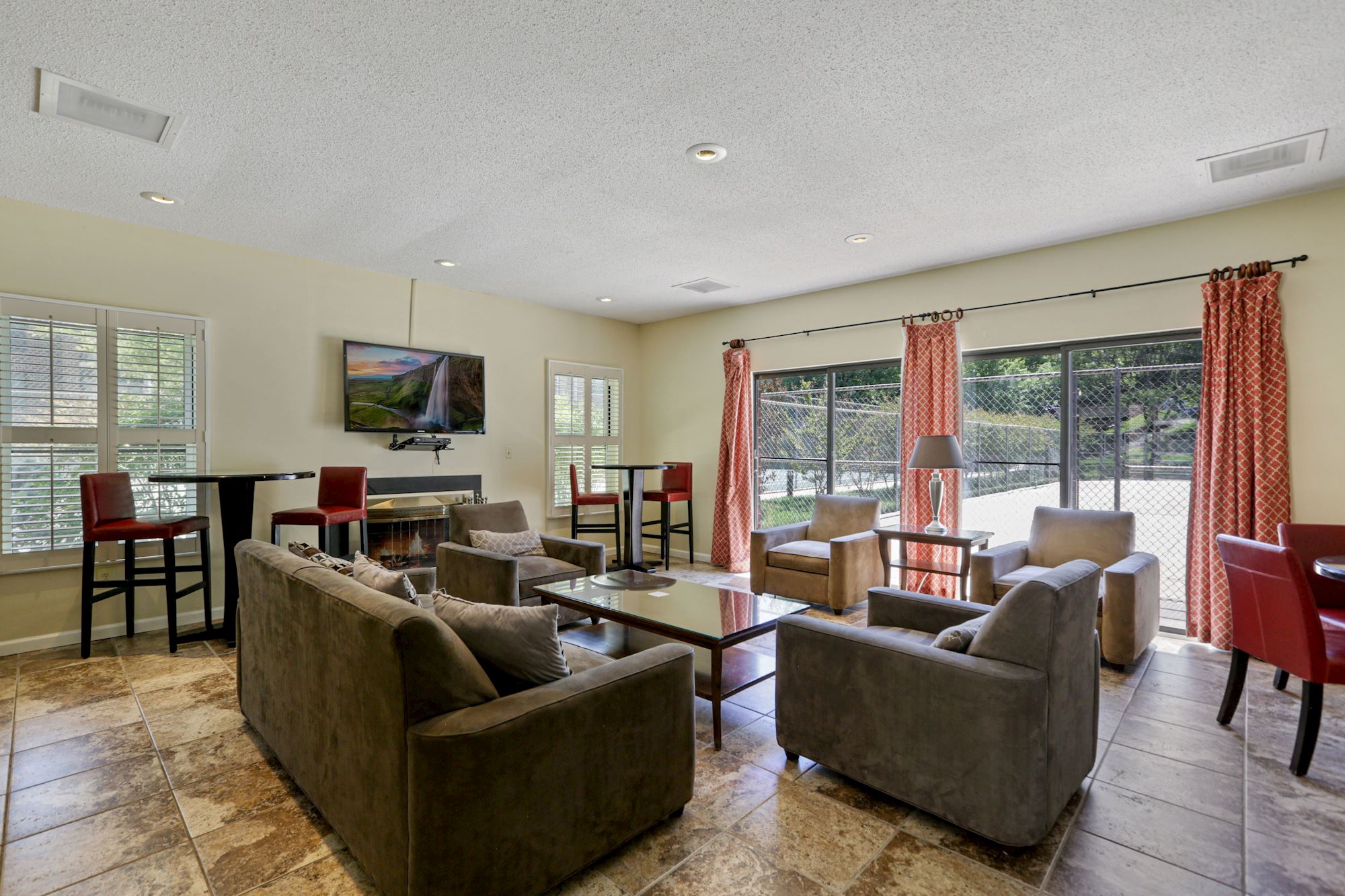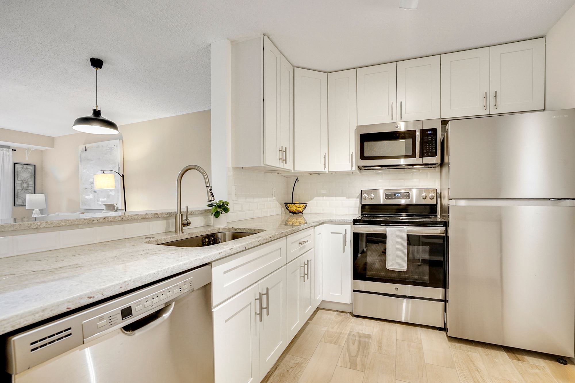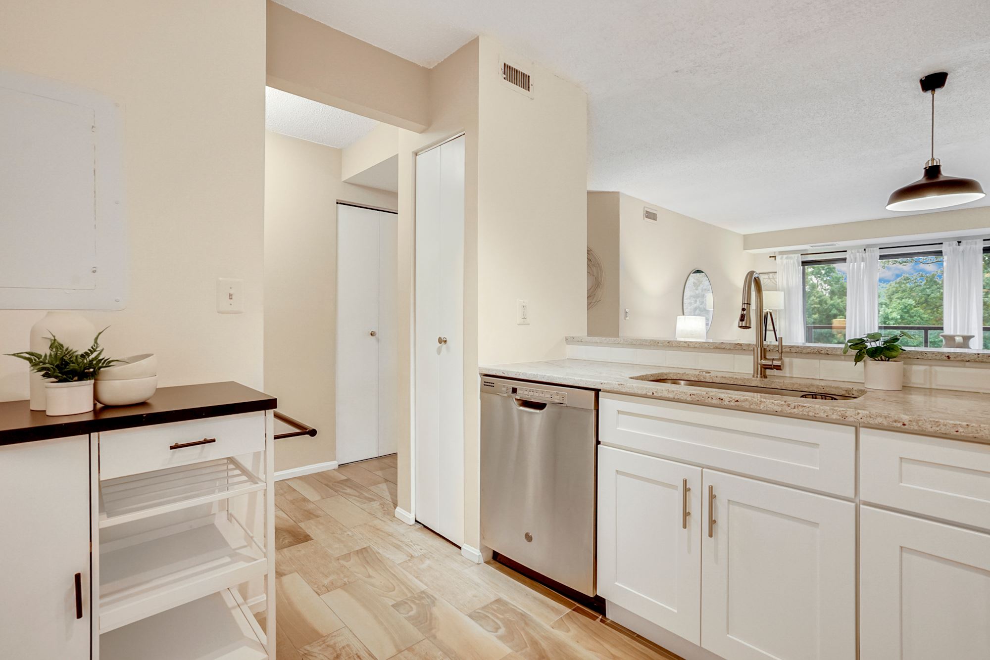 This top floor 2 bed 2 bath features quiet courtyard views, 1,000 sq ft of living space, is filled with natural light, & includes tons of modern renovations! A full kitchen renovation was done in 2018 to include beautiful grey/white granite counters, white tile backsplash, updated stainless steel appliances, modern wood–like tile floors, & updated cabinets. The kitchen has room for an island (a pre-existing island in photos conveys), has a pantry, and opens to the spacious living/dining space. Enjoy a cup of coffee or read in your own private, covered outdoor space with views of greenery & trees.