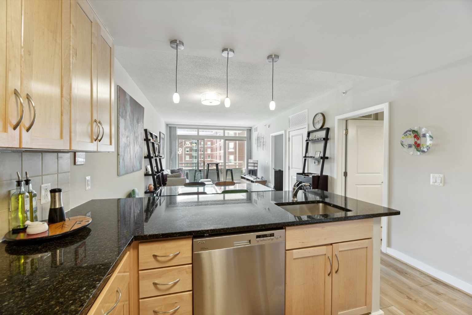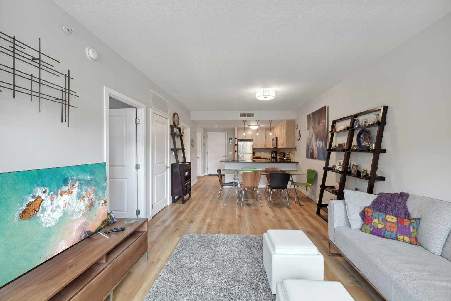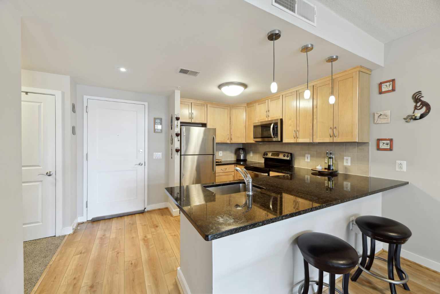 Enter the unit to new luxury vinyl floors installed in 2019 that extend throughout the main living space. The kitchen has granite counters accented by pendant lighting, and stainless steel appliances including a new microwave installed in 2020. A breakfast bar opens to the dining space that flows into the large living room with sliding glass doors that open to a private balcony.