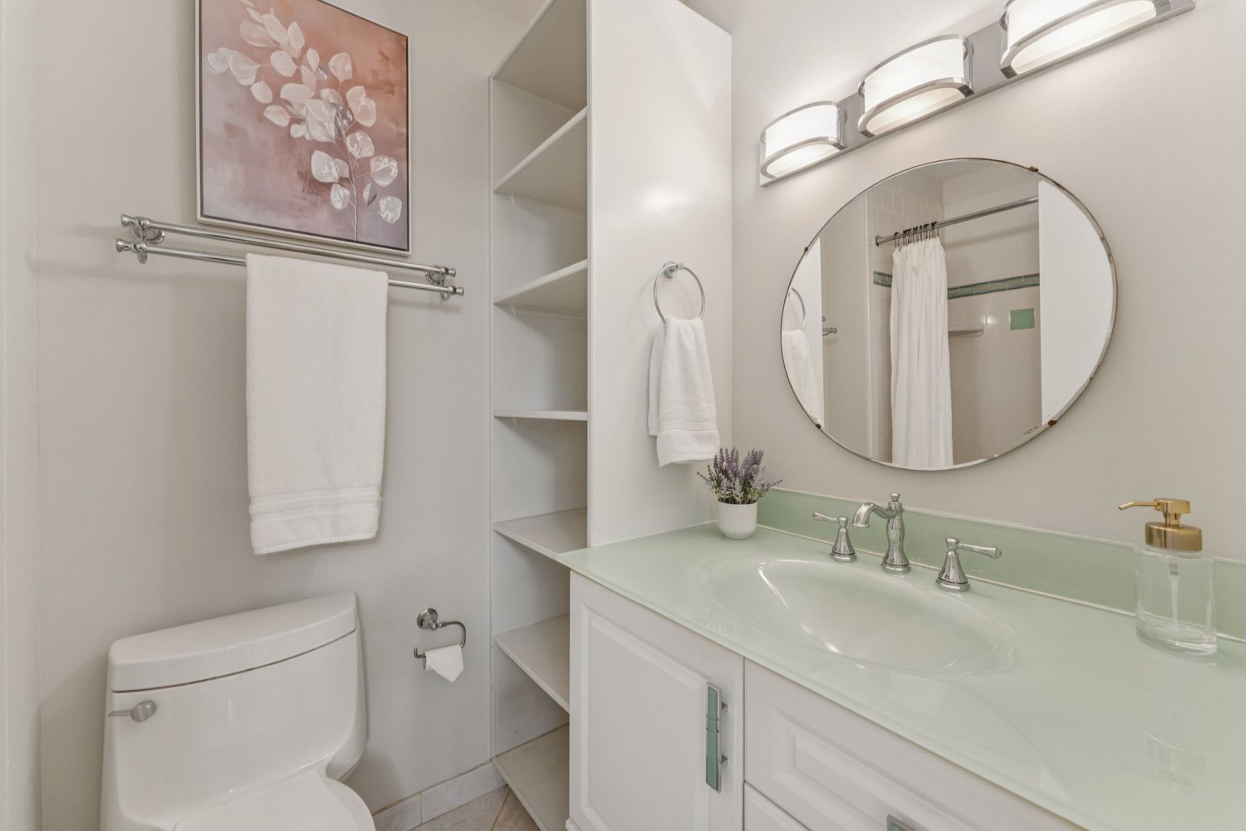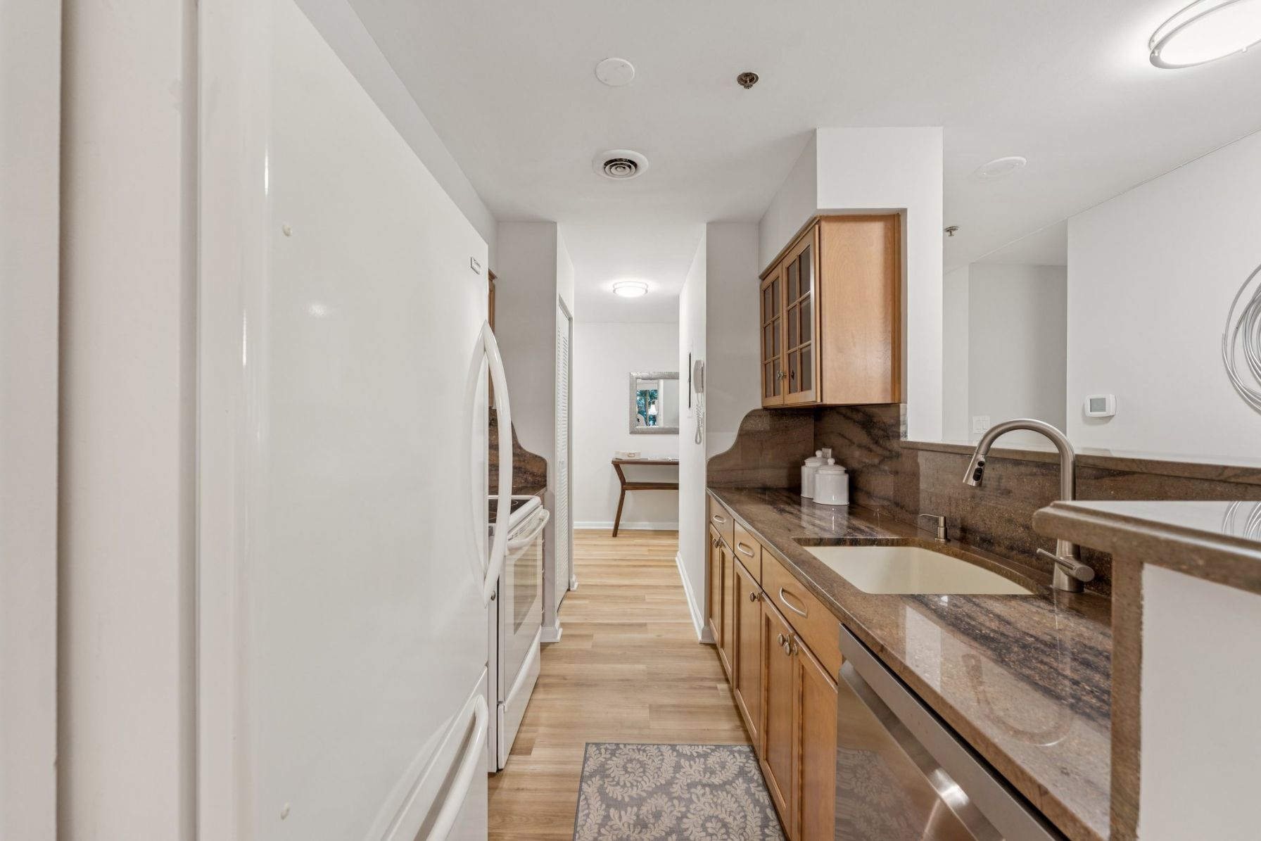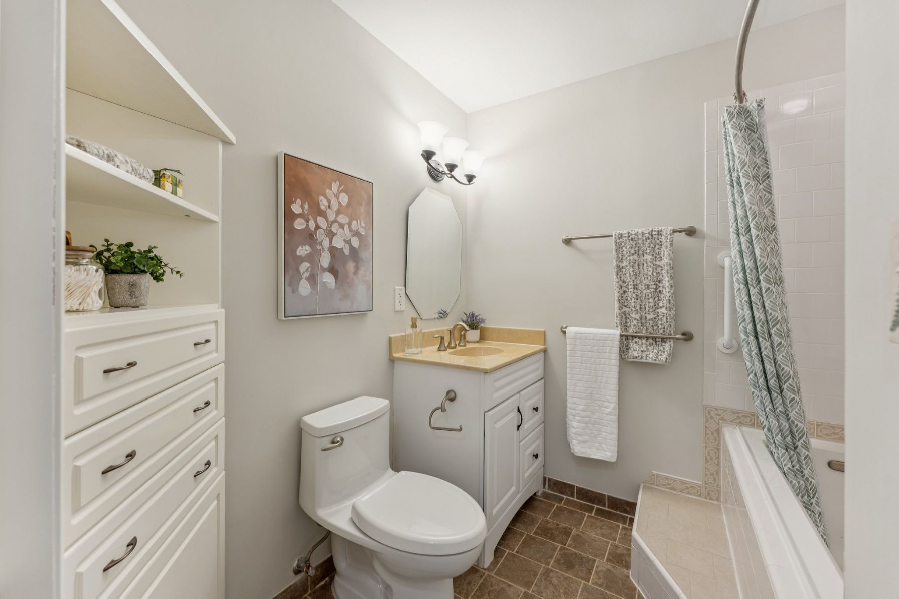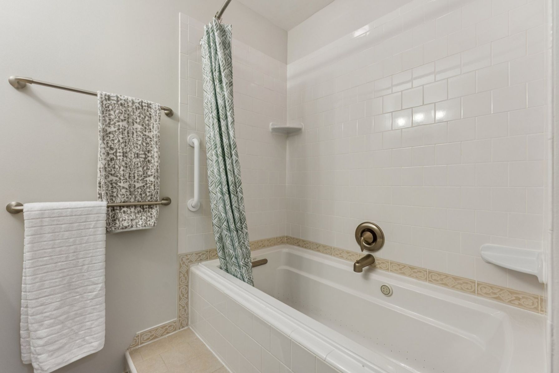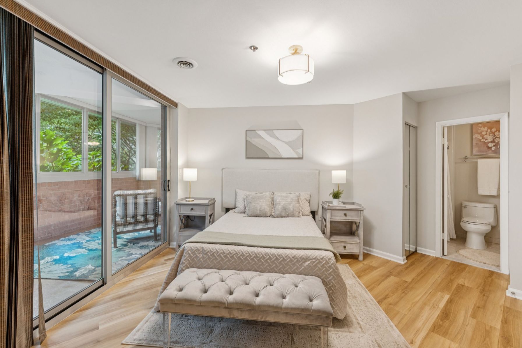Down a hallway from the living space is the primary suite, complete with multiple closets and a private bath showcasing a stand-up shower with white subway tile and blue accents. Sliding glass doors in the bedroom open to the opposite end of the large sunroom. The large second bedroom has ample closet space with the second full bathroom featuring a step-up jetted tub located just outside the door. Garage parking space #1119 conveys.