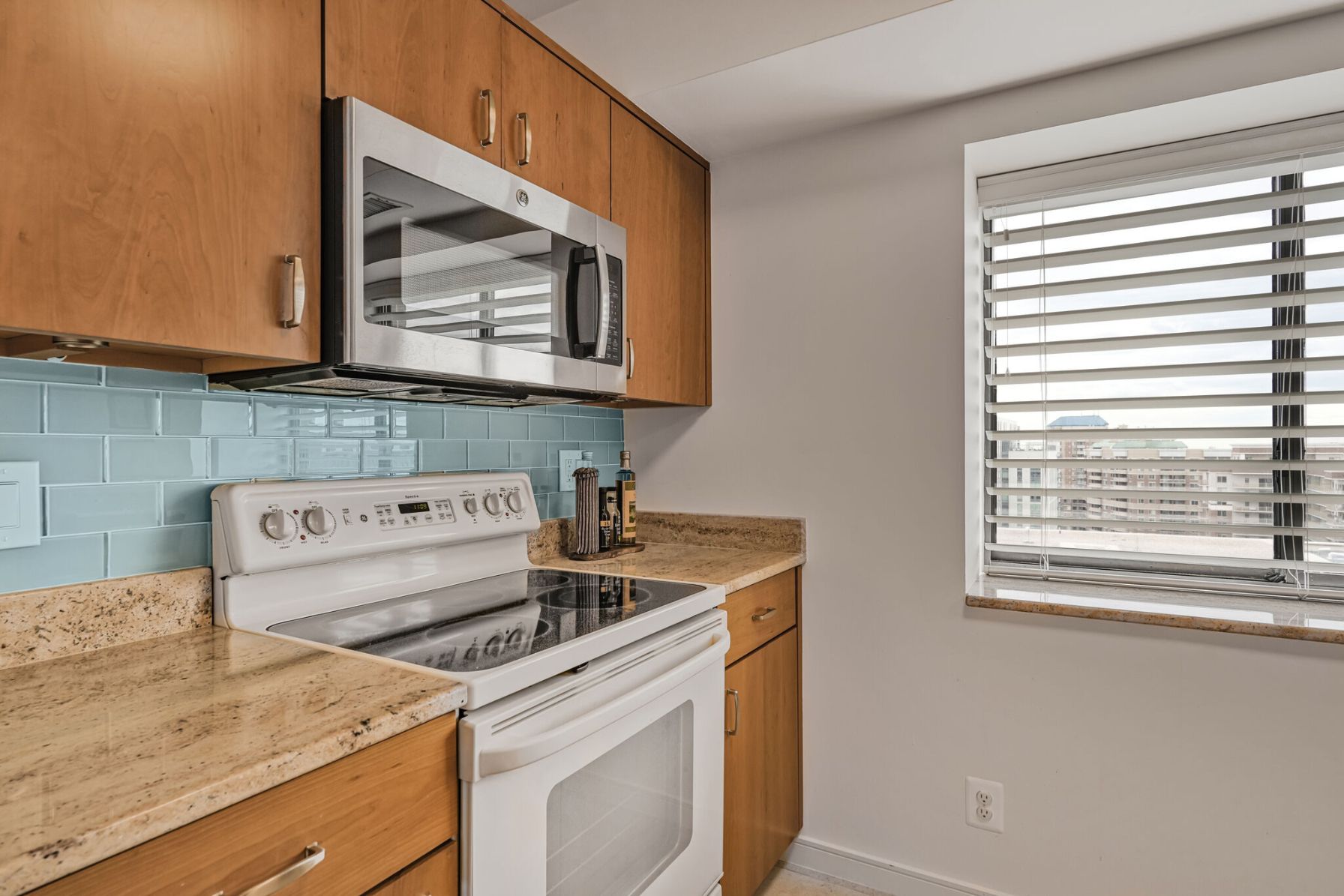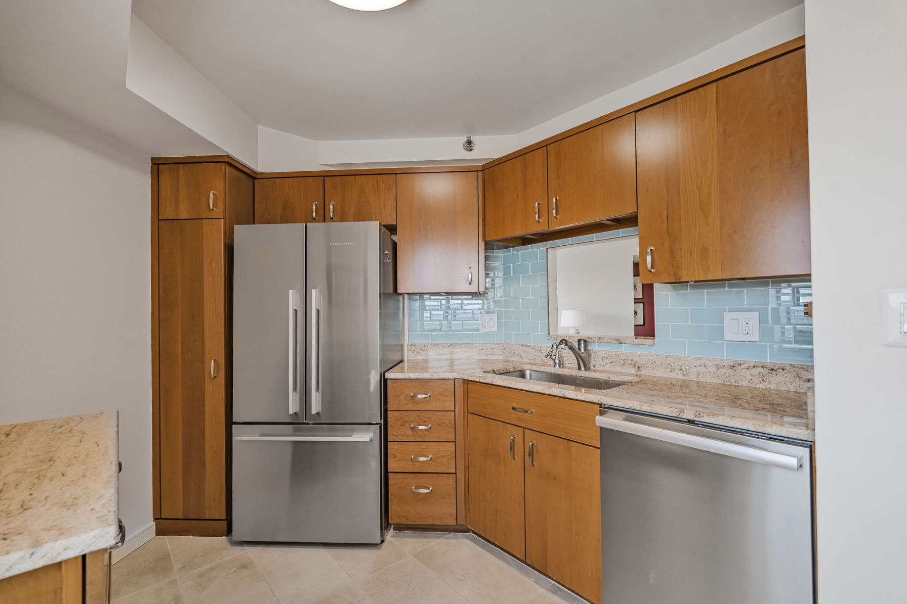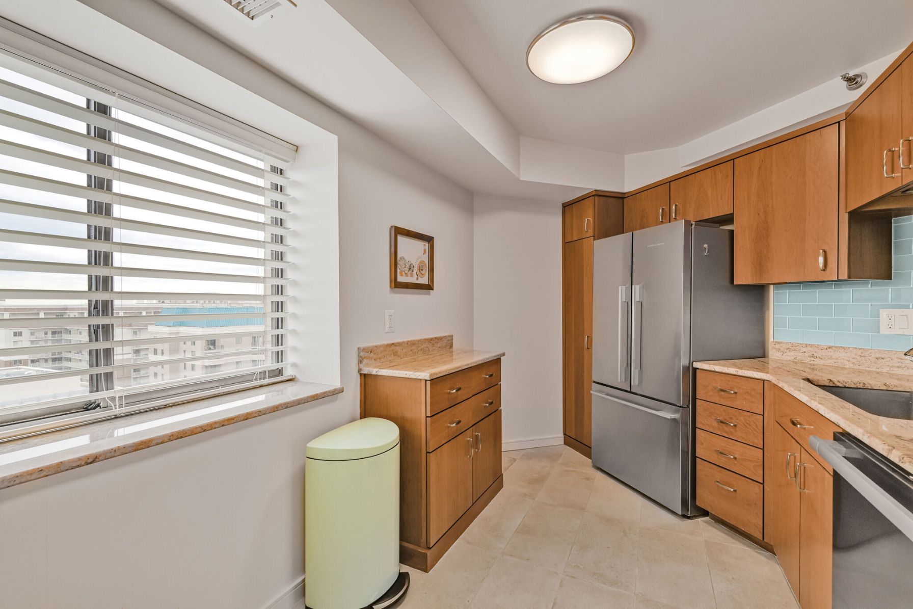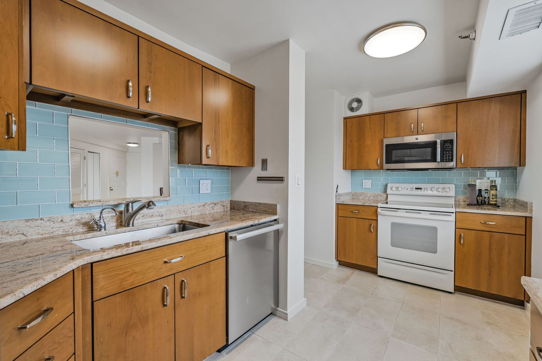 The renovated kitchen features soft-close cabinetry, exotic granite countertops, a light blue glass tile backsplash, and premium appliances, including a Fisher & Paykel refrigerator, Miele dishwasher, and GE range and microwave. A pass-through to the living area adds light and connection, making the kitchen feel even more inviting.
