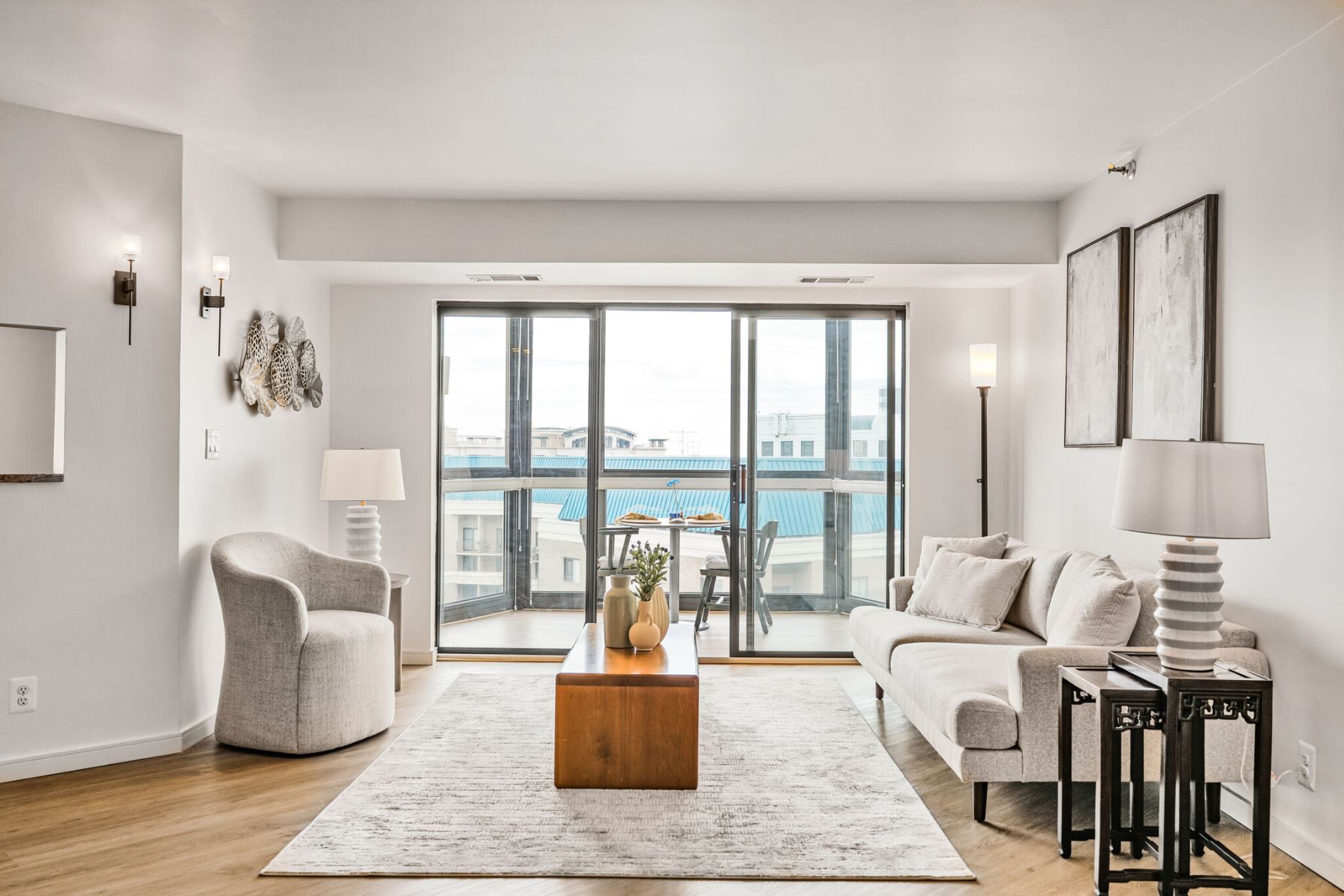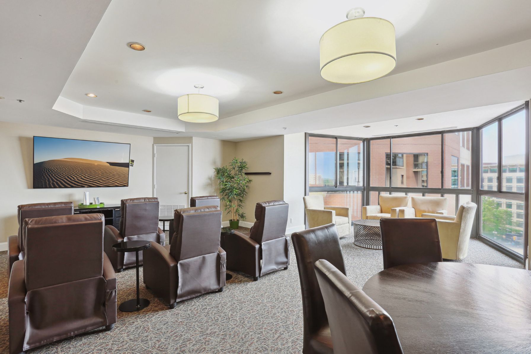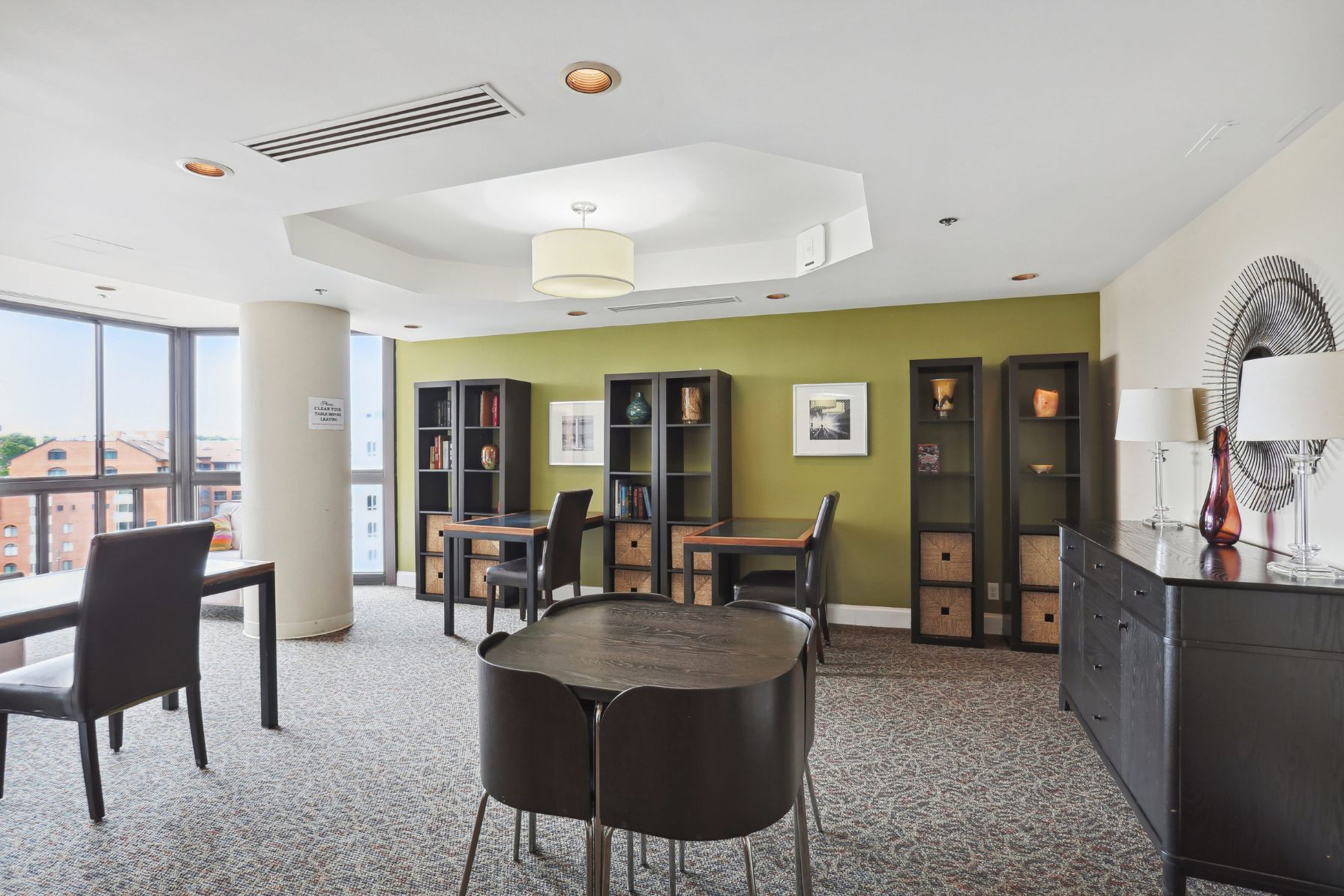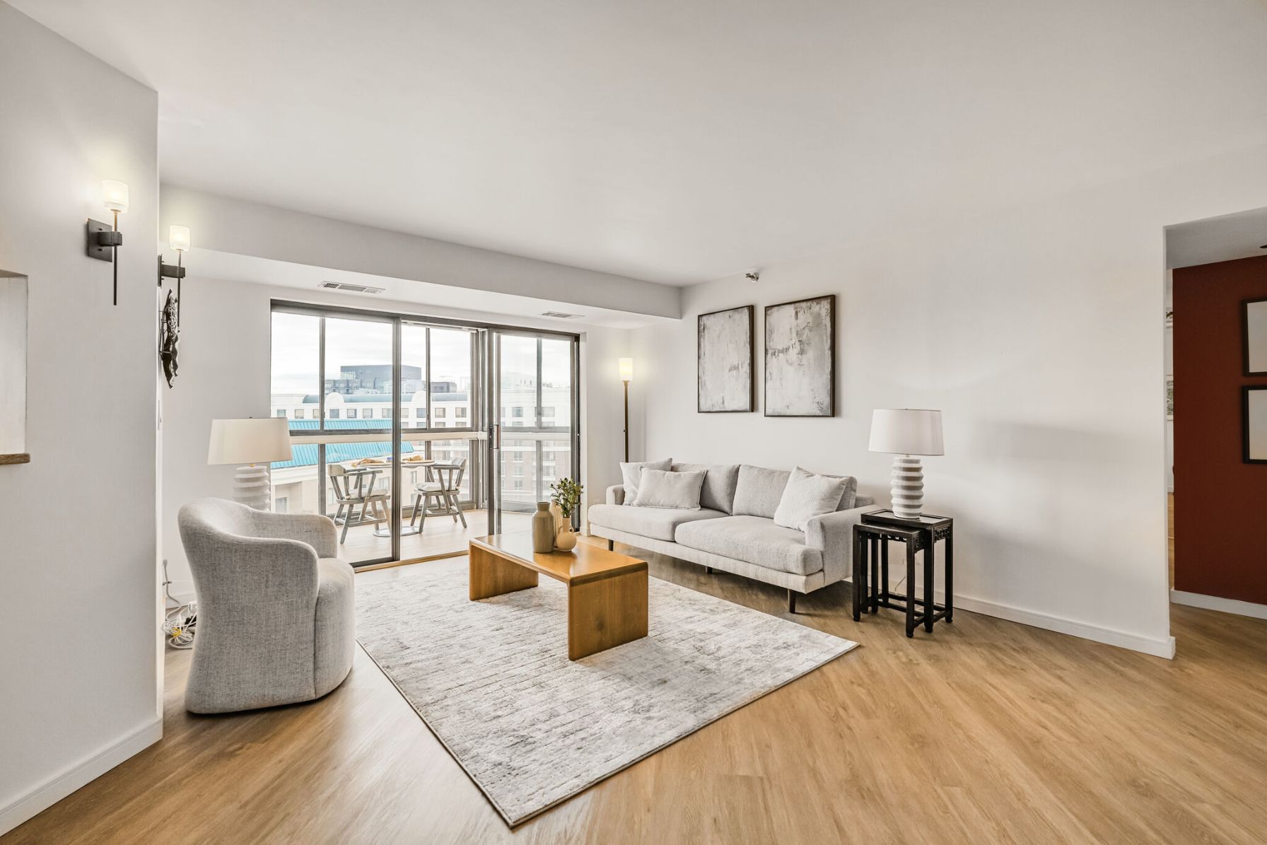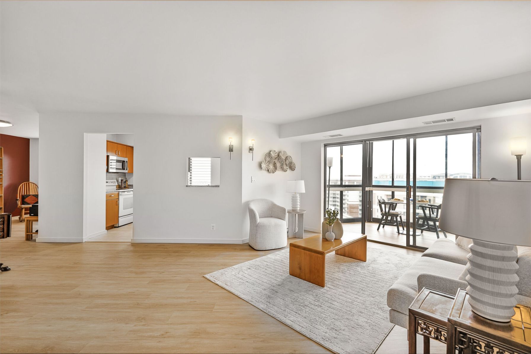 The spacious living room features sliding glass doors that lead to a 23rd-floor sunroom — an ideal spot to take in stunning views of Arlington, the National Cathedral, and beyond. The living area flows seamlessly into a dedicated dining space with a bold accent wall — perfect for dinner parties or everyday living.