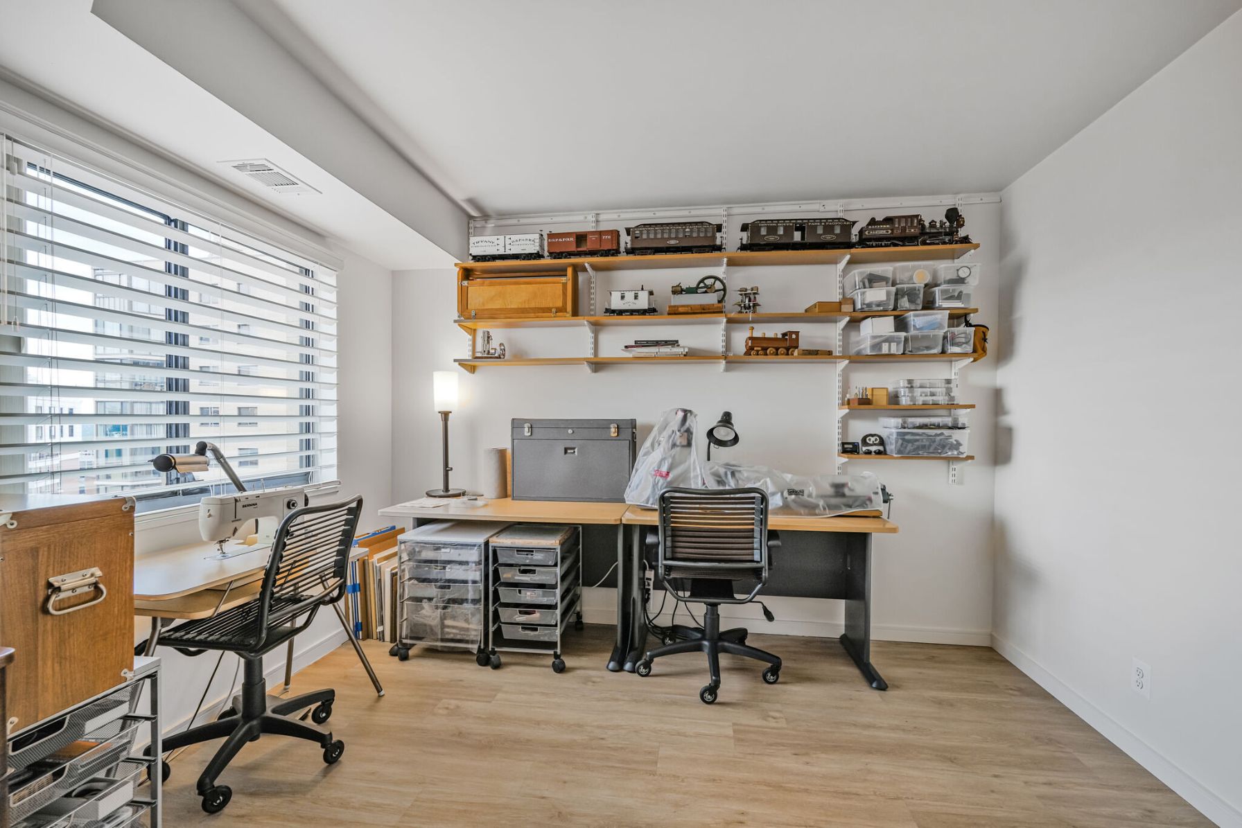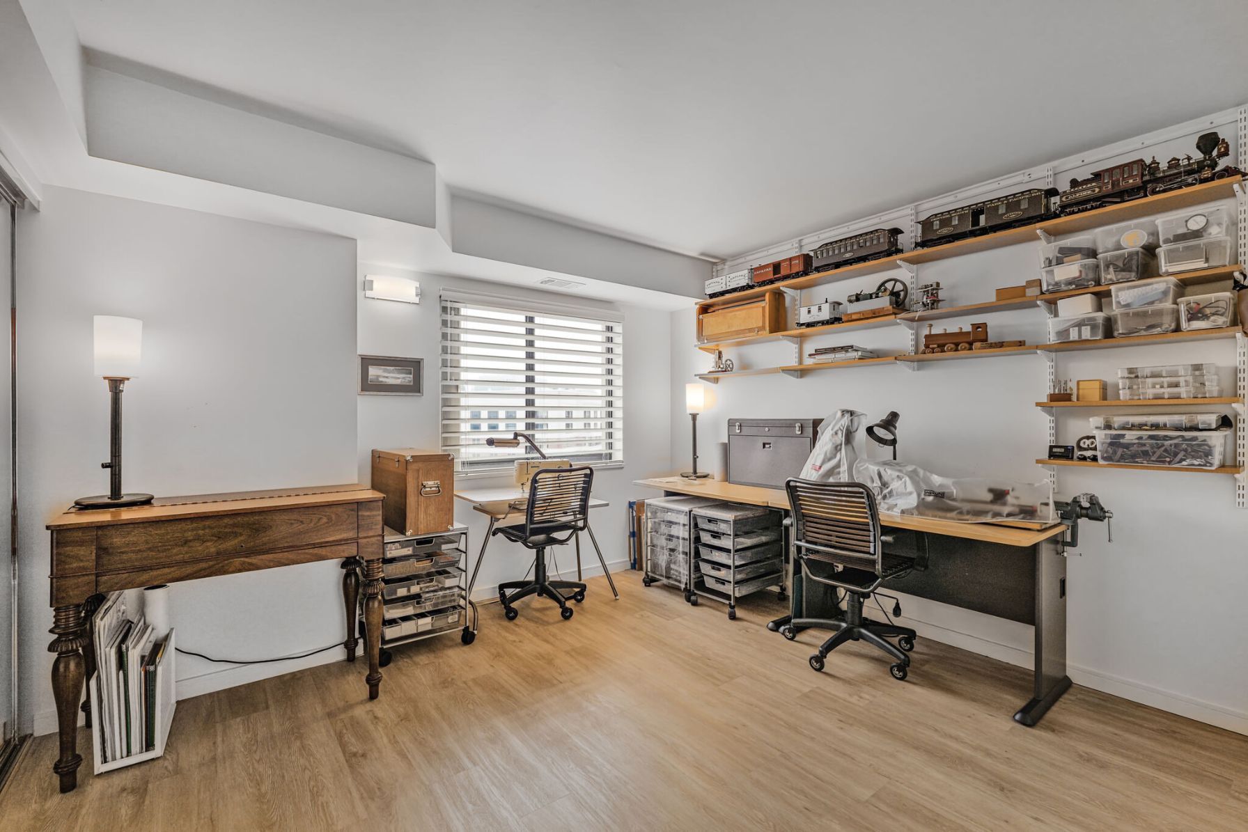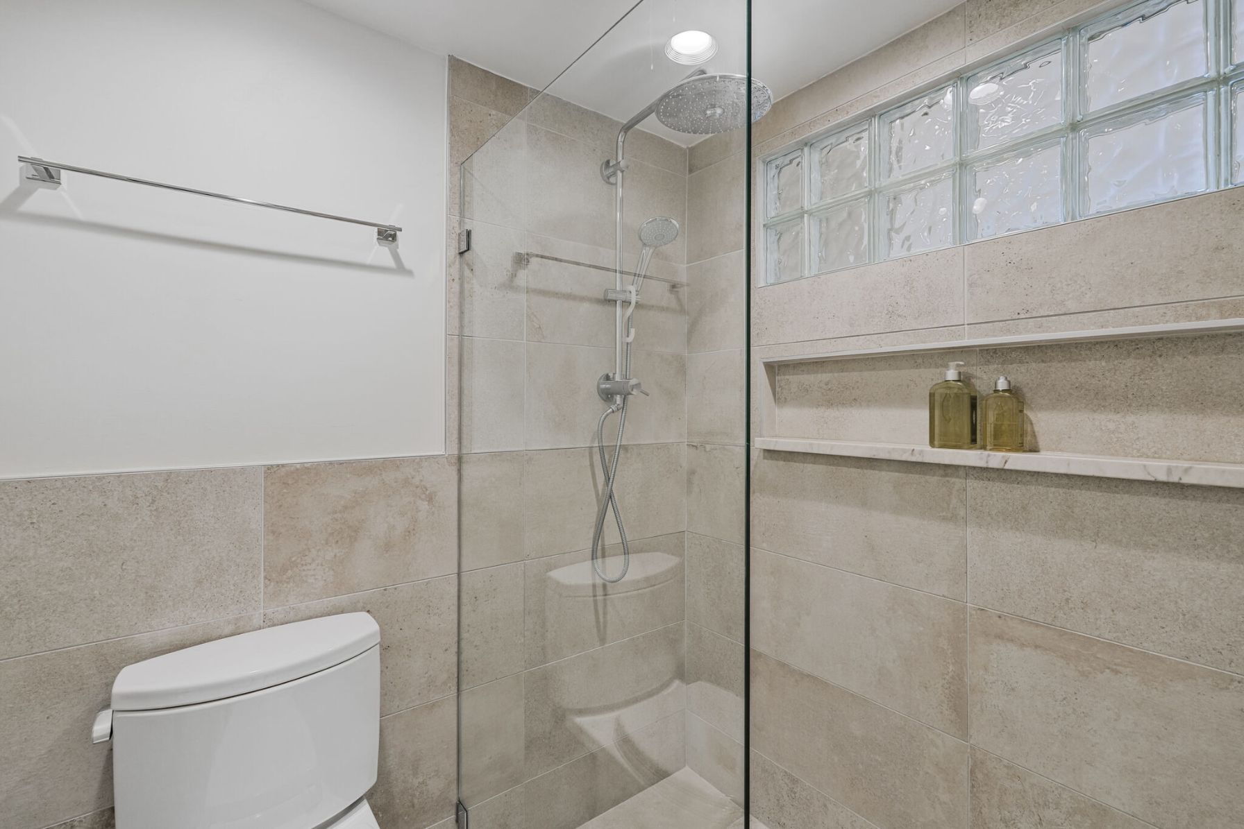 Just off the kitchen and living room is a large den, an ideal space for a home office, TV room, or library. Down the hallway, the first of two bedrooms offers generous closet space and easy access to the fully renovated hall bathroom. This bathroom features a shower with a modern glass shower door, updated ceramic tile, a stylish vanity topped with quartz, and an LED-lit mirror for a clean, modern feel. Further down the hall, the spacious owner’s suite offers comfort and privacy, with large windows overlooking Ballston. The en-suite bathroom has been completely reimagined into a true retreat, starting with a stunning glass brick window that fills the updated walk-in shower with natural light. The updated vanity is topped with quartz with soft-close drawers and plenty of storage, with the warmth of a heated tile floor beneath your feet. The bathroom ends with a large, custom walk-in closet, offering a truly unique and functional space. One convenient parking space and an extra storage locker are conveyed.