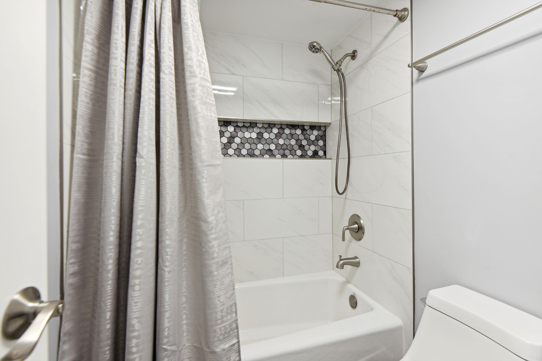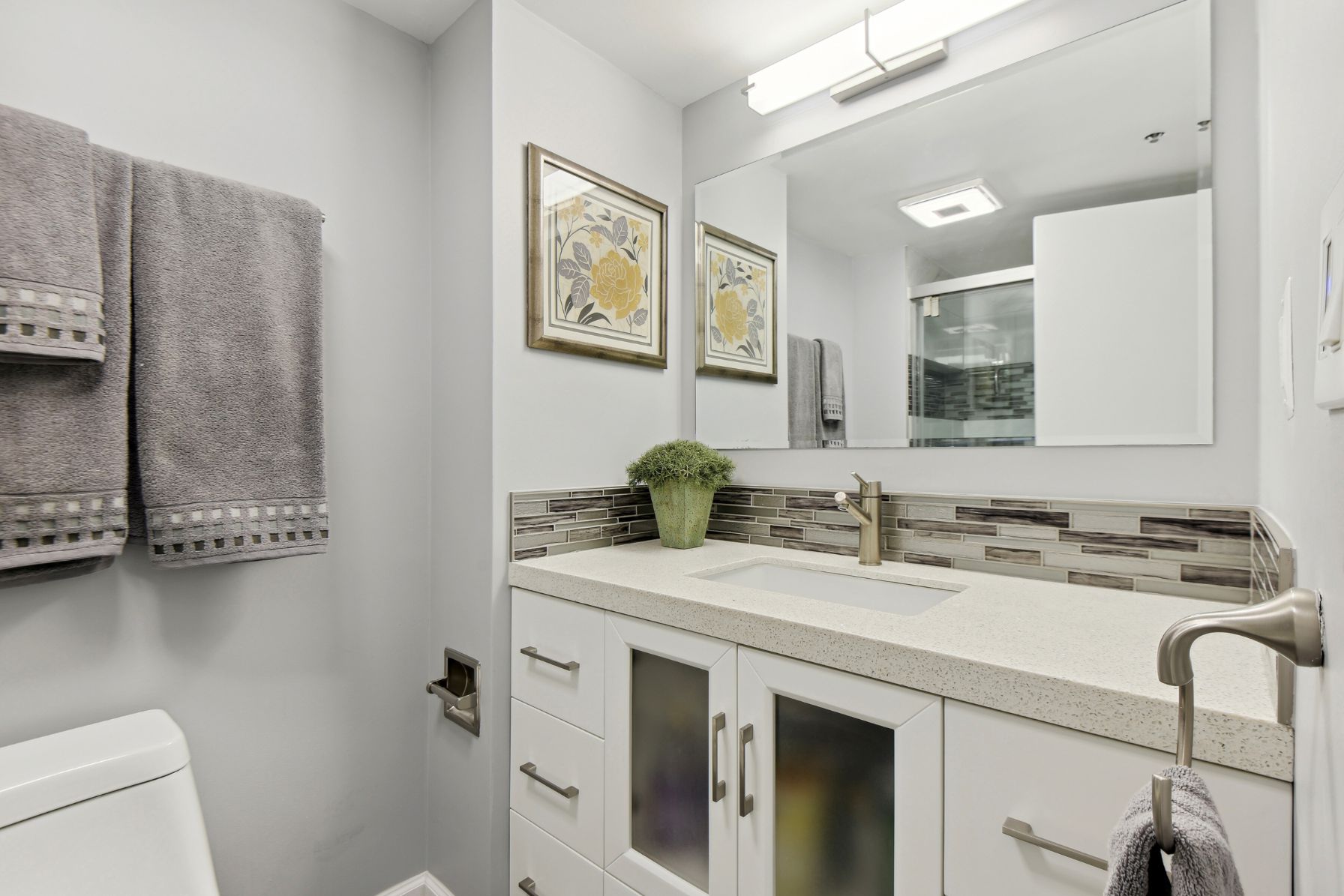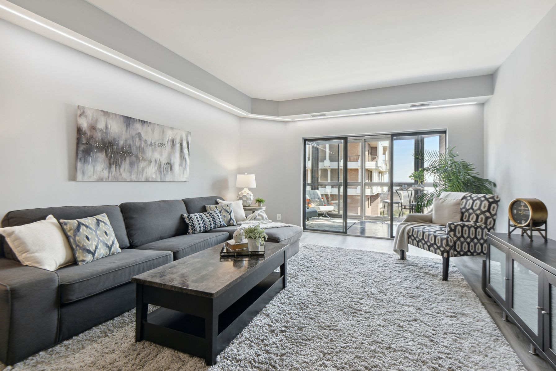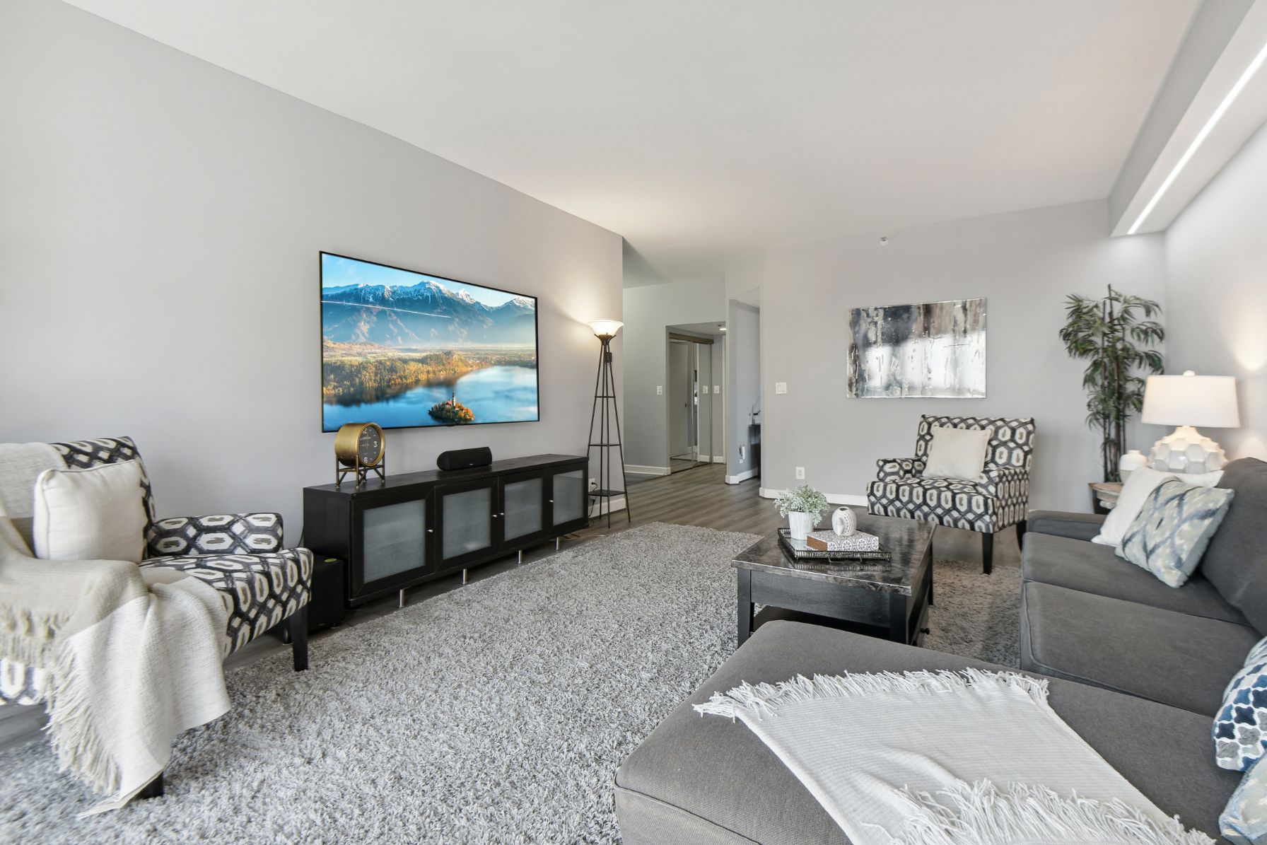 The bedrooms have also been updated with new windows and blinds, carpeting with dynamic acoustic underlay, and additional top shelves in the closets. The primary bathroom comes equipped with a double sink vanity, quartz countertops, glass mosaic backsplash, porcelain tile walls, and a Kohler cast iron bathtub. The new multi-function fan with a night light, main light, exhaust fan, and Bluetooth music speaker adds to the luxurious ambiance. The second bathroom has also been updated with a new vanity, quartz countertop, Kohler cast iron shower base, sliding glass shower door, porcelain tile walls, and a new multi-function fan. This condo also features new switches and outlets throughout, with several USB outlets for added convenience, new hallway, and dining room lighting, and recessed LED lighting in the living room with dimming capability.