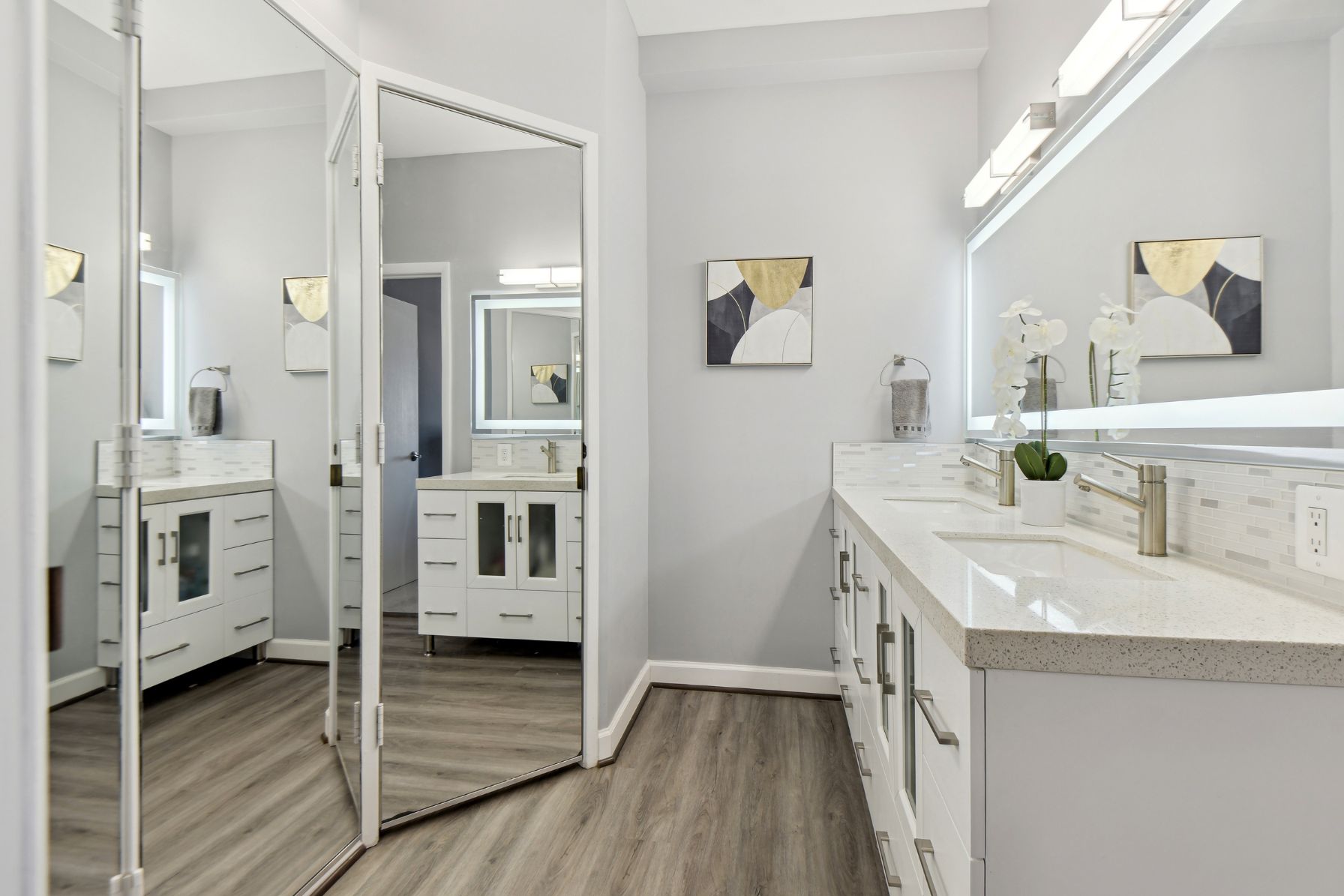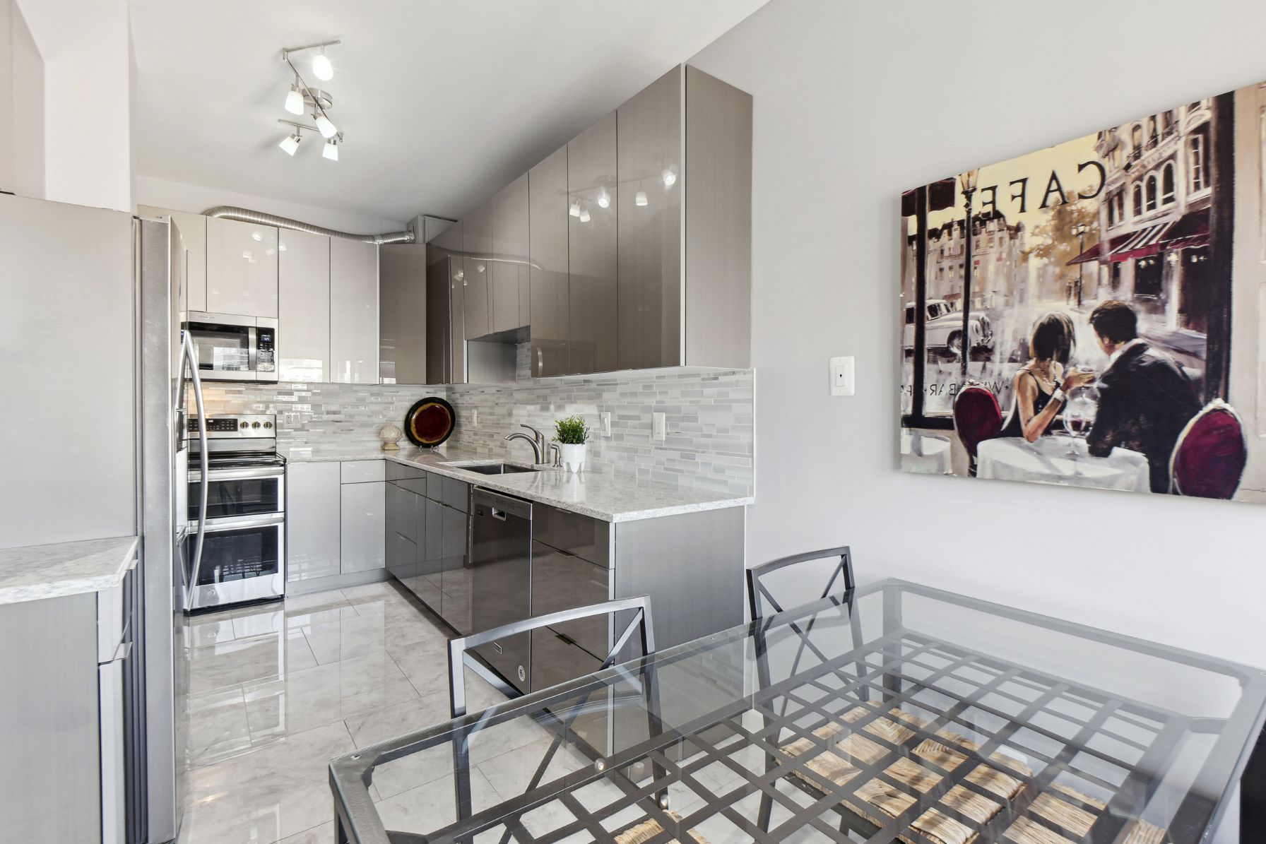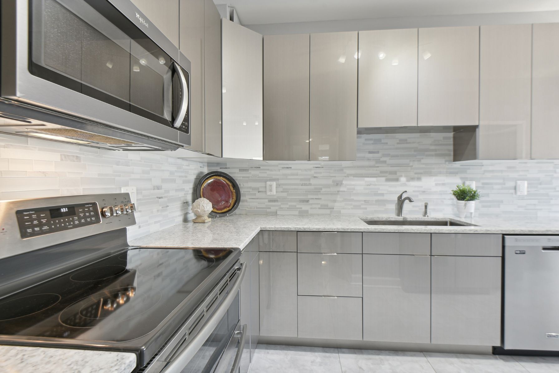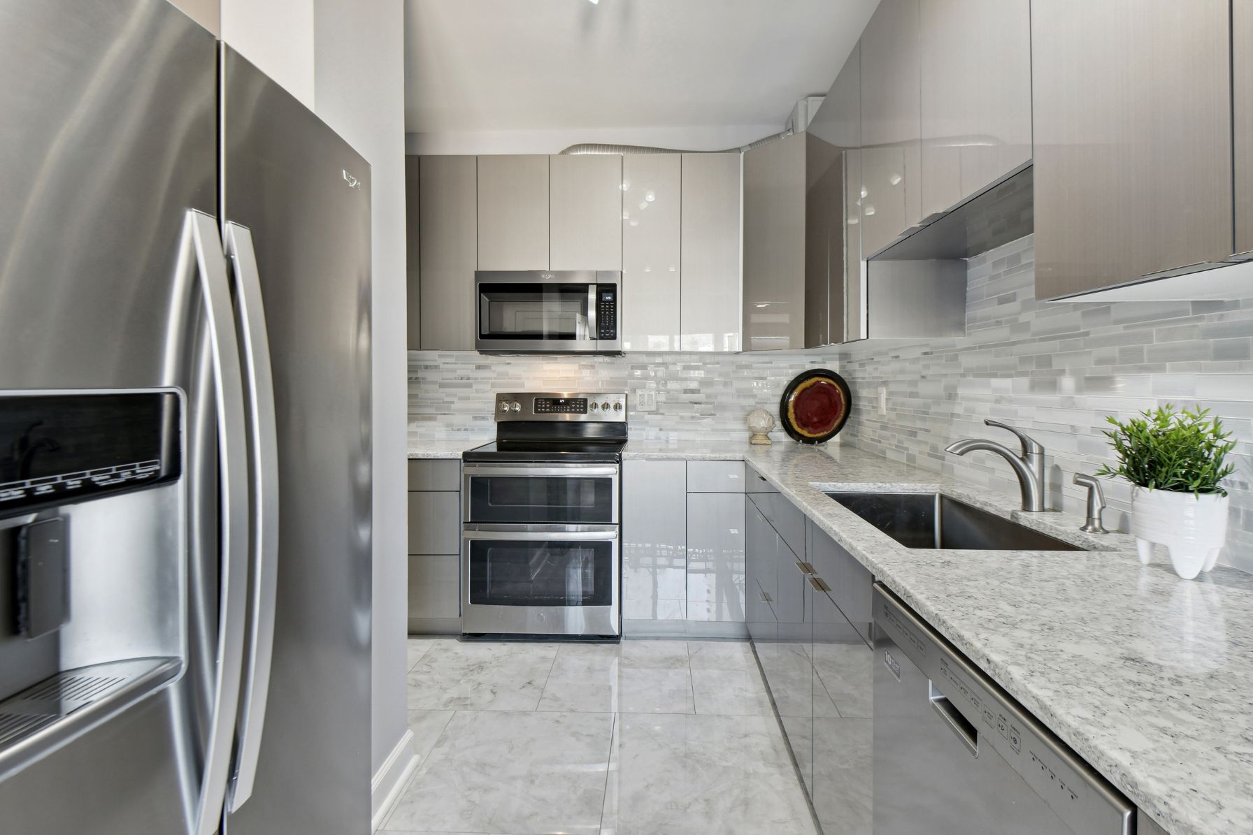 The kitchen is a chef’s dream with stainless steel appliances, including a double oven, Thomasville slab-style acrylic cabinets with soft-close doors, slide-out trays in the pantry closet, and a convenient “Lazy Susan” in the corner cabinet. The quartz countertops, 32″ Ruvati double sink, and mosaic glass backsplash create an elegant and modern feel. The porcelain tile flooring adds a touch of sophistication to this culinary masterpiece.