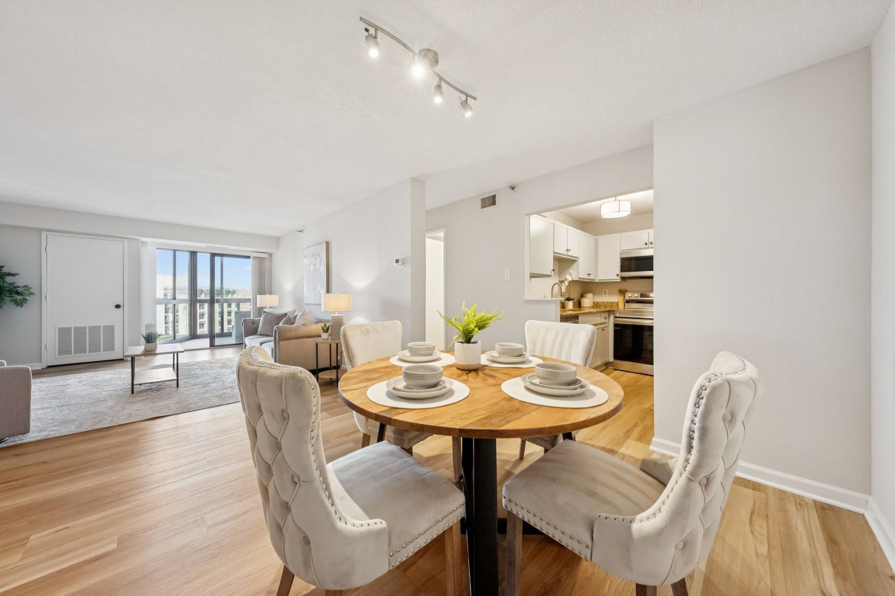 Experience unmatched convenience in this beautifully renovated 2-bedroom condo at The Altavista, perched directly above the Ballston Metro. Step inside to find brand-new luxury vinyl flooring that flows through a bright, open living area with a dedicated dining space. Sliding glass doors lead to a spacious sunroom with western exposure, perfect for relaxing or entertaining. The kitchen features freshly custom-painted cabinetry with sleek black hardware and brand-new stainless steel LG appliances.