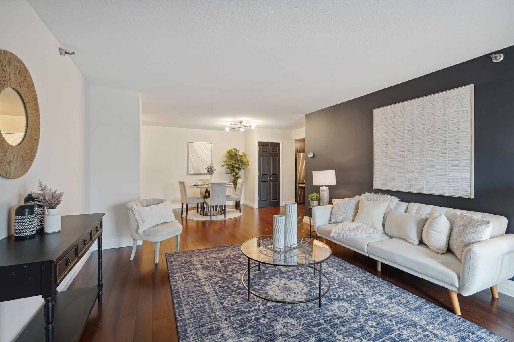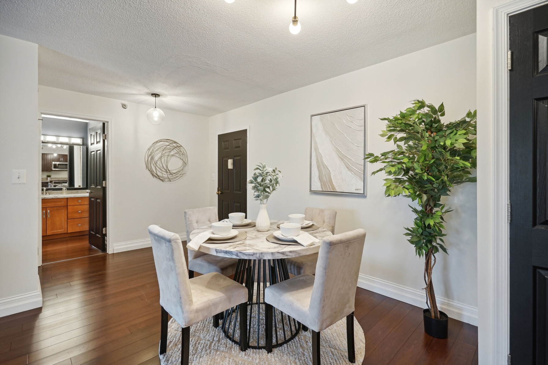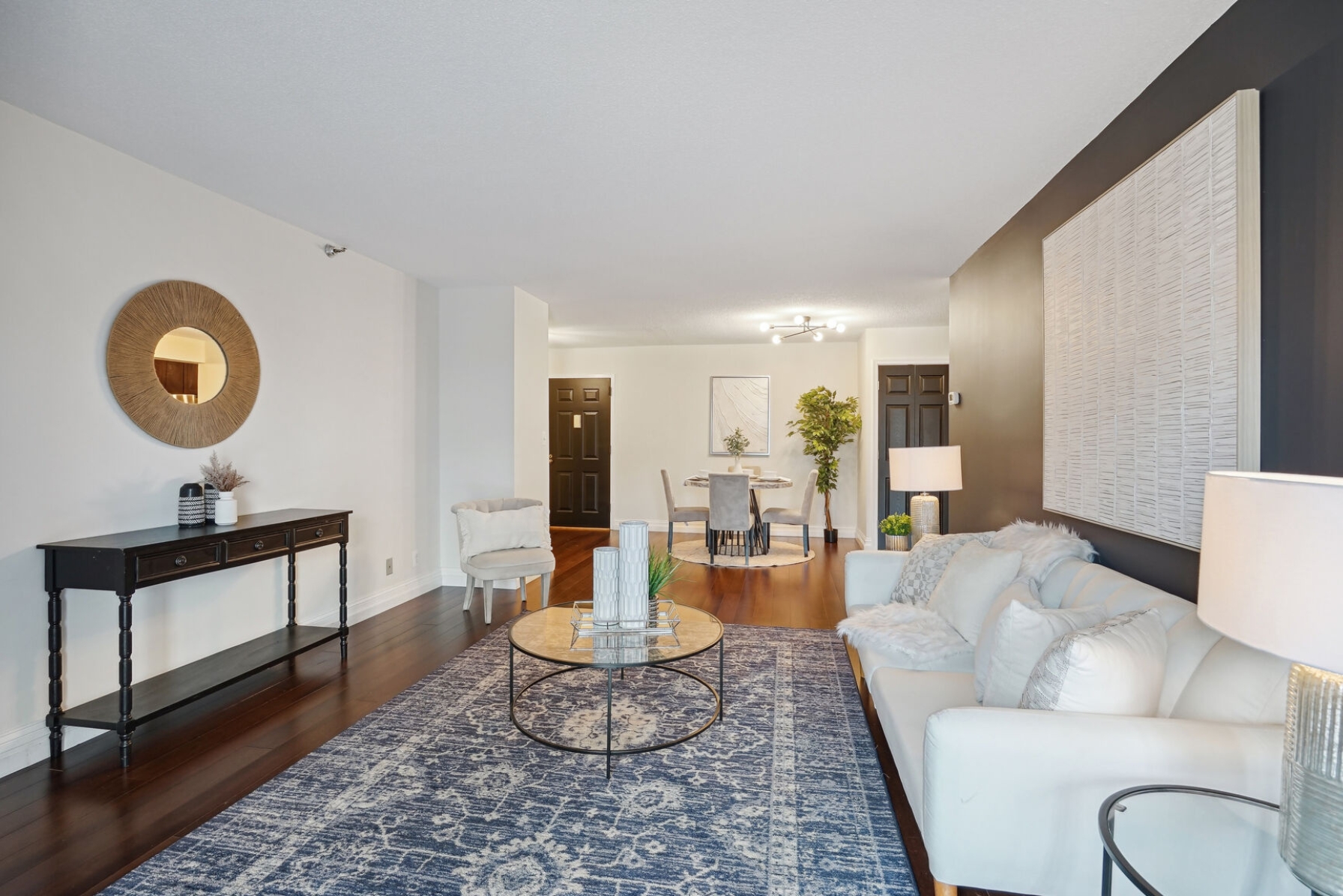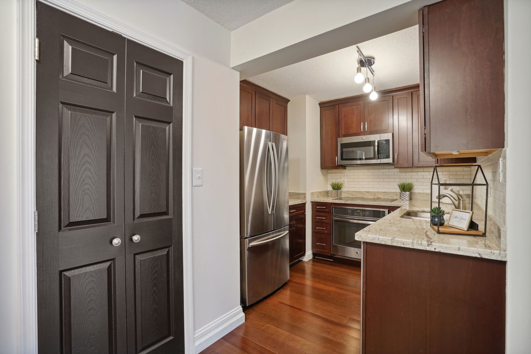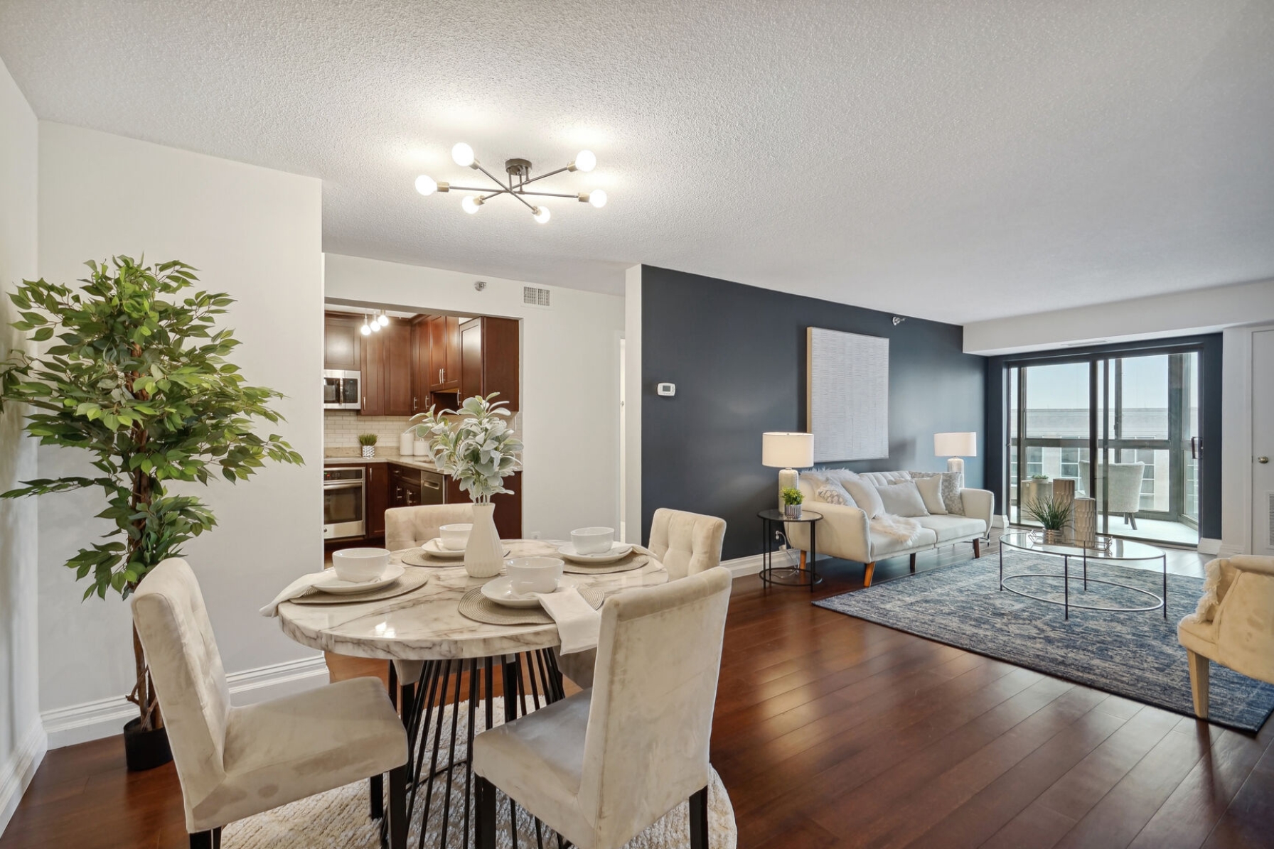 Unit 1703 at the Altavista has undergone a recent renovation featuring gorgeous espresso hardwood floors that span the entire main living area. A separate dining space to the left flows to a spacious living room with a blue accent wall and sliding glass doors that open to a 17th-floor sunroom. The kitchen was thoughtfully updated, showcasing new maple cabinets, granite counters, and a suite of stainless-steel appliances including a cooktop and separate wall oven. The entire unit has been updated with modern lighting and custom paint giving this condo a contemporary feel.