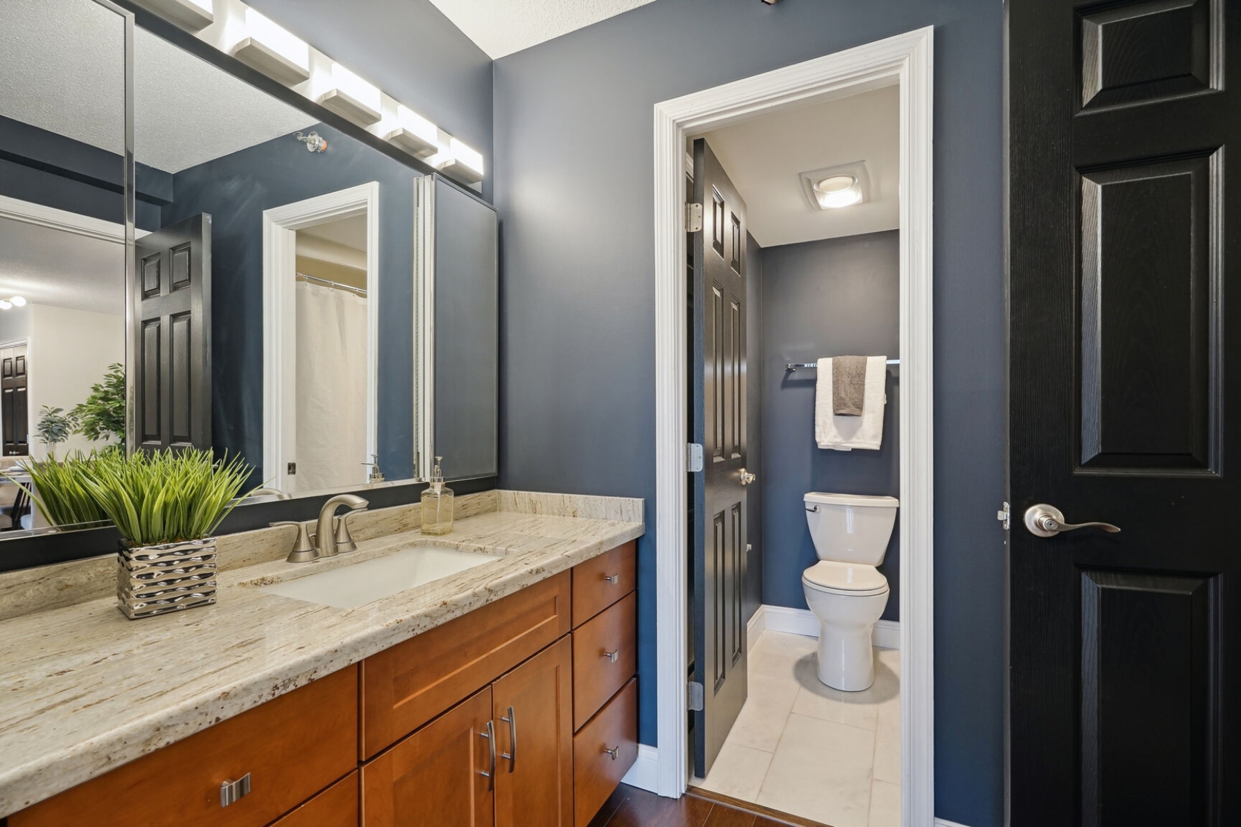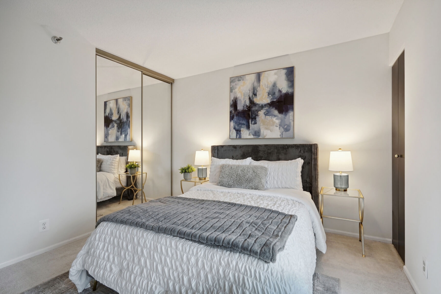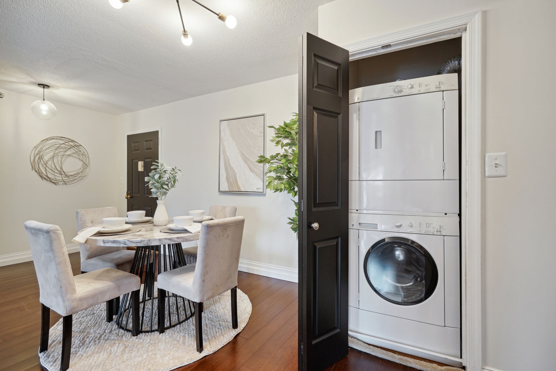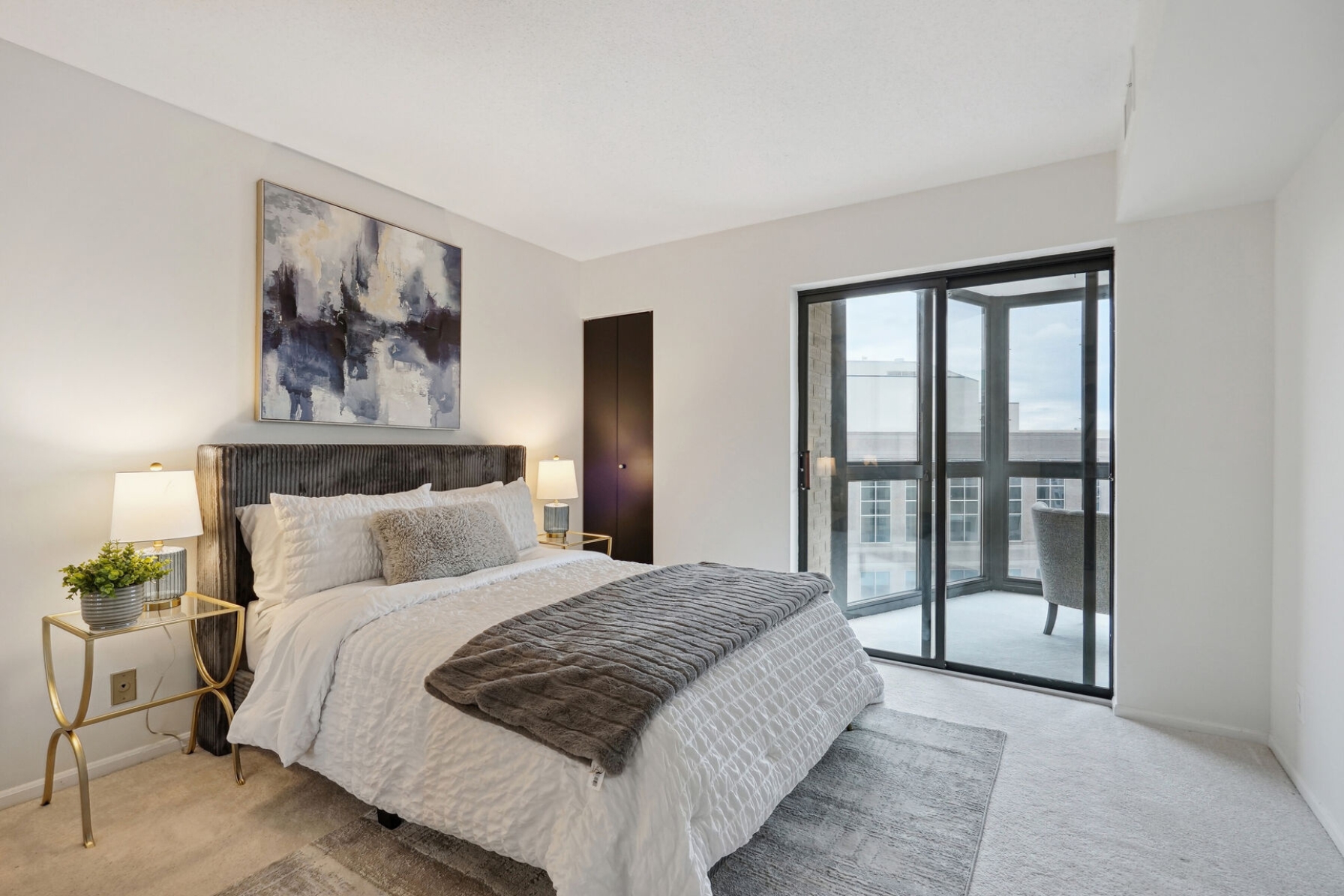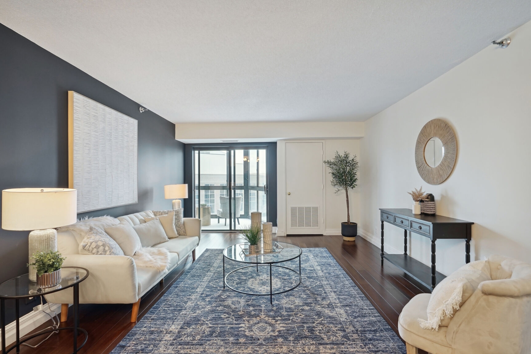 Unit 1703 at the Altavista has undergone a recent renovation featuring gorgeous espresso hardwood floors that span the entire main living area. A separate dining space to the left flows to a spacious living room with a blue accent wall and sliding glass doors that open to a 17th-floor sunroom. The kitchen was thoughtfully updated, showcasing new maple cabinets, granite counters, and a suite of stainless-steel appliances including a cooktop and separate wall oven. The entire unit has been updated with modern lighting and custom paint giving this condo a contemporary feel.