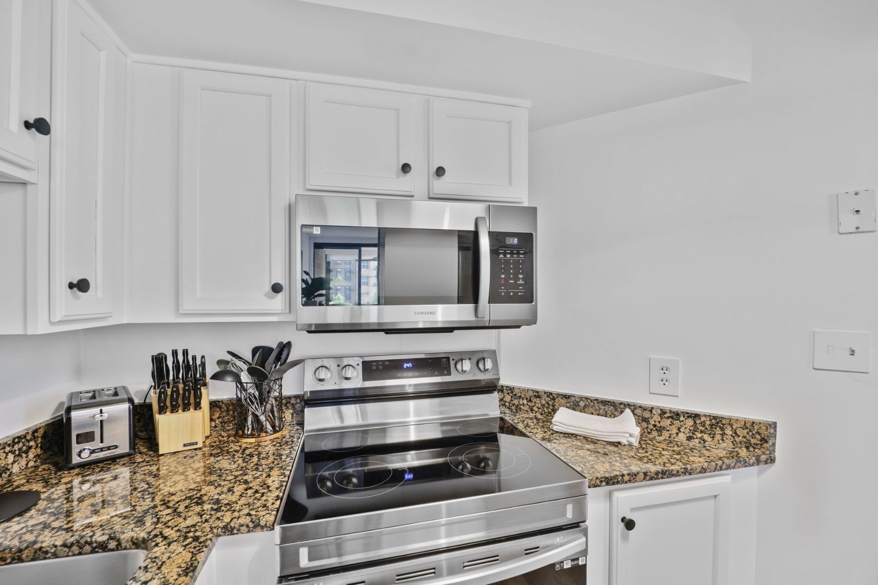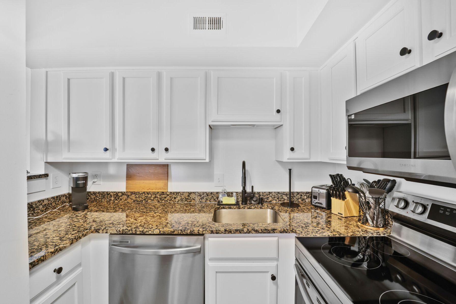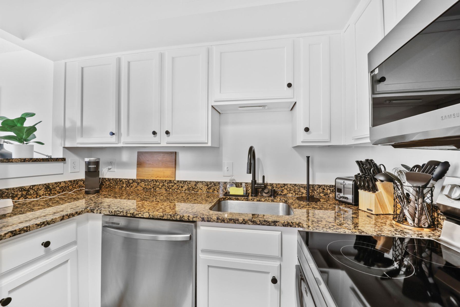 The kitchen is both stylish and functional, featuring granite countertops, white cabinetry with bold black hardware, stainless steel Samsung appliances, and a convenient pass-through to the living area—perfect for entertaining.