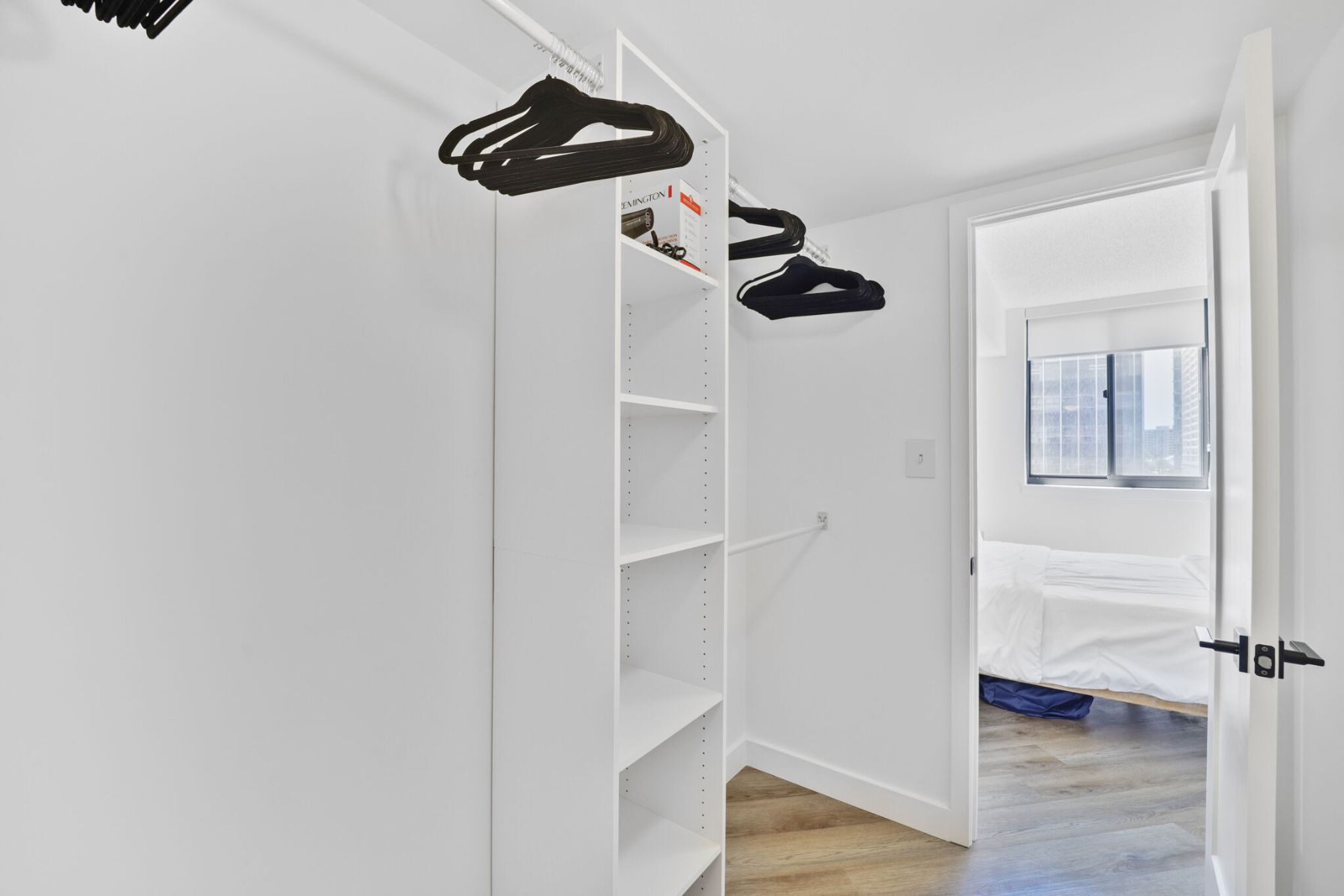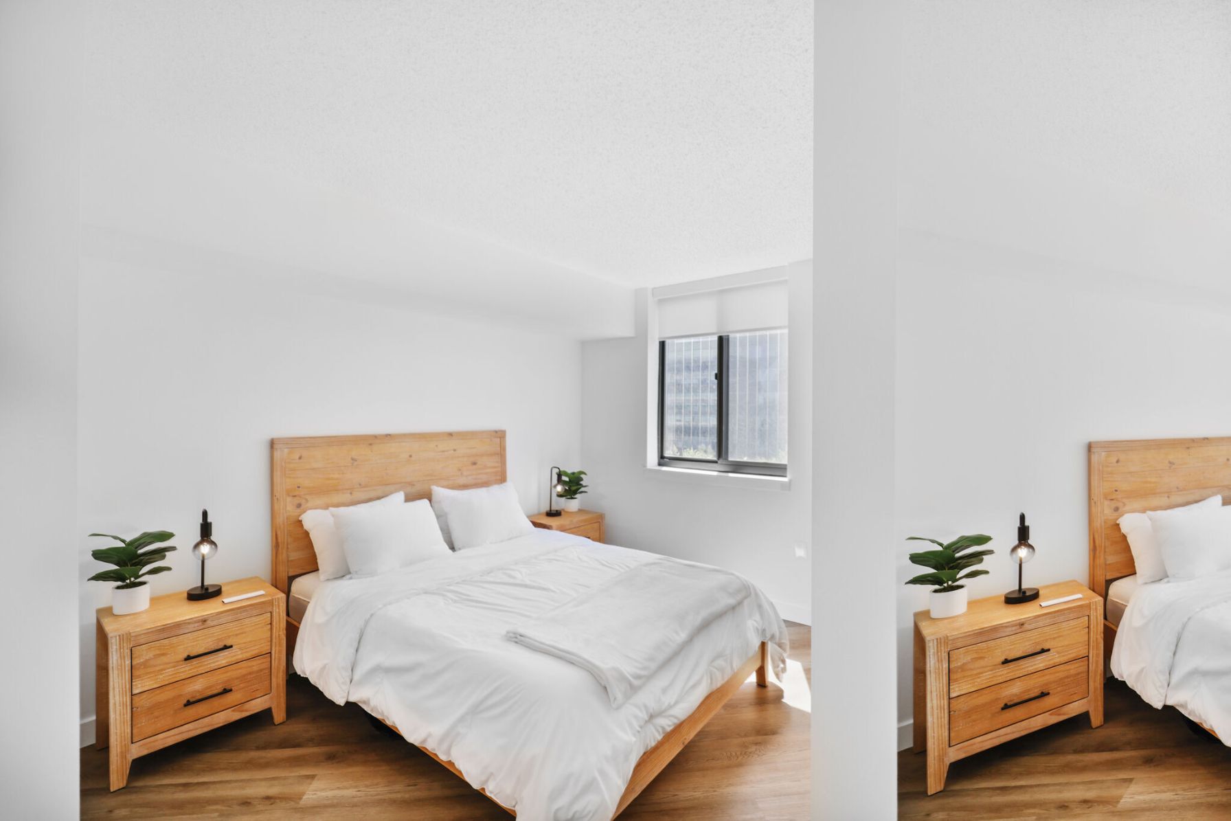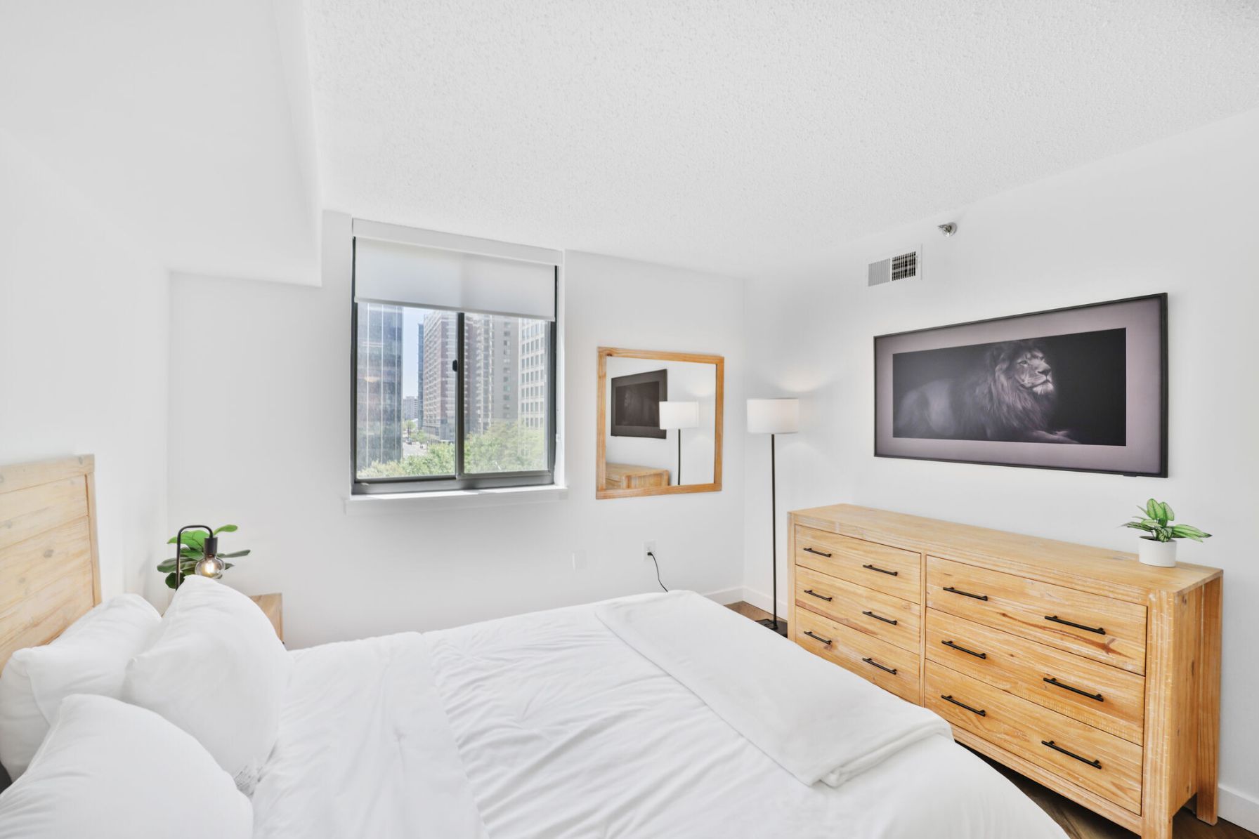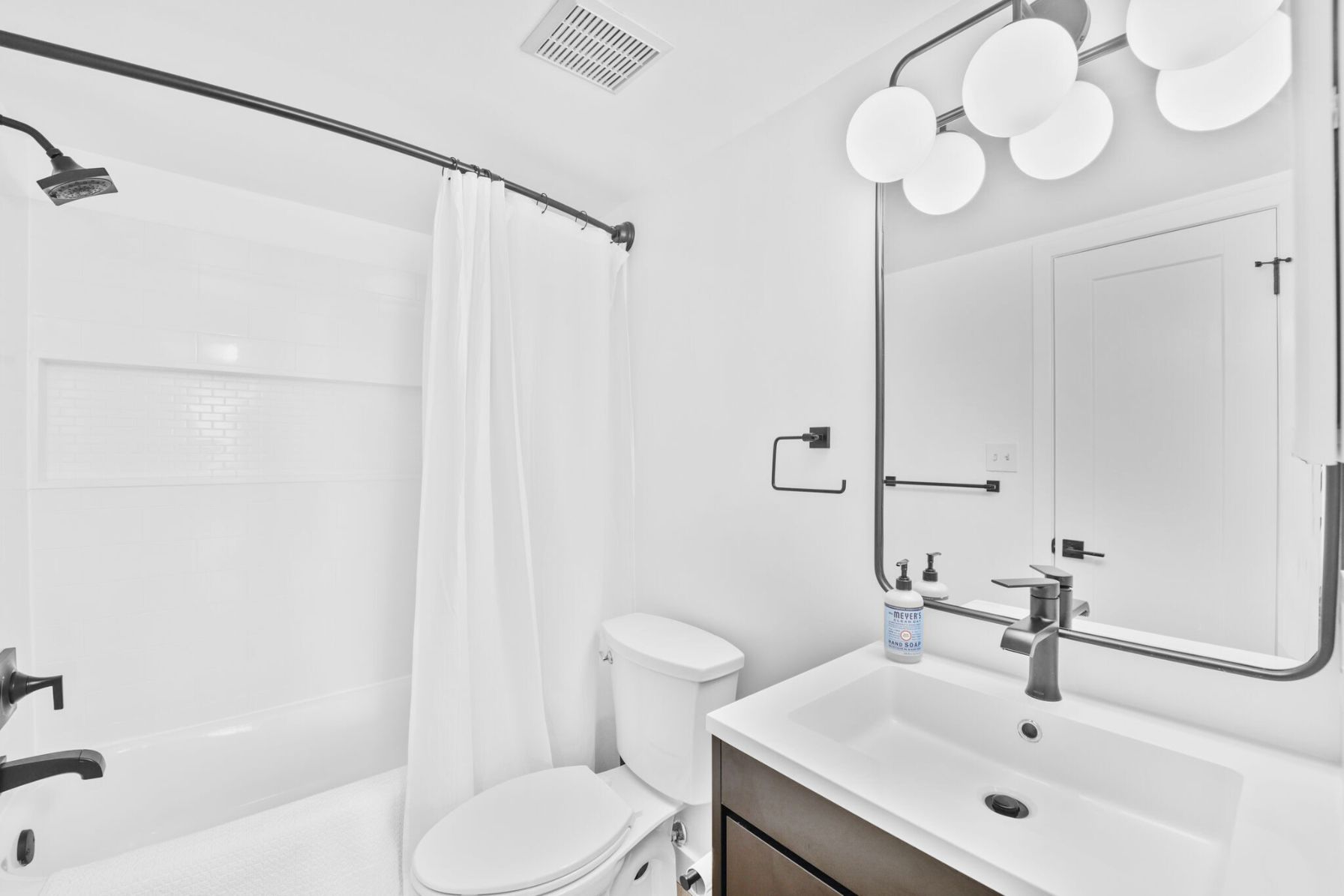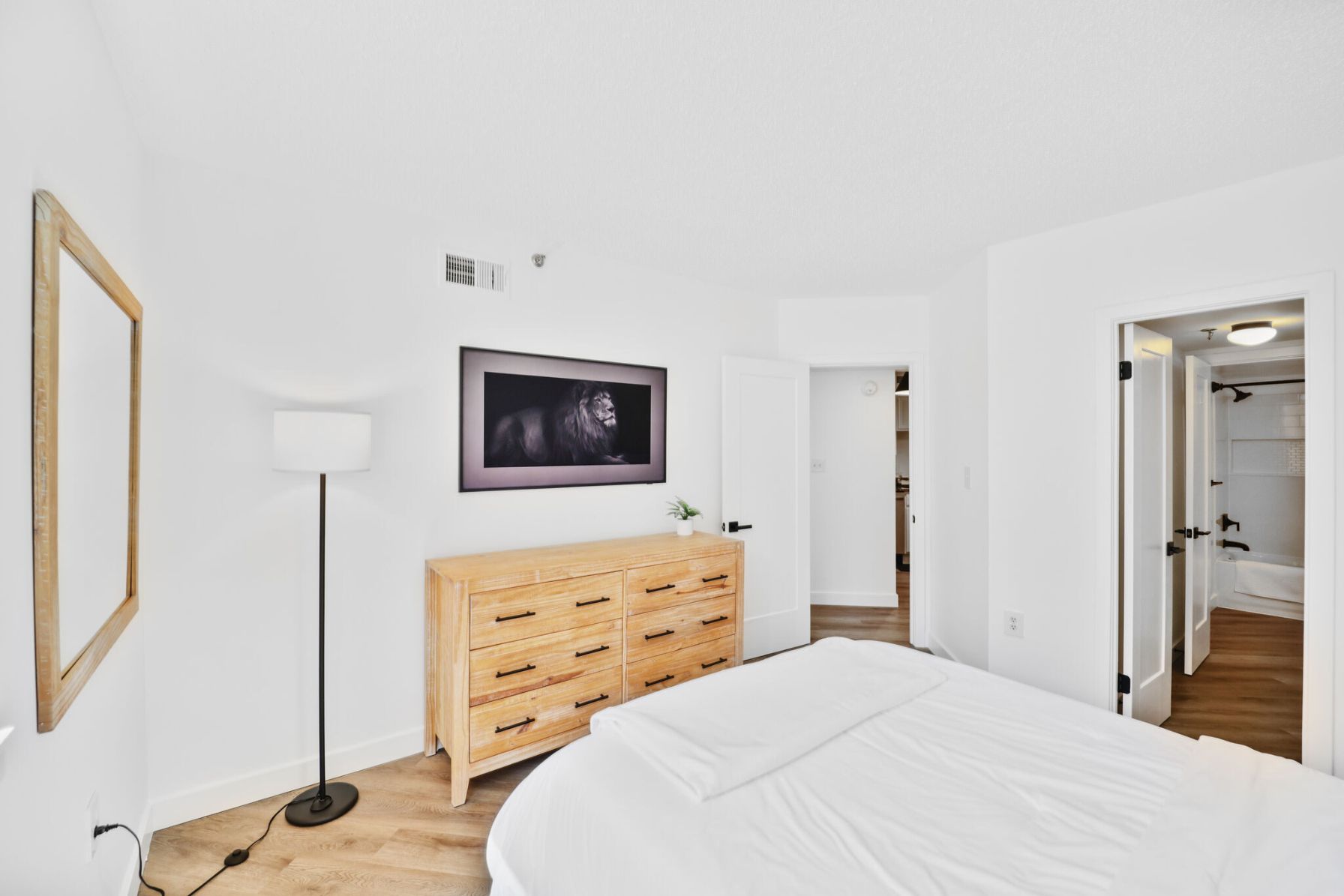 The south-facing bedroom offers peaceful retreat vibes and comes fully furnished. A generous walk-through closet connects to a beautifully updated dual-entry bathroom, complete with a white tile tub surround with a statement inlay, black fixtures, a modern vanity with white quartz countertop, a bold black-framed mirror, and a striking light fixture.