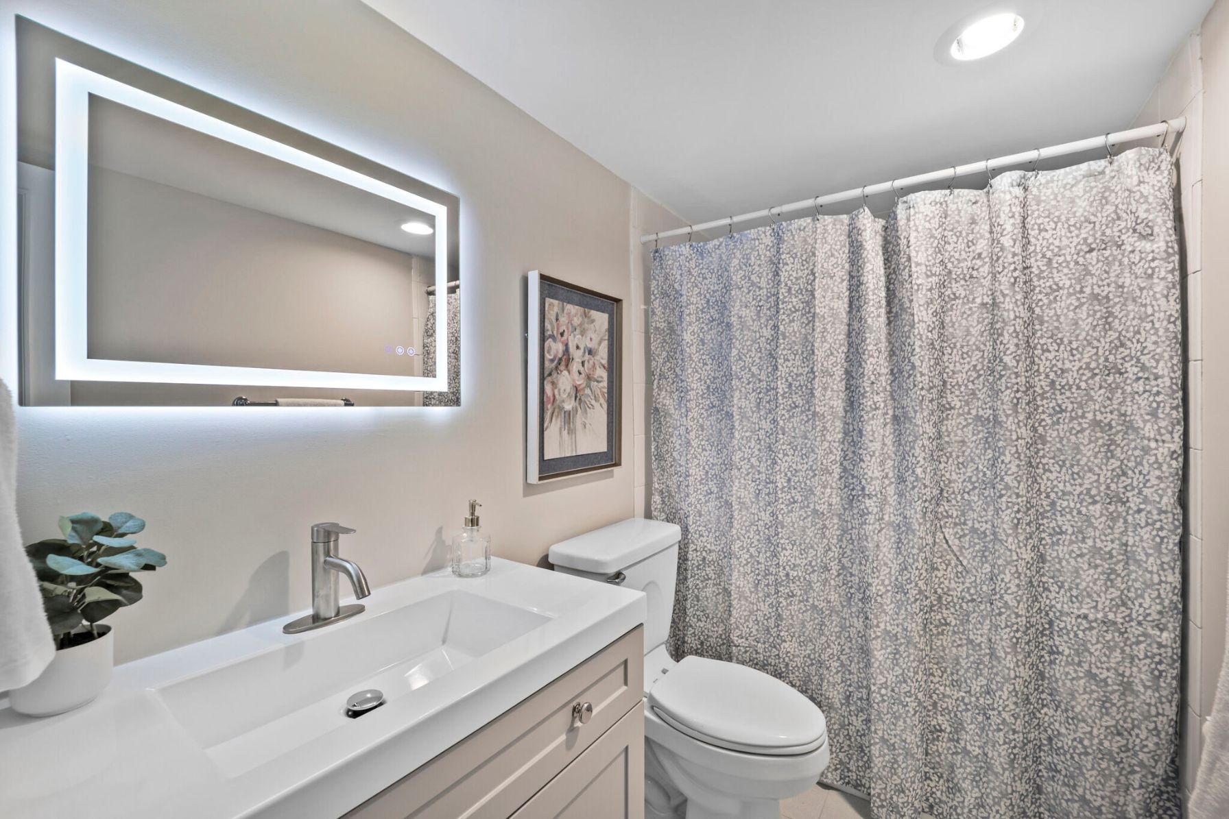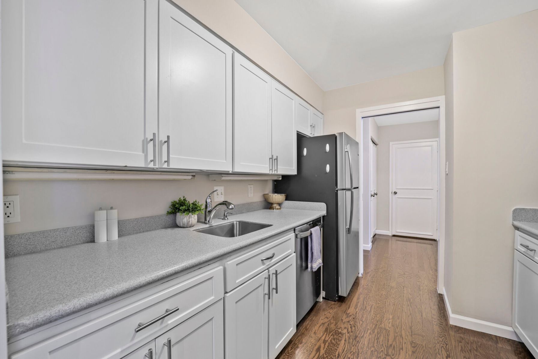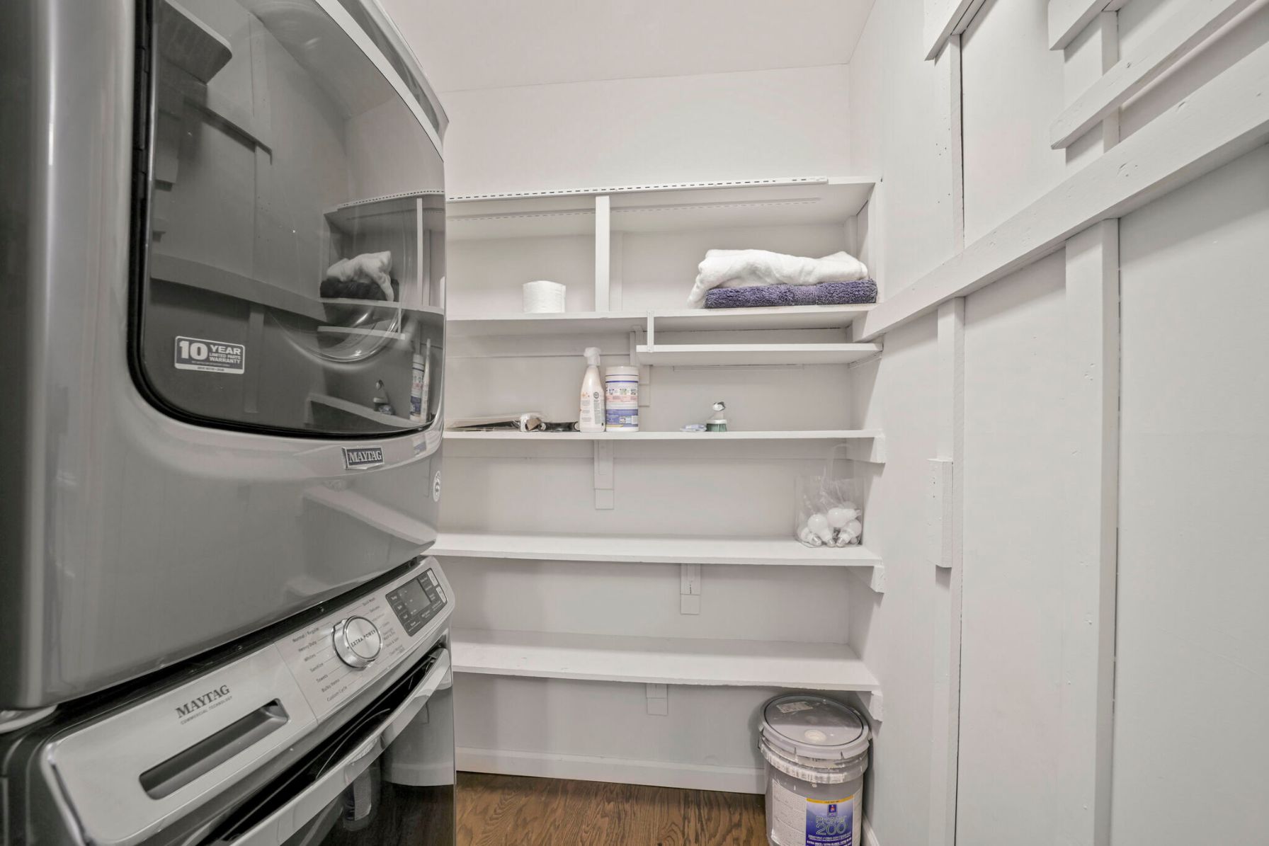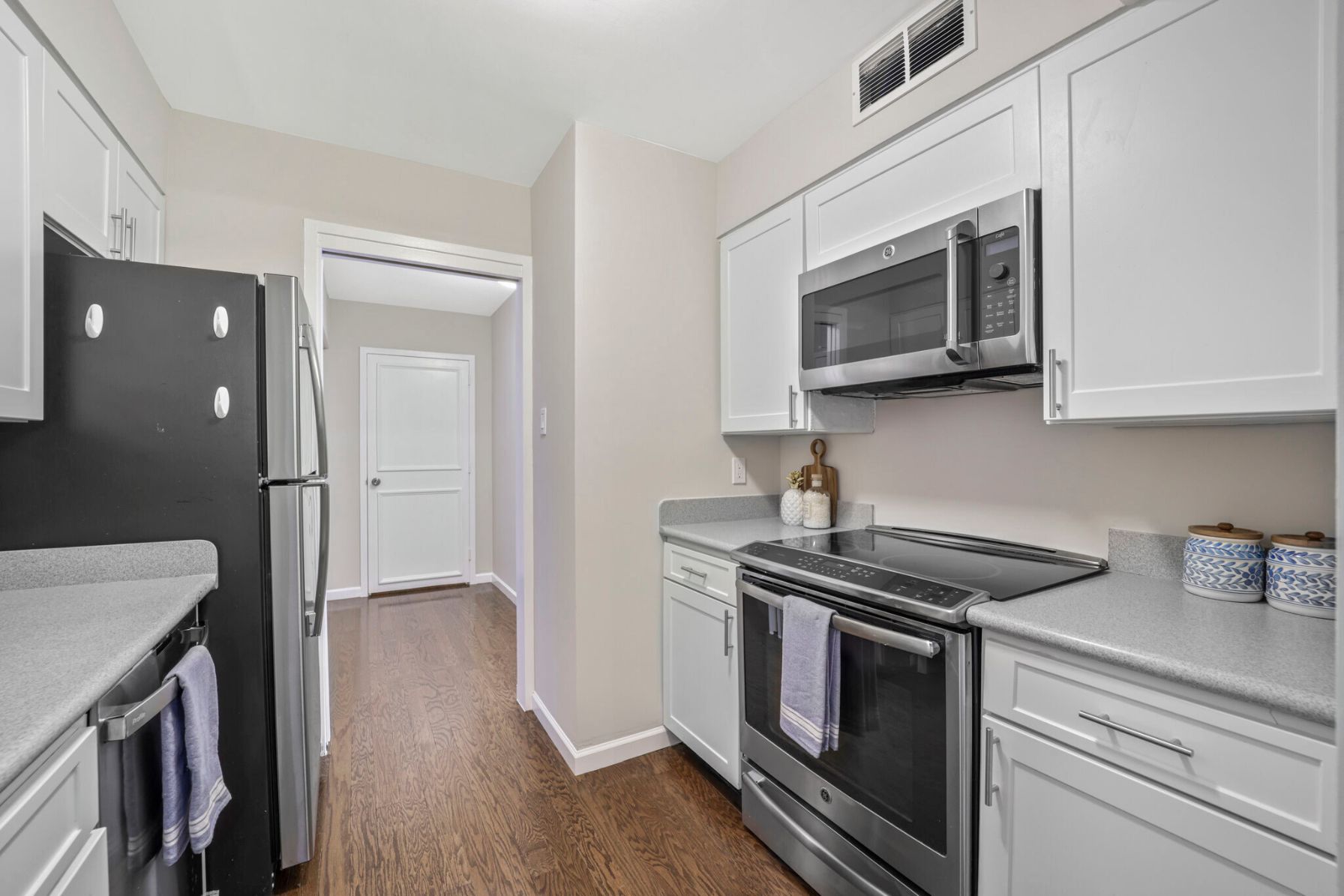 The kitchen is both stylish and functional, equipped with stainless steel appliances, gas cooking, and gray Corian countertops. The large, south-facing bedroom (14′ x 16′) boasts abundant closet space and easy access to the full bathroom just outside the door. You’ll also appreciate the full-size laundry room with ample storage and a stacked washer and dryer.