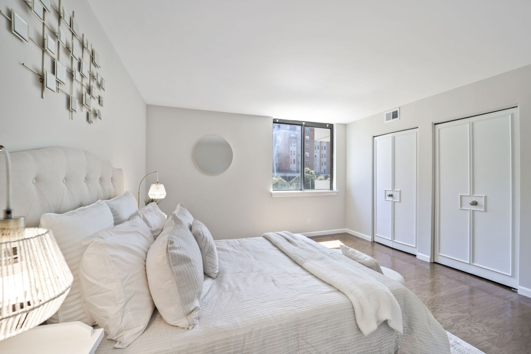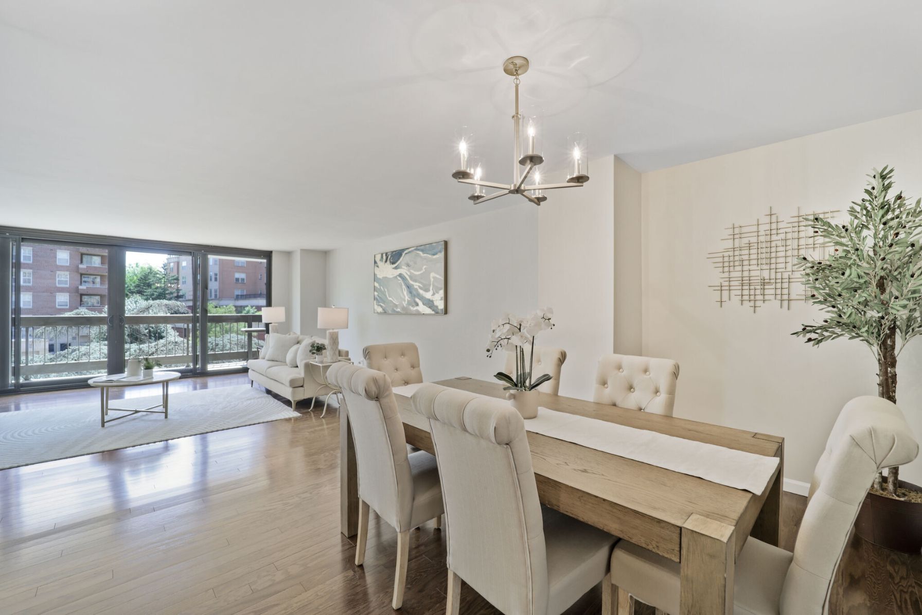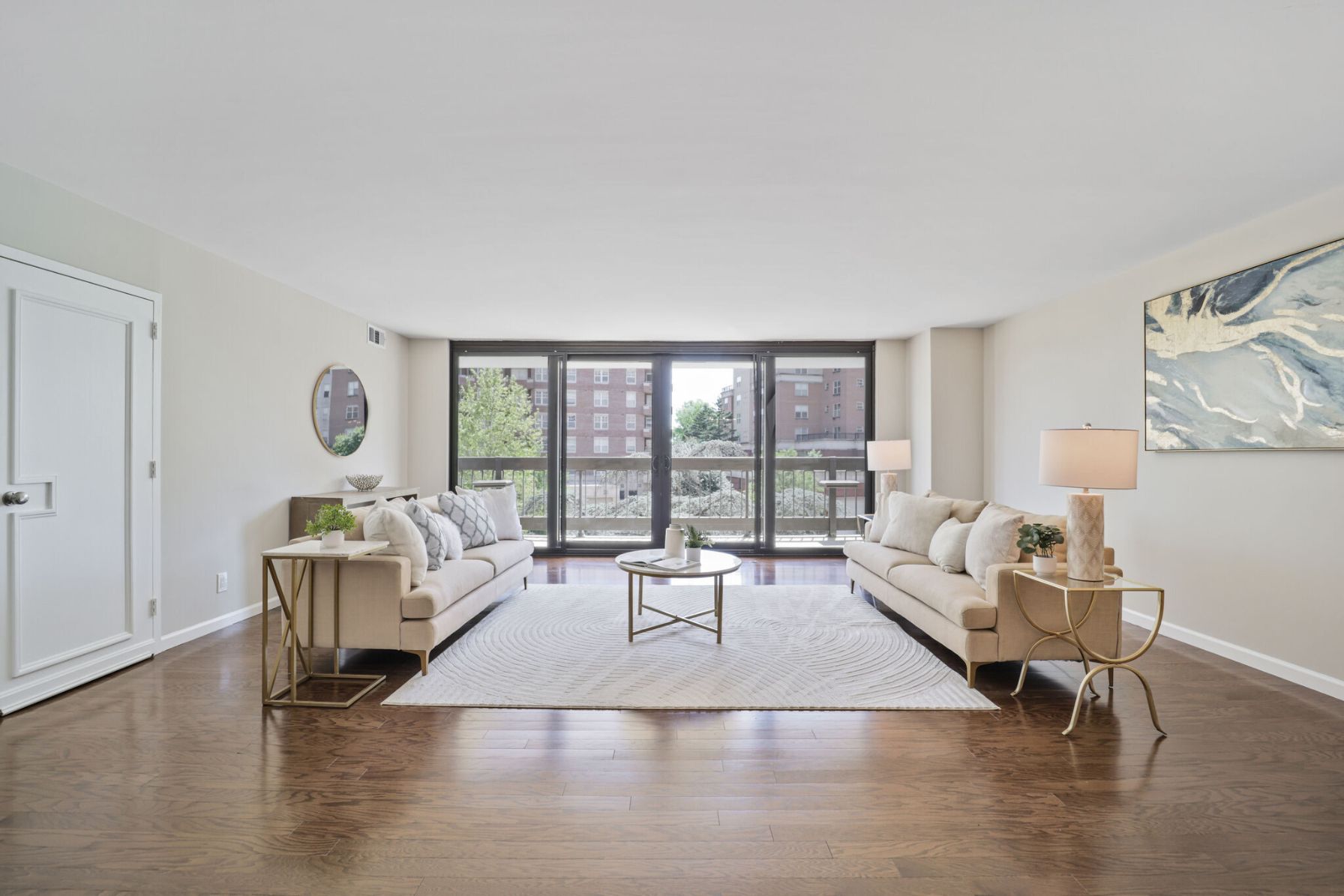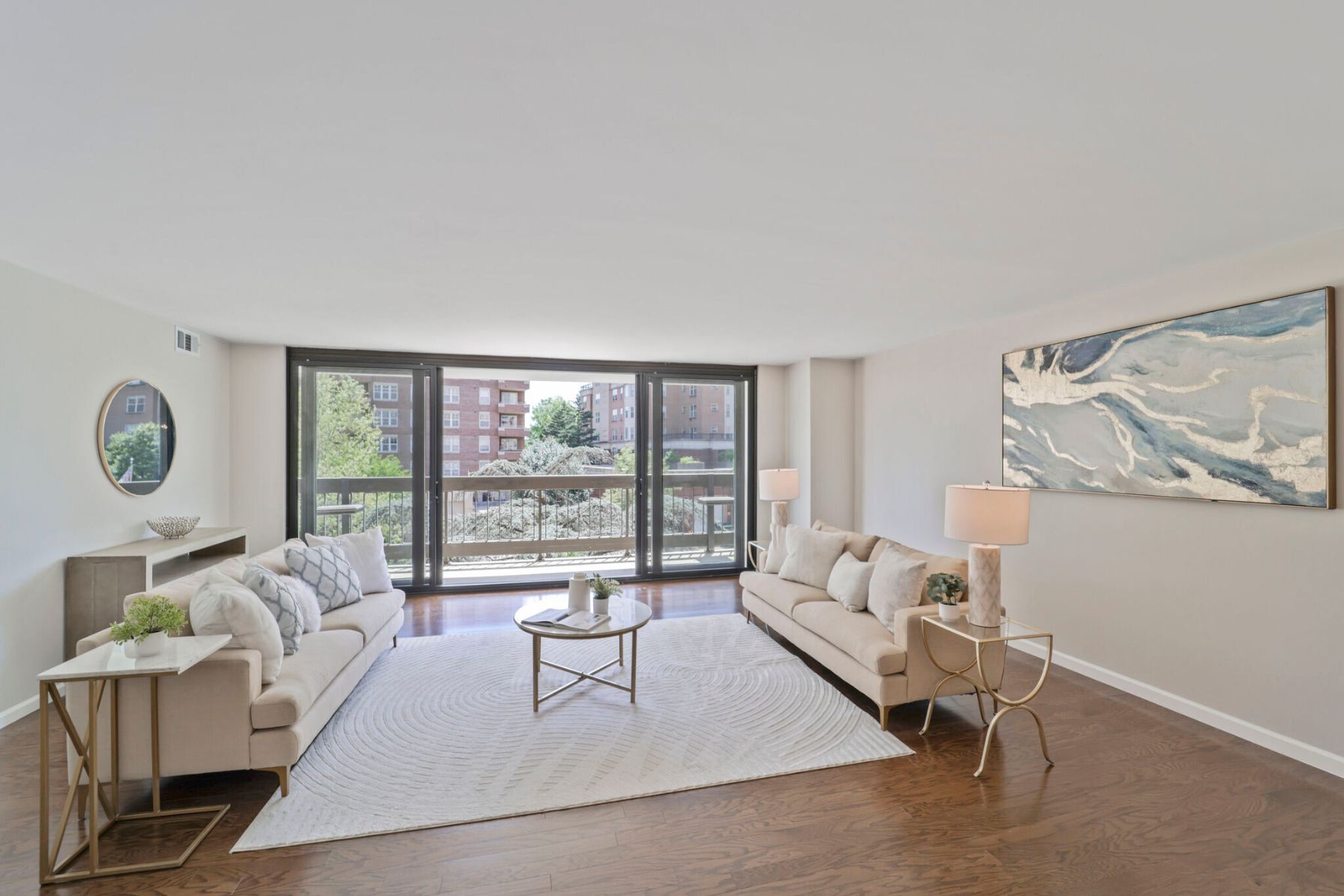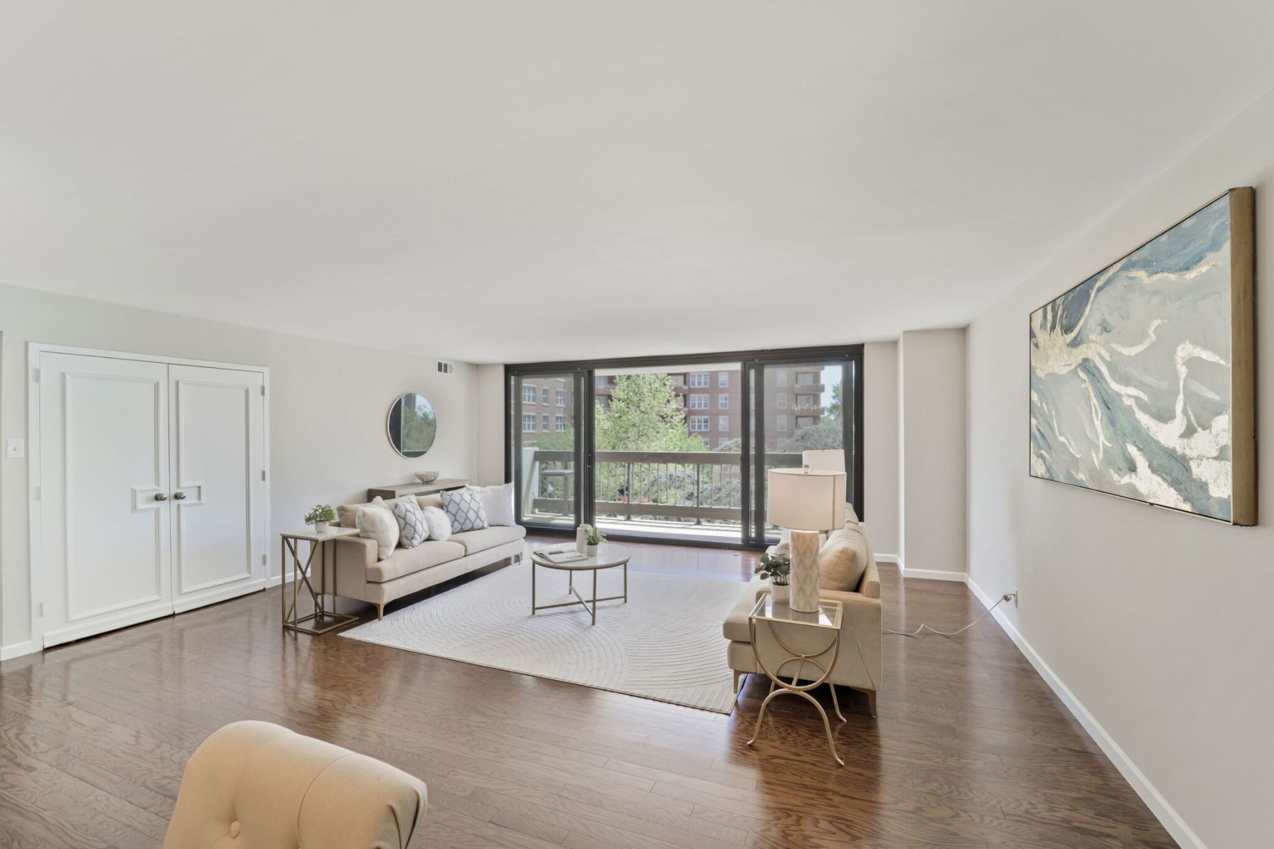 The brand-new hardwood floors and fresh paint create a warm, modern feel throughout. The oversized living room—an impressive 21′ x 20’—features a wall of glass that floods the space with natural light and opens to a private terrace with tranquil tree and park views along 9th Street. The layout flows seamlessly into a formal dining area, ideally positioned just off the kitchen.