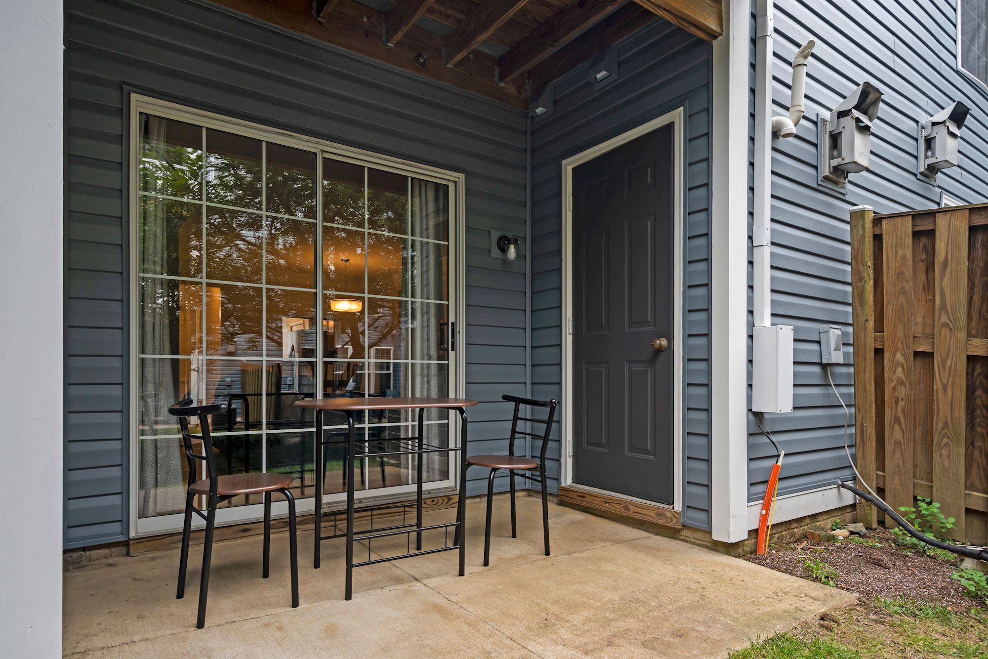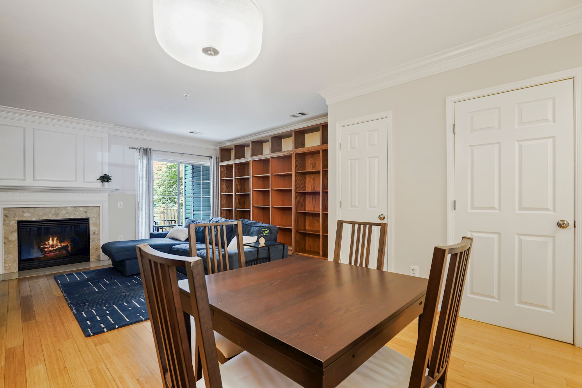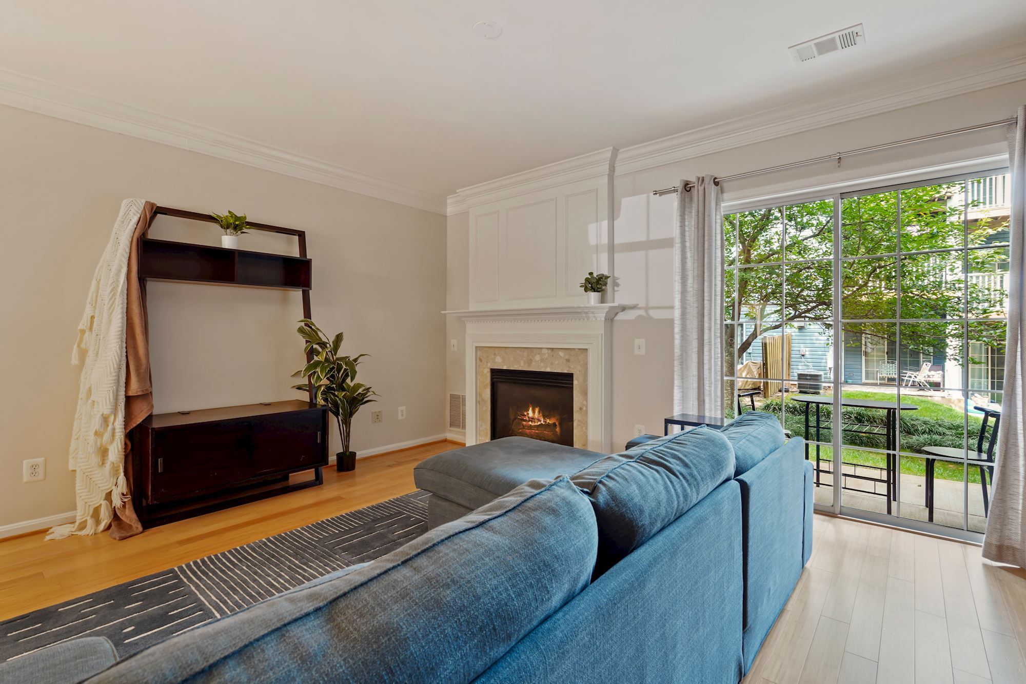 The front door & main living space are on the ground level w/ a private outdoor space on each floor. Walk into the large kitchen to the left with granite counters, stainless steel Frigidaire appliances, & room for a breakfast nook. There is a pass-through that leads to the separate dining space and flows into the living room with a gas fireplace, built-in bookshelves, hardwood floors throughout, & a half bath. Off of the living room is your private outdoor patio with room for a nice bistro table. The outdoor utility closet is adjacent to the patio and has room for extra storage.