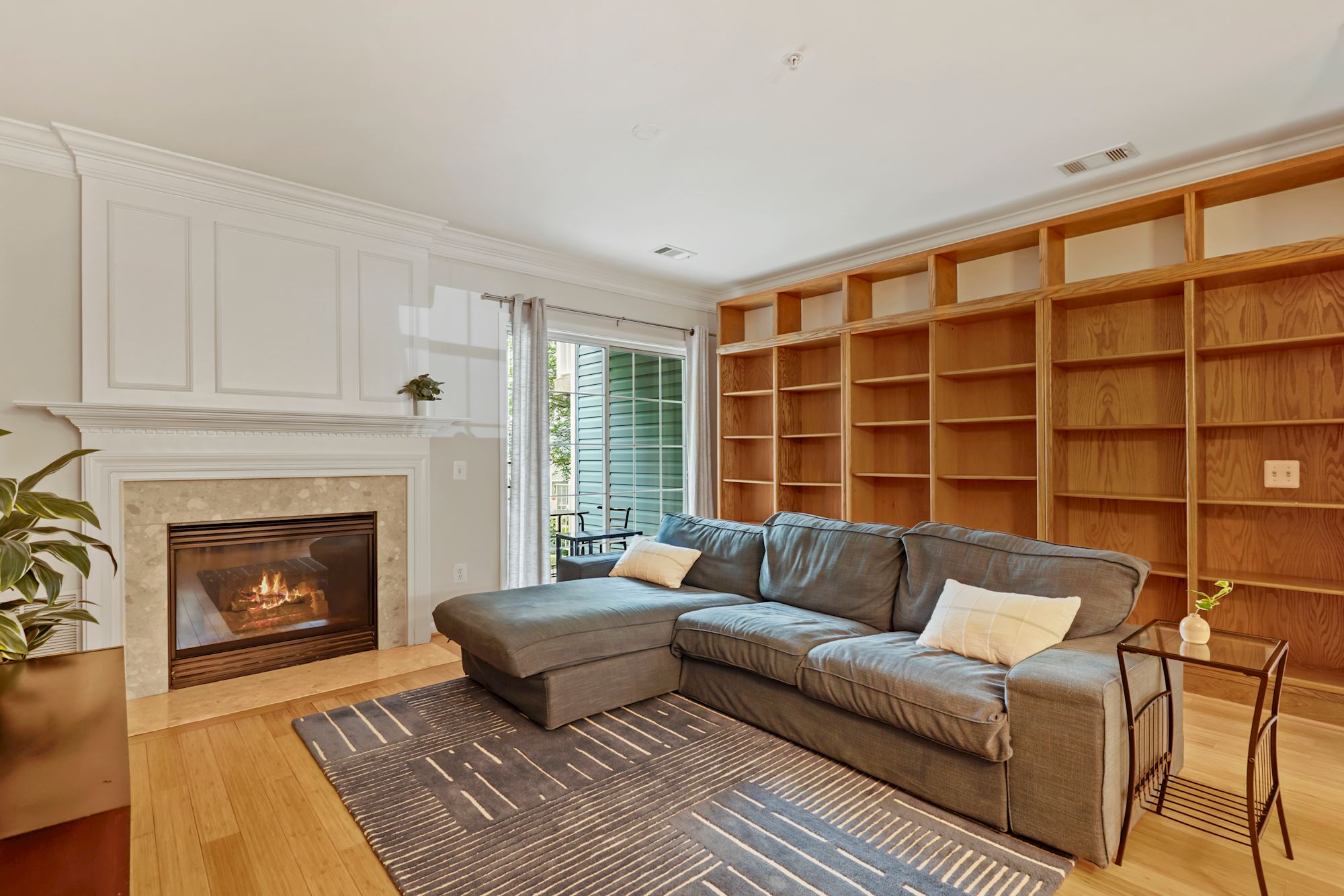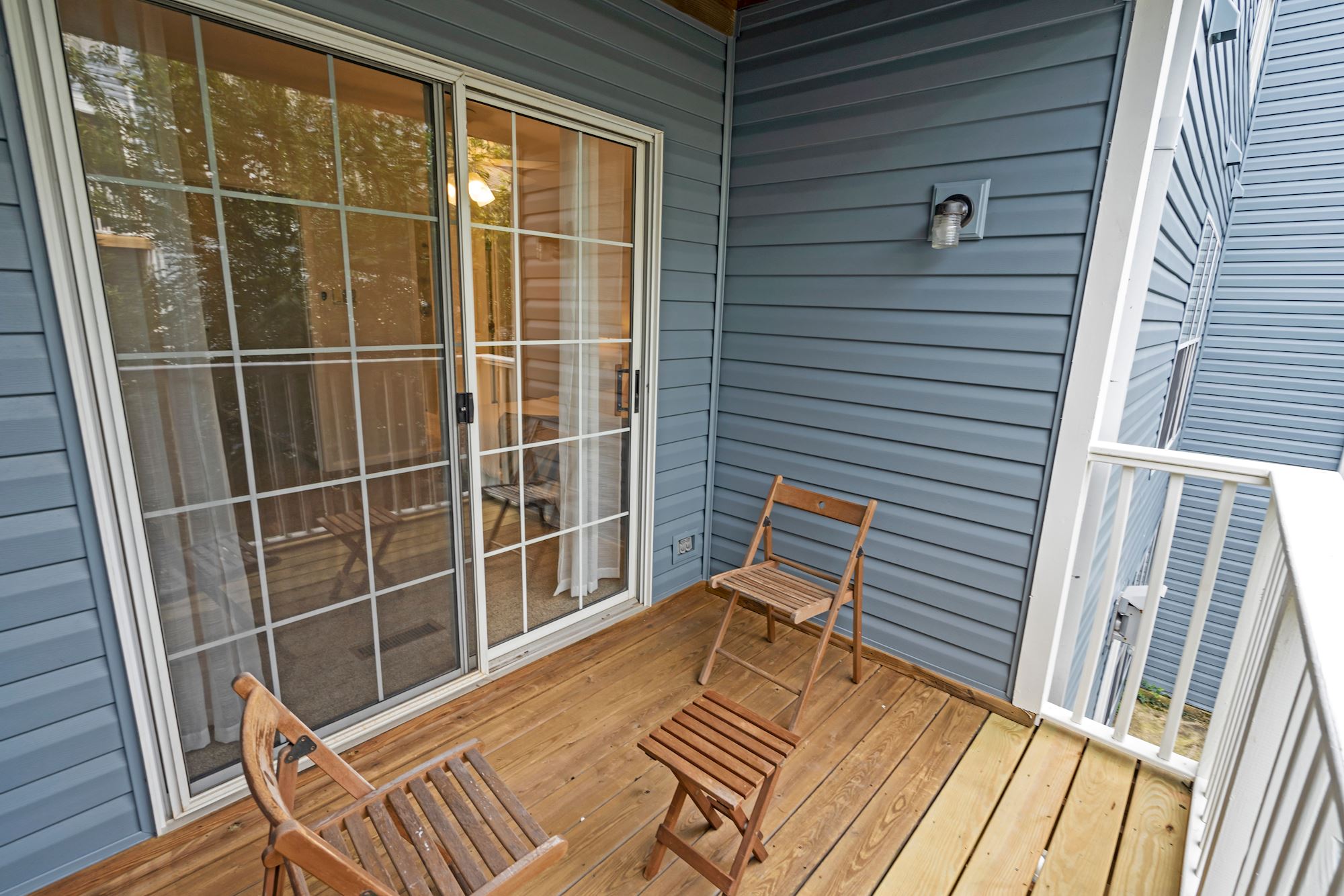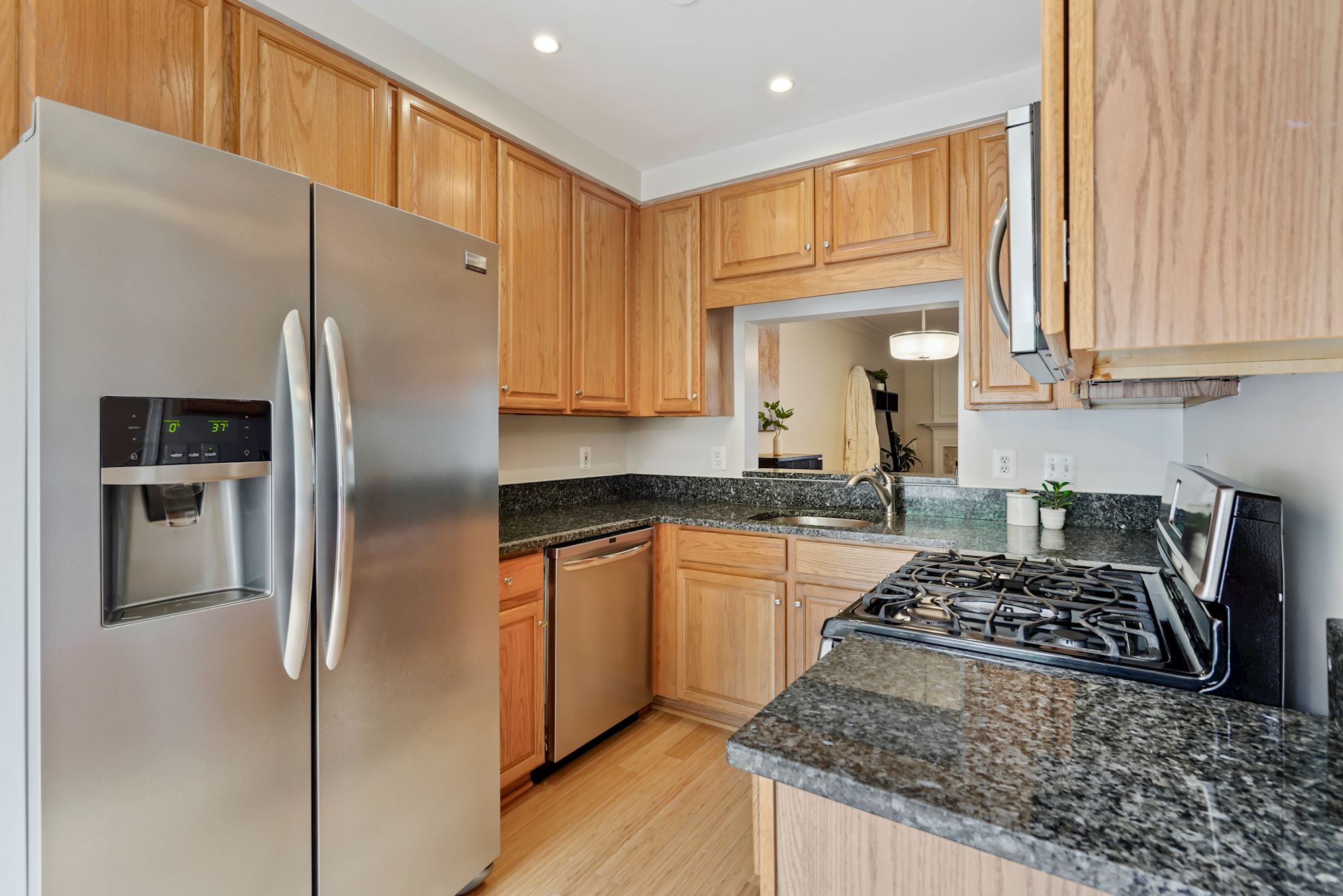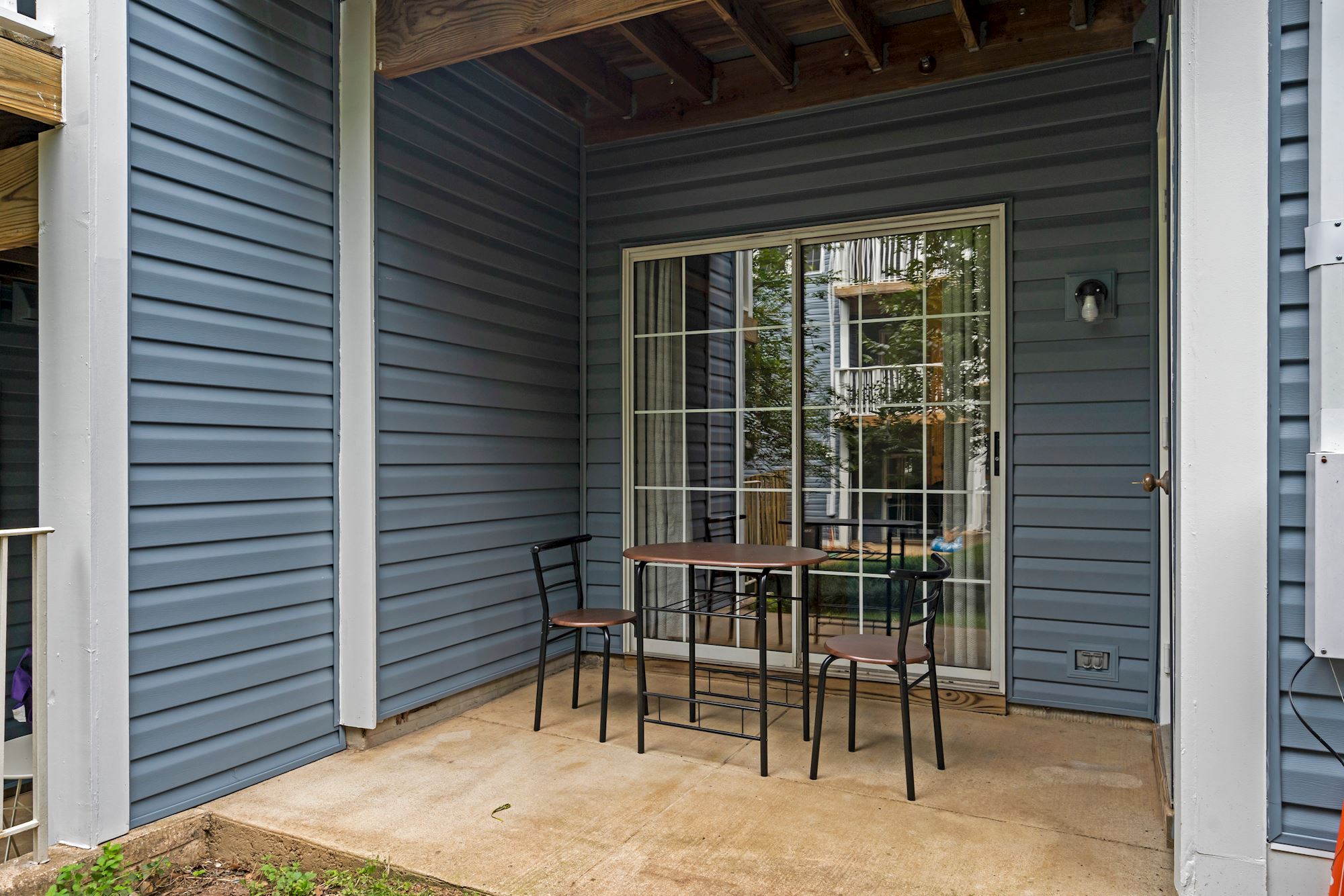 The front door & main living space are on the ground level w/ a private outdoor space on each floor. Walk into the large kitchen to the left with granite counters, stainless steel Frigidaire appliances, & room for a breakfast nook. There is a pass-through that leads to the separate dining space and flows into the living room with a gas fireplace, built-in bookshelves, hardwood floors throughout, & a half bath. Off of the living room is your private outdoor patio with room for a nice bistro table. The outdoor utility closet is adjacent to the patio and has room for extra storage.