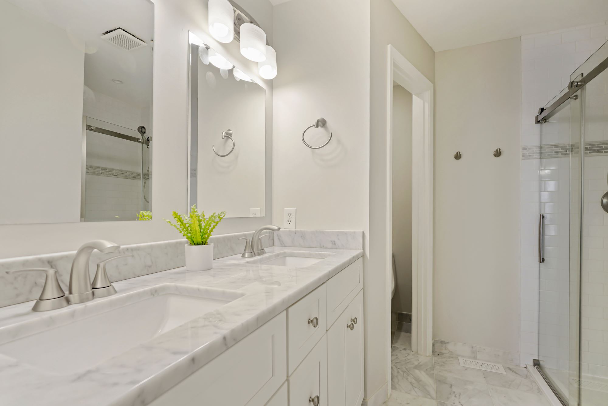 Updated Primary Bath w/ Carrara Marble Dual Vanity, Large Walk-in Shower